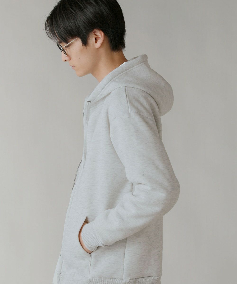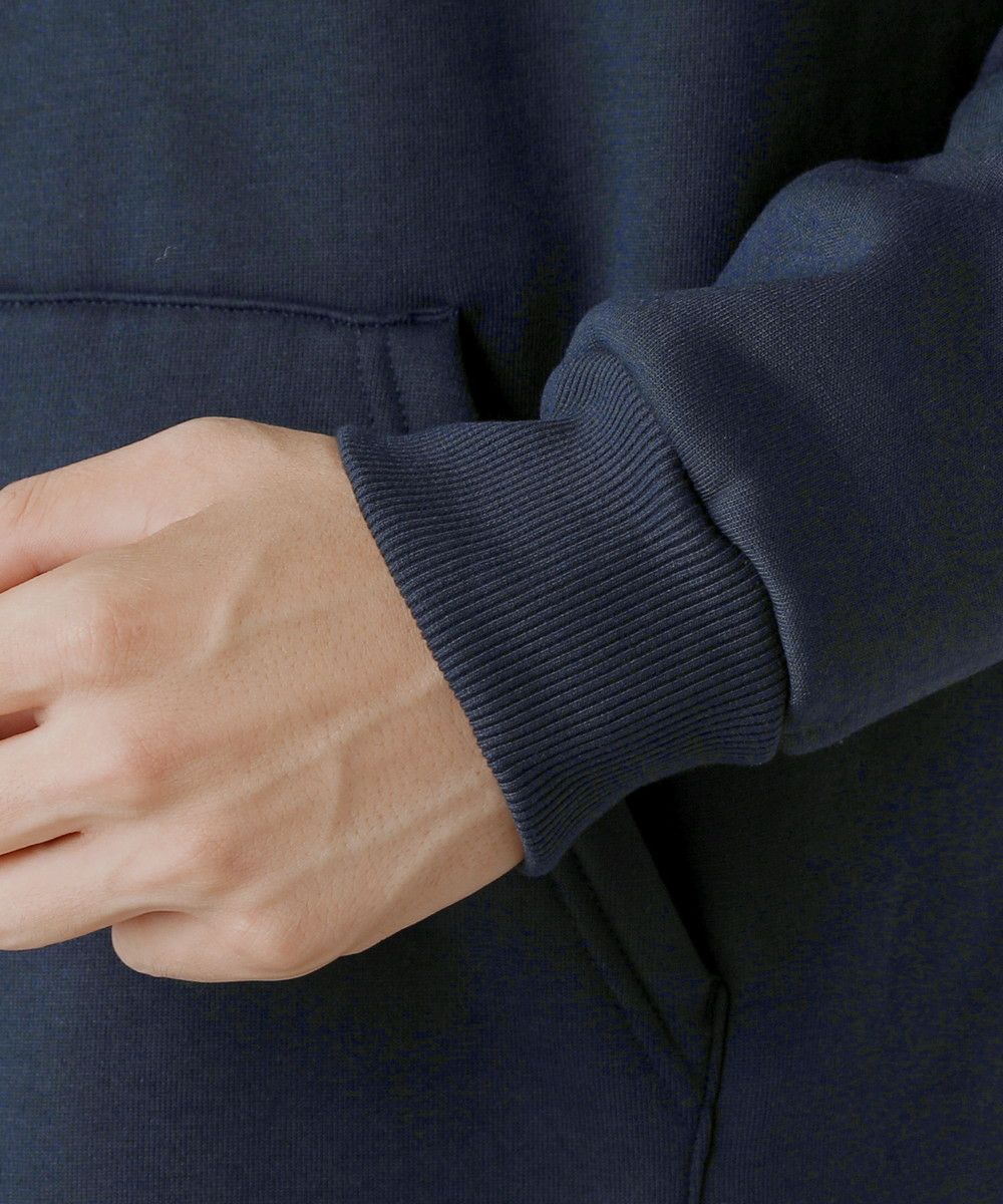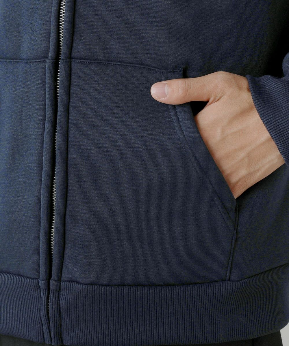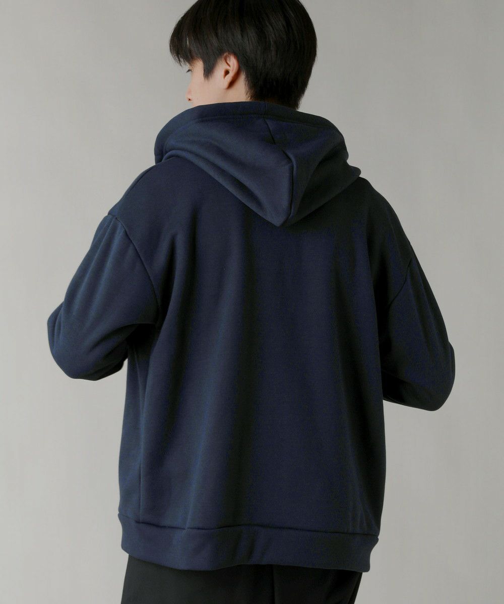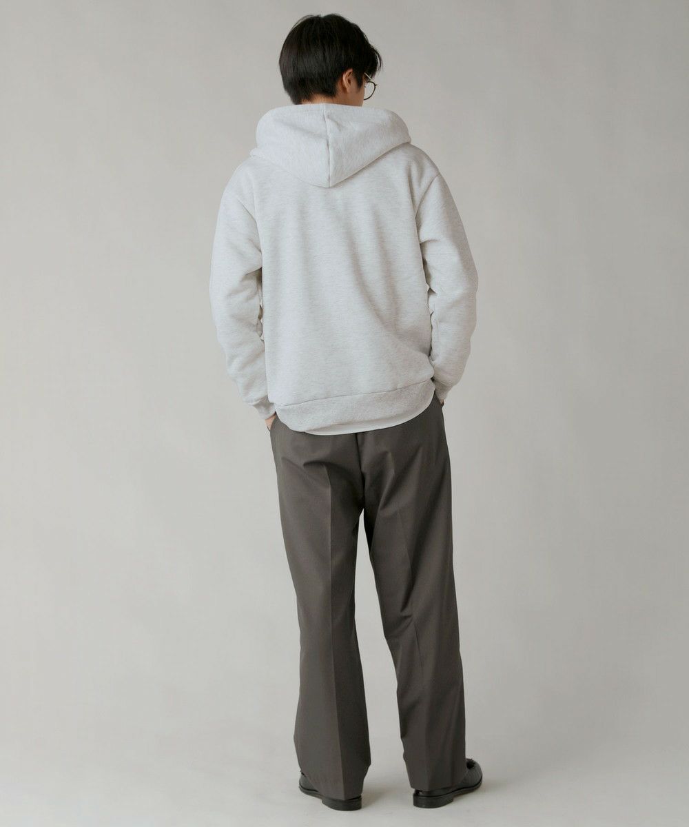 表面は通常のスウェット生地の見た目でありながら裏面はモコモコのボア状になっている、裏ボアスウェット生地を用いました。ボアによって内側に空気の層が作られ、暖かさが維持されます。ポリエステル100%なのでボアの厚みに反して軽量で、楽に着続けられる生地です。同素材で、デイリーユースに適した