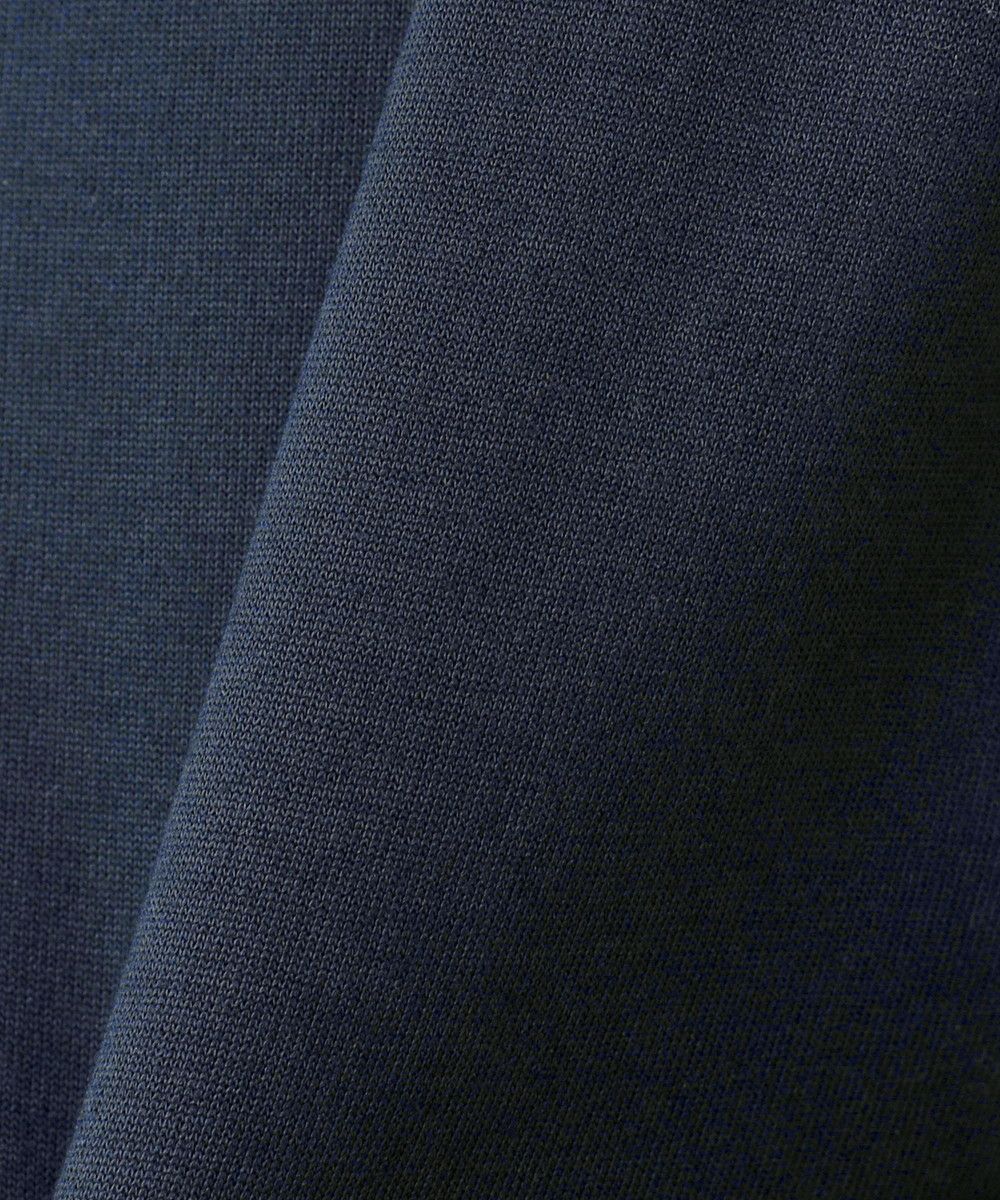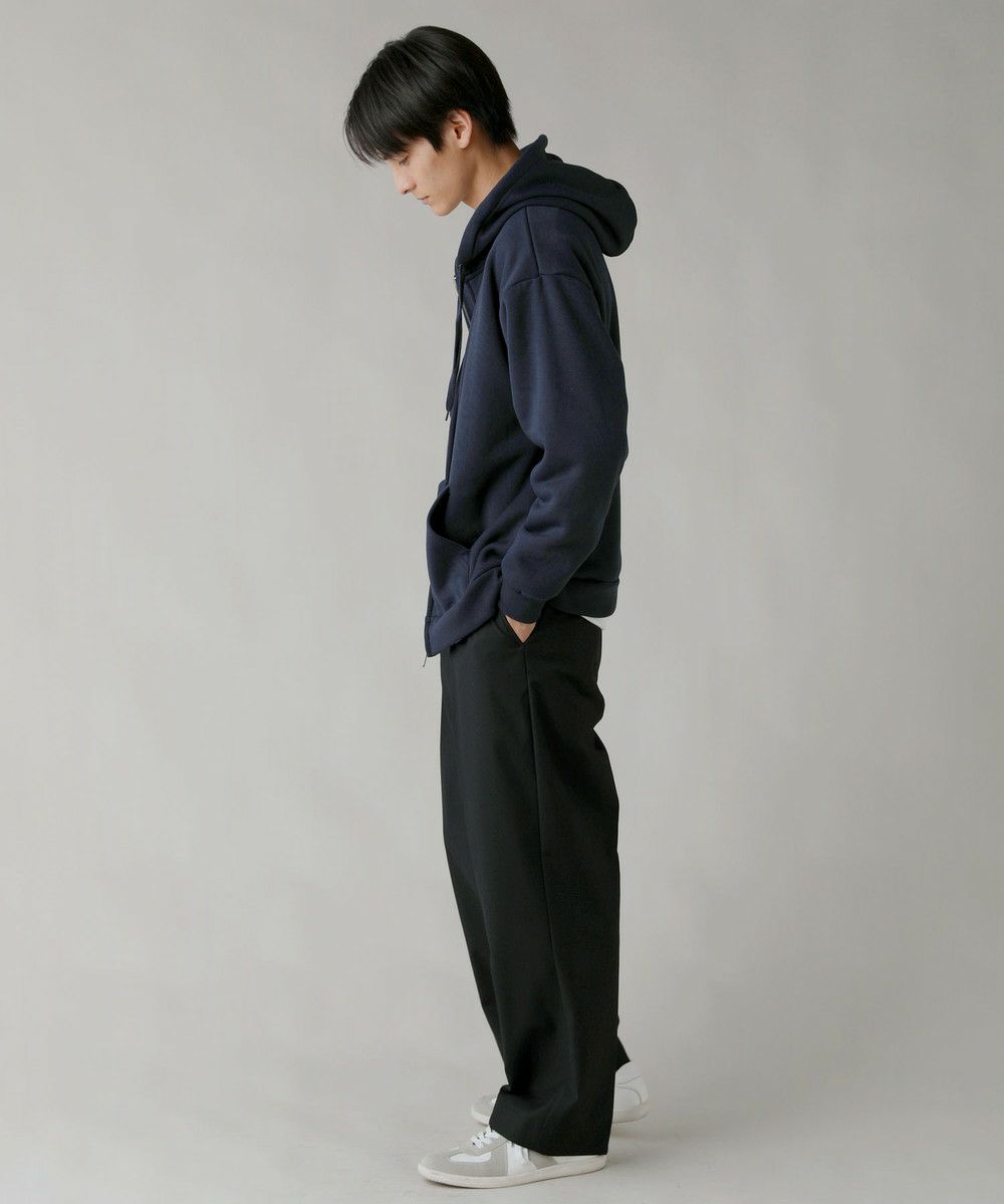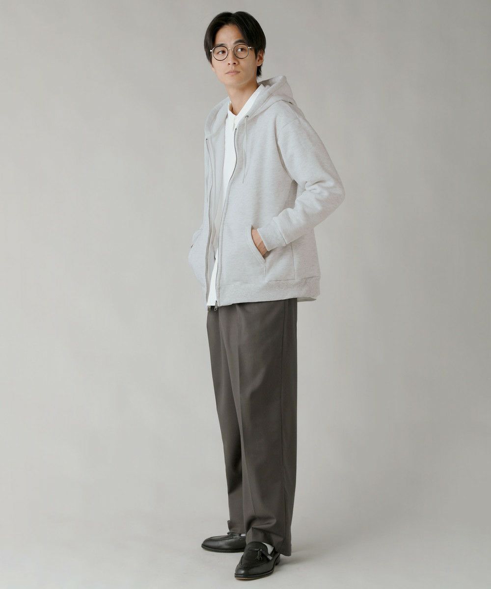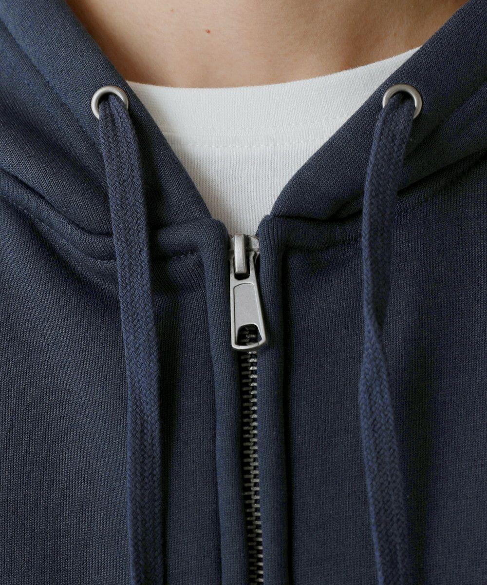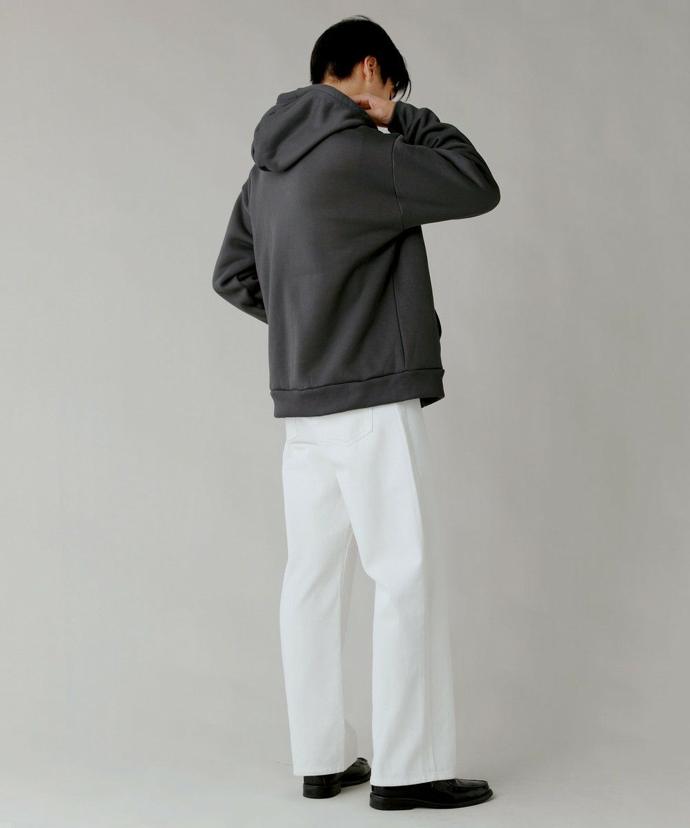 表面は通常のスウェット生地の見た目でありながら裏面はモコモコのボア状になっている、裏ボアスウェット生地を用いました。ボアによって内側に空気の層が作られ、暖かさが維持されます。ポリエステル100%なのでボアの厚みに反して軽量で、楽に着続けられる生地です。同素材で、デイリーユースに適した