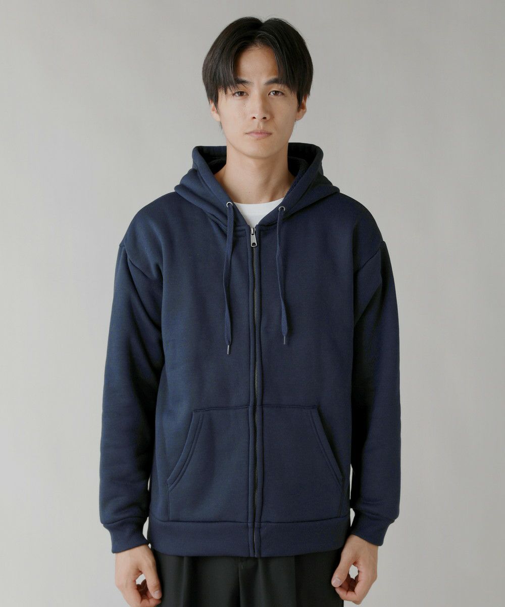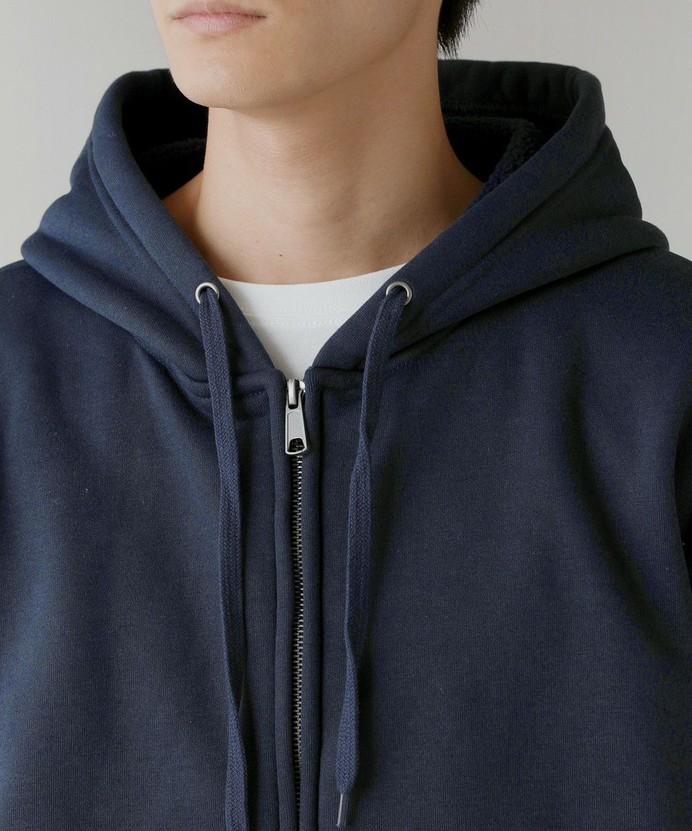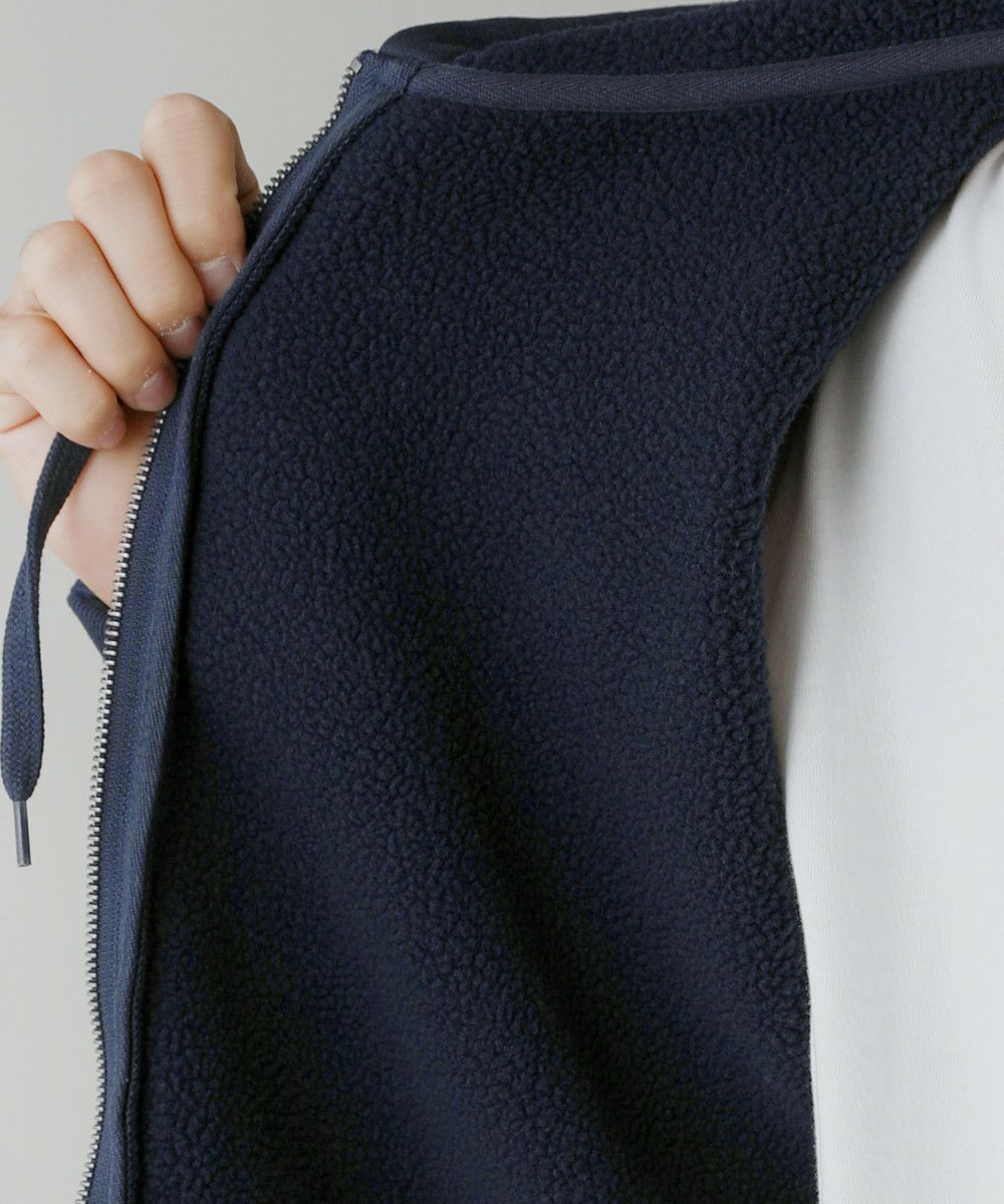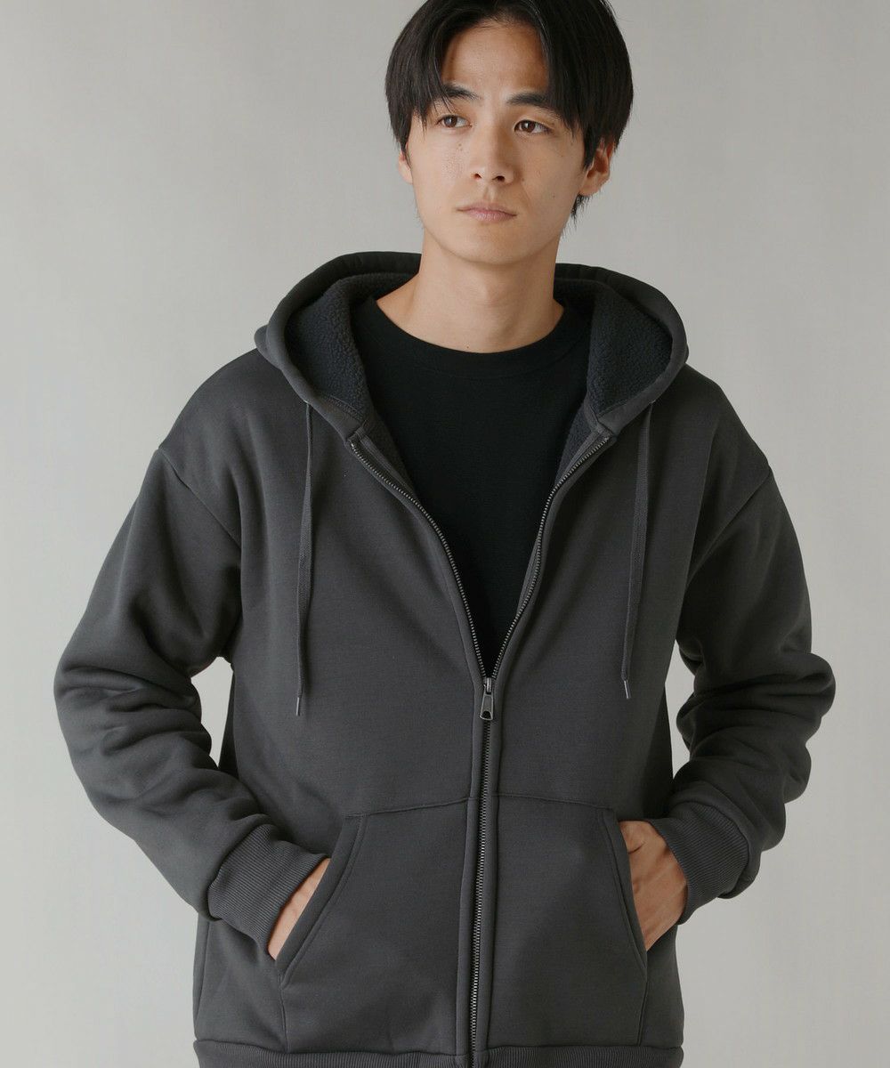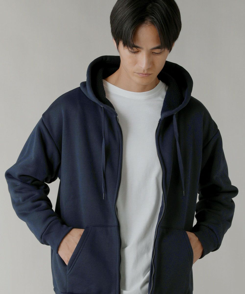 裏面ボア素材を採用した暖かな着心地が自慢の軽量ジップアップパーカー。