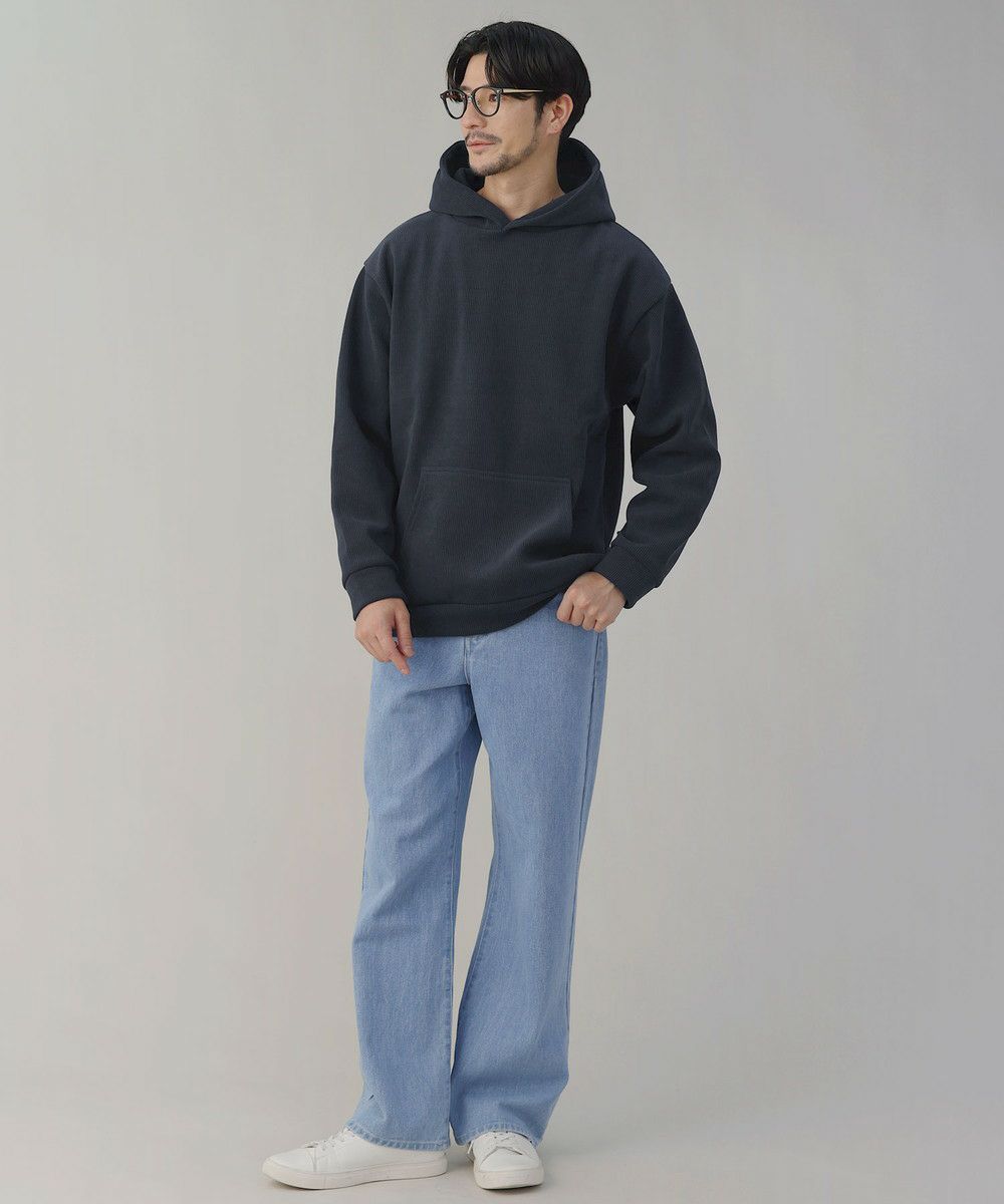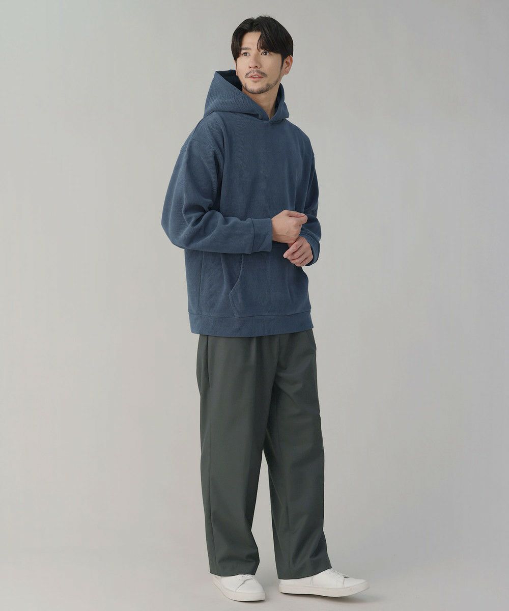 スッキリと見栄えが良い紐なしパーカーは、キレイめなスラックスからカジュアルなデニムまで幅広いテイストと相性抜群。シンプルなデザインで着回し力が高く、肌寒い季節に重宝する一着です。