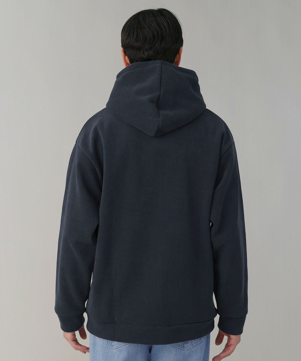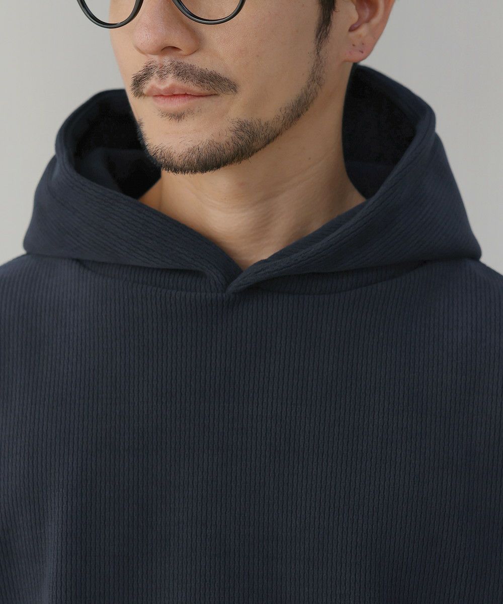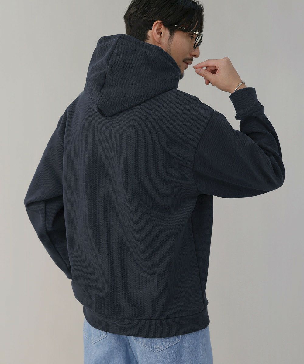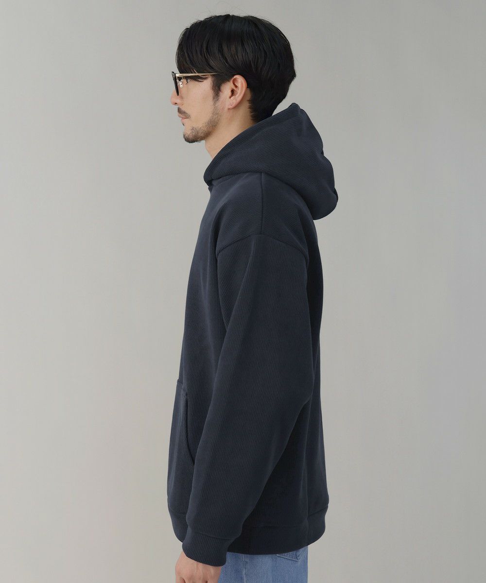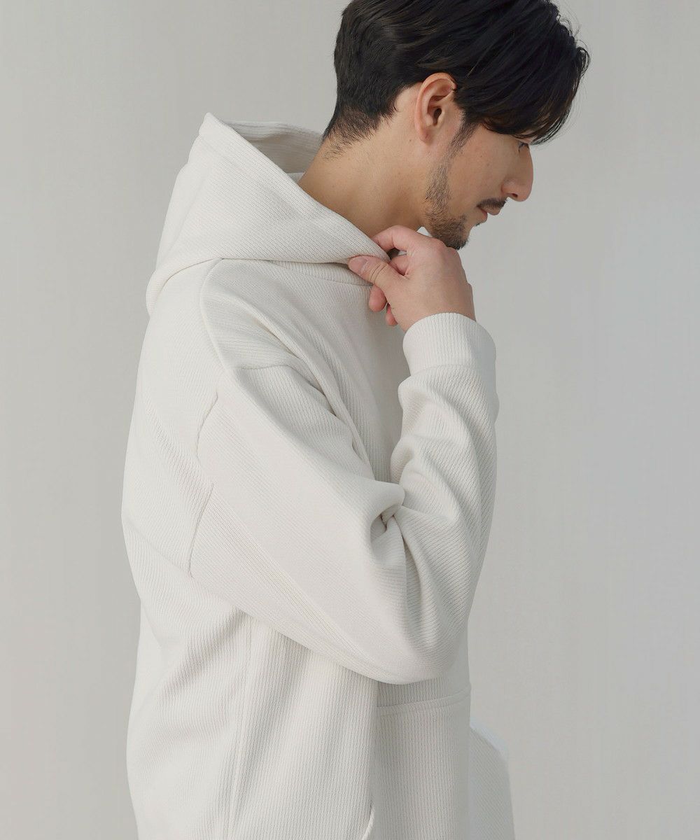 身幅や腕まわりを広めに取った窮屈感のないゆったりシルエット。肩を落としたドロップショルダーも、リラックス感を生むのに一役買っています。フロントにはカンガルーポケットが付いており、スマホなどの小物を収納することが可能。フード部分は立ち上がりをキープしてキレイなシルエットを生み出すため、生地を二重にして厚みを出しました。