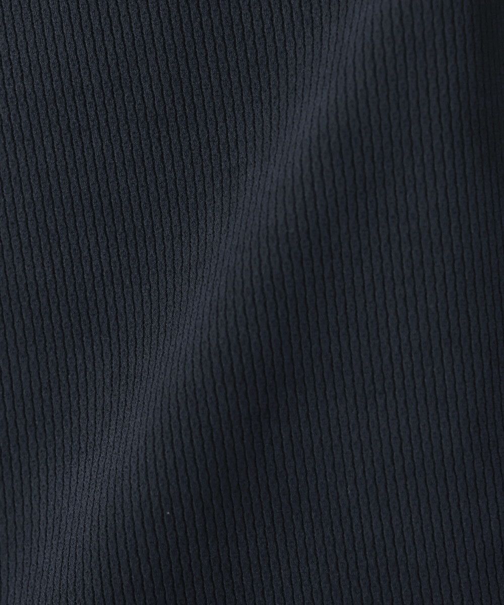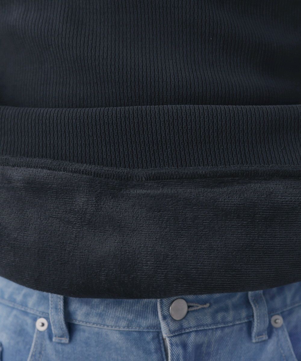 表面には、上品なケーブル柄を細かく編み立てたジャガードを採用。生地の凹凸や陰影で奥行きを出しているため、存在感があるのが特徴です。裏面は起毛したシャギー素材になっており防寒対策もばっちり。秋冬らしい表情を感じさせる、温かみのある一着に仕上げました。洗濯機でのお洗濯が可能で乾きやすく、お手入れも簡単。合成繊維のポリエステルをメインに混紡しているためシワがつきにくく、折り畳みジワをスチームアイロンですぐにケアできるのも嬉しいポイントです。さらにポリウレタン由来の程よい伸縮性によって、肘の曲げ伸ばしにもストレスを感じません。