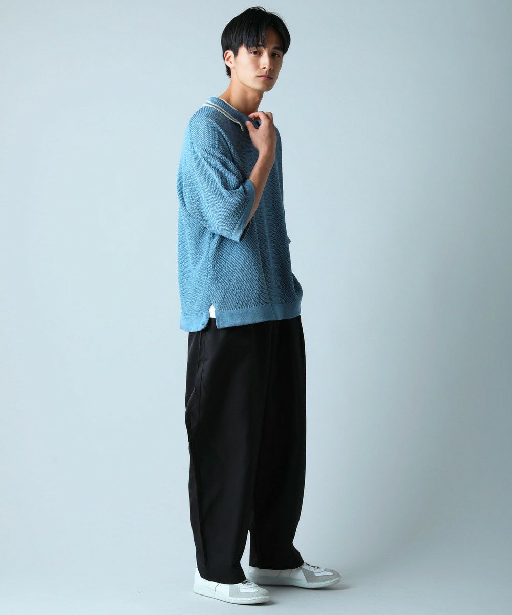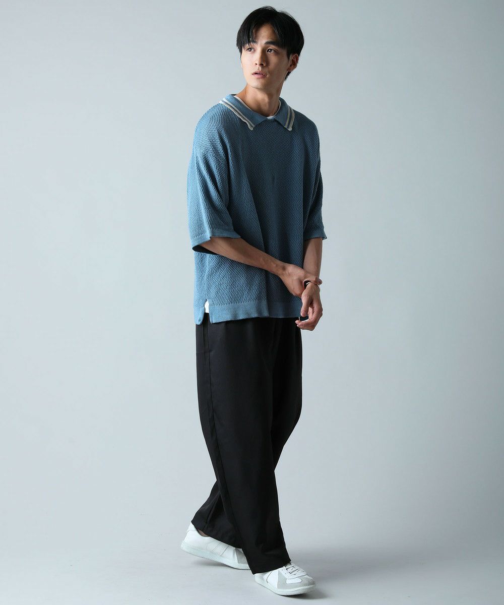 襟に入った配色ラインがアクセントの鹿の子編みポロシャツ。ナチュラルさとクラシカルな雰囲気で、上品なスタイリングにマッチする一着です。ゆったりとした身頃やドロップショルダーデザインなど、トレンドらしさも押さえ、合わせるだけでおしゃれな印象に決まります。浅めのサイドスリットで抜け感もプラス。カラーはベーシックなブラックやアイボリー、深みのあるカーキ、爽やかなトーンのサックスブルー。どのカラーも合わせやすく、上品な印象を与えてくれます。