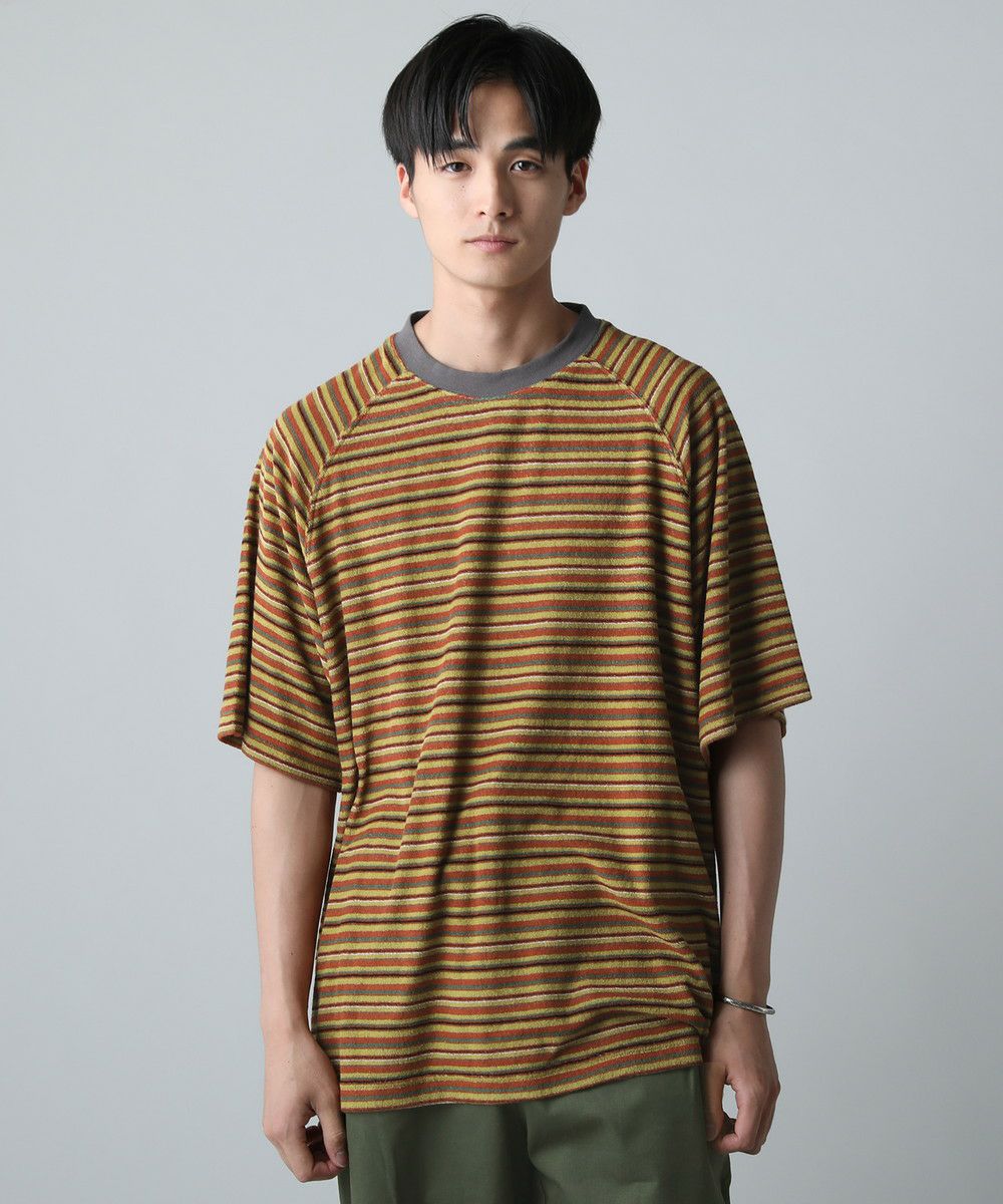 旬のラグランスリーブと広めの身幅を取ったデザインで、ゆったりとした着心地ながらおしゃれに決まる一着。細かいピッチのボーダー柄と落ち着いたトーンの配色で、程よいアクセントがありつつクリーンな印象にまとまります。