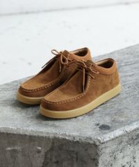 甲部分がU字に縫製されたステッチが目を引く、モカシン縫い仕様のシューズ。