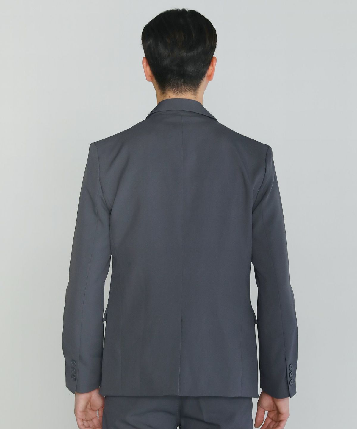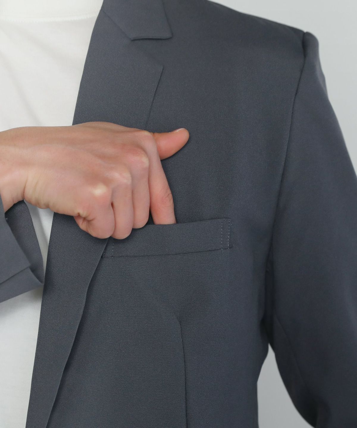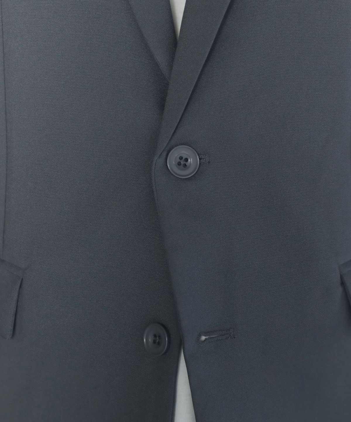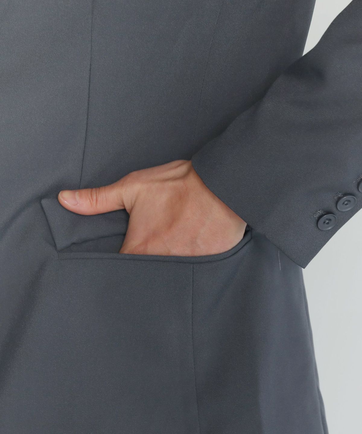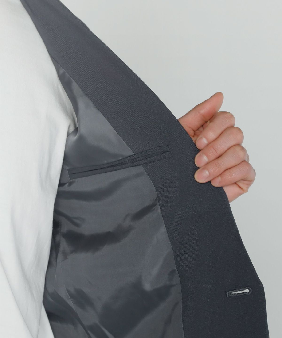 生地は品の良い印象の微光沢ポリエステルスーツ生地。きめ細かく滑らかな生地が、きちんと感を演出します。裏地も付いているので袖通しはスムーズ。便利な内ポケットも1つ付けております。