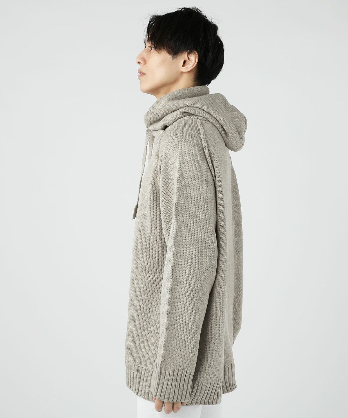 リラックス感のあるラグランスリーブ、やや広めに取ったアームホールなど、程よくルーズなシルエットがこなれた雰囲気を生み出しています。フードに配したボディと同素材のドローコードで首元の着心地を調整できるので、肌寒い季節も暖かくお召しいただける一着です。