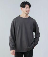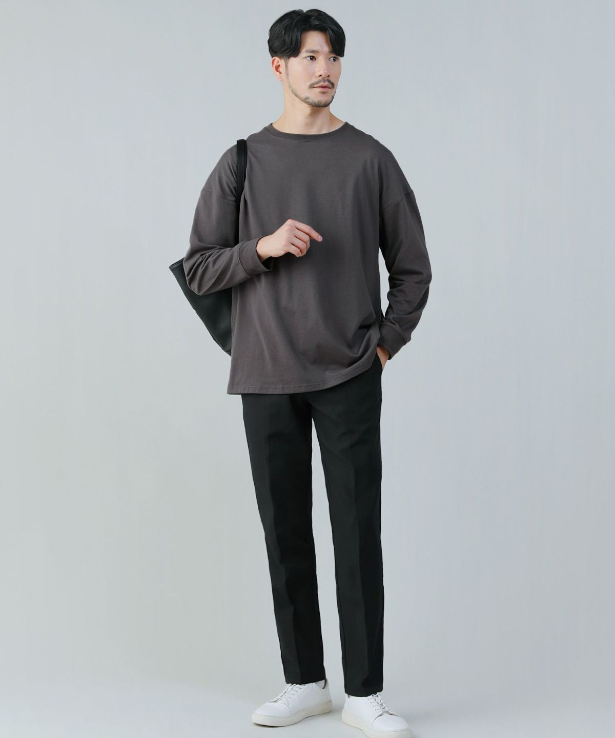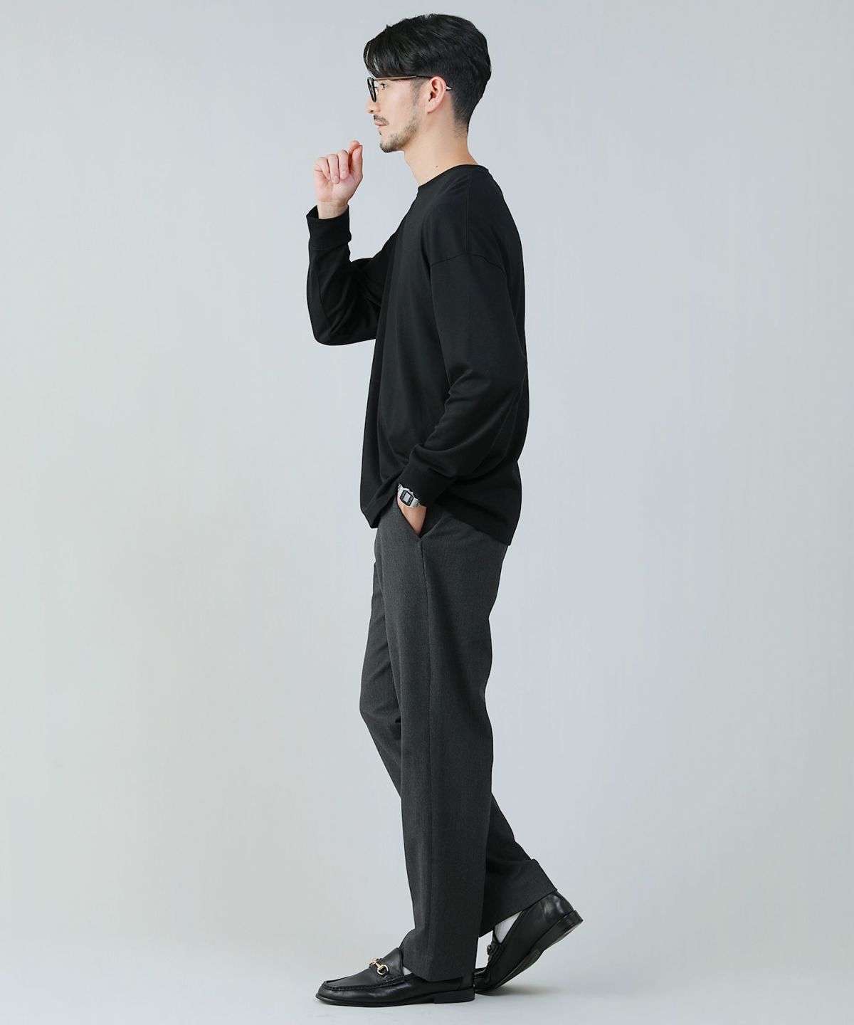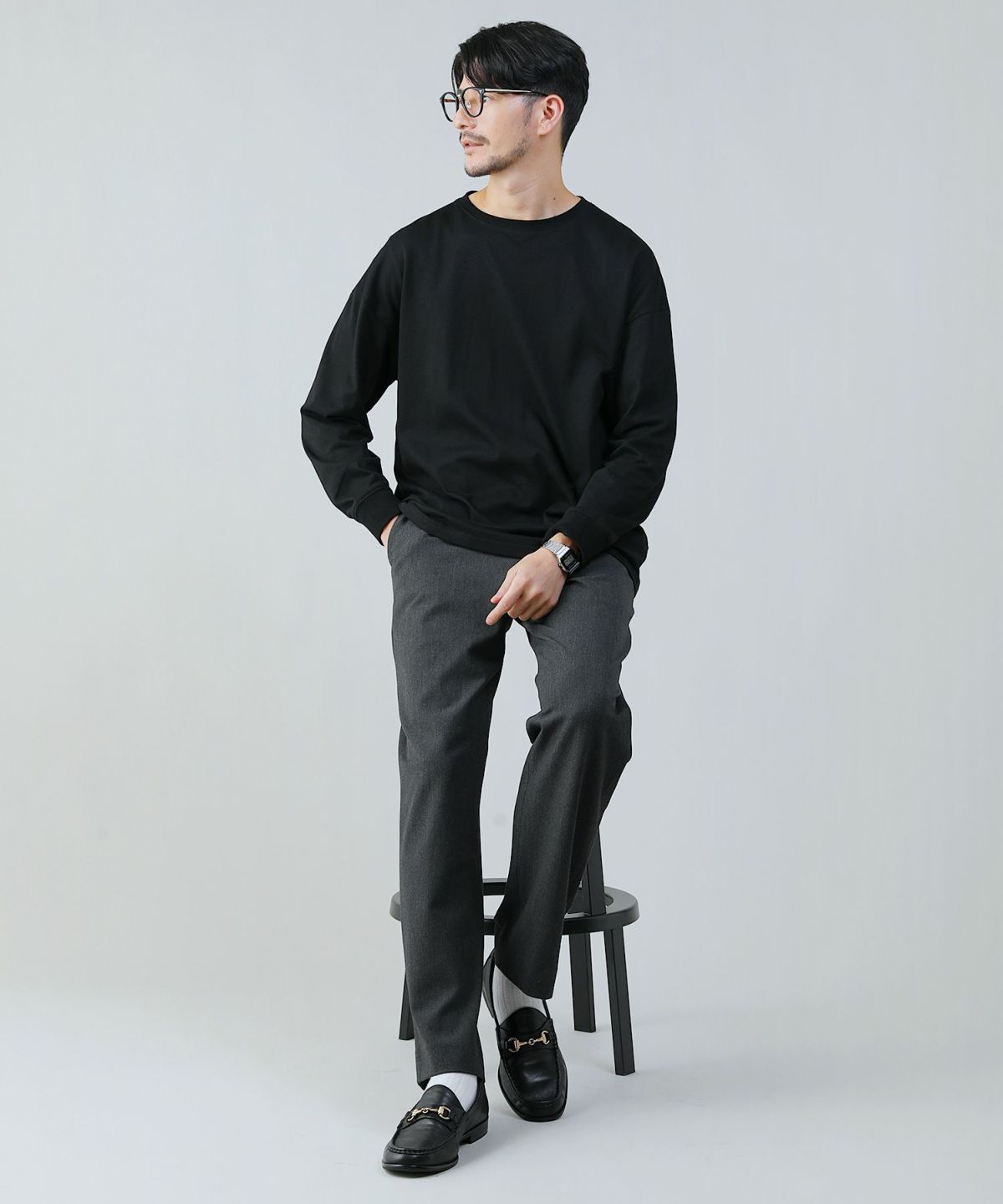 どのアイテムにも合わせやすいクルーネック・長すぎず短すぎない着丈・ゆとりのある腕ぐり。シンプルさの中に、着回し力と着心地へのこだわりを詰めた一着となっています。また、ドロップショルダーなので一枚着でもこなれ感のある印象になり、ジャケットやセーターなどと合わせたインナー使いだけでなく、洗練された大人のシンプルコーデの主役としても活躍します。
