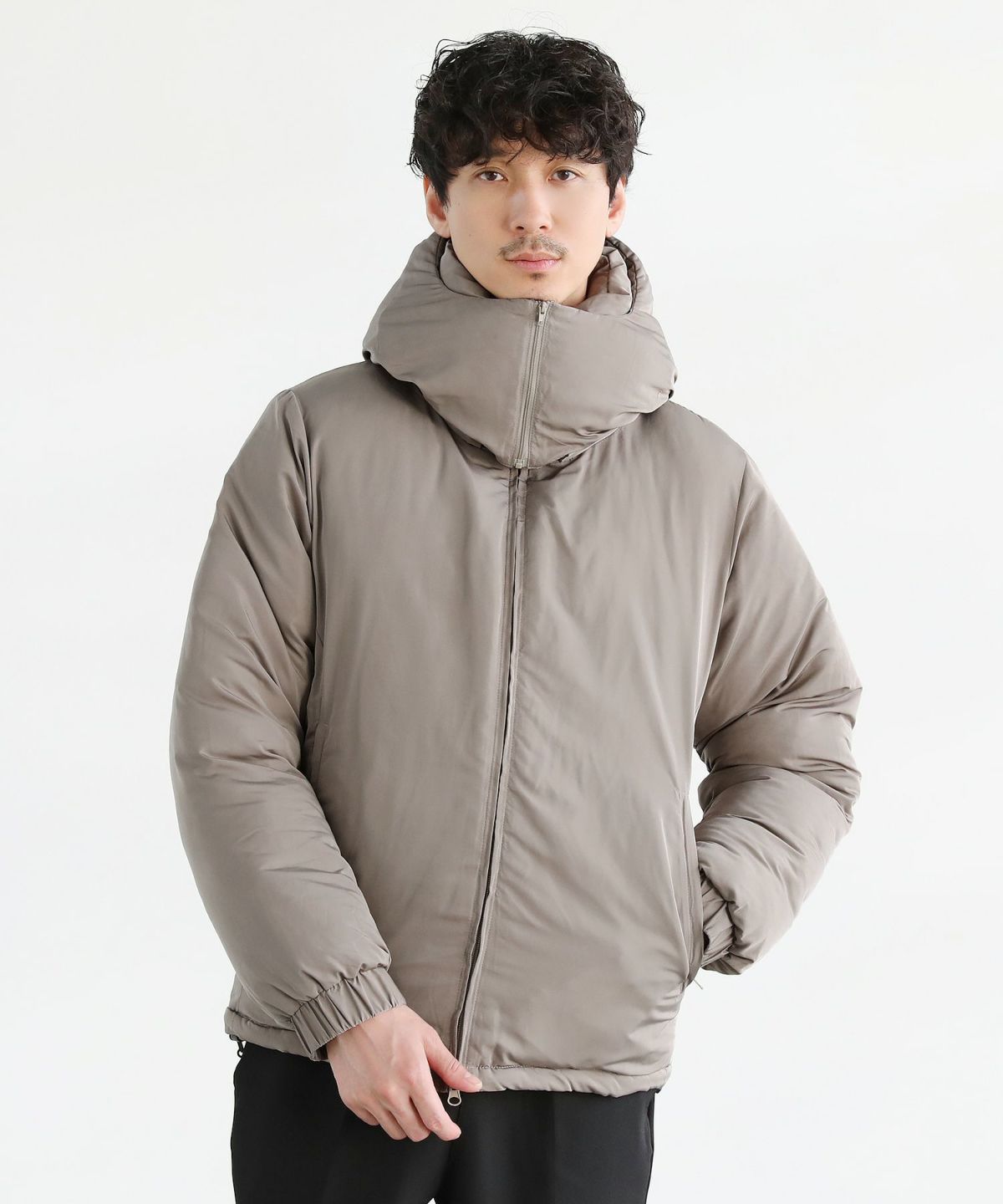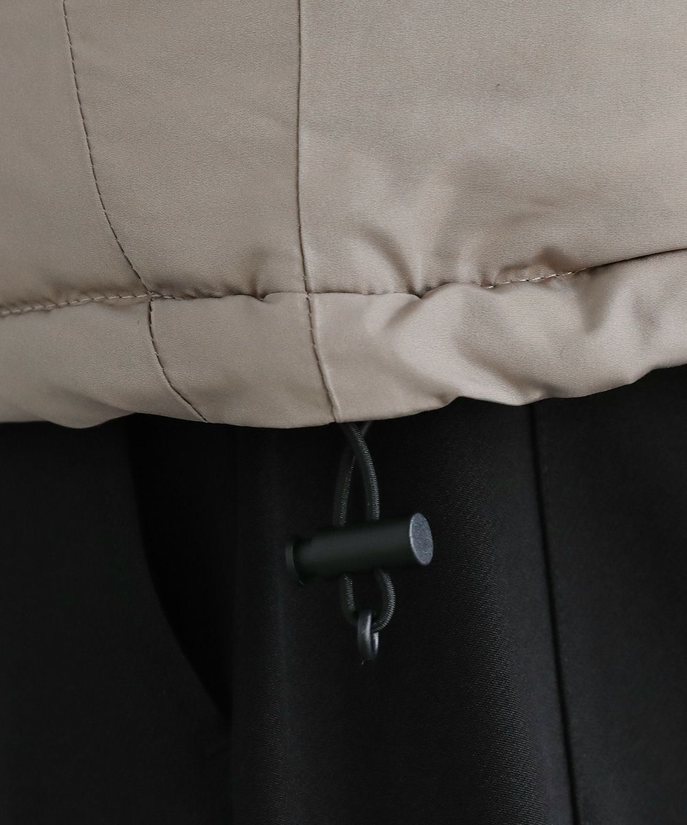 表側に中綿袋のもこもこ感を出さないシームレスデザインですっきりとした印象にまとめています。さらに脇の部分だけを身頃とは別パーツで縫い合わせるパターンにすることで着用時のウエスト周りの着ぶくれ感が抑えられるように設計。中綿入りでありながらもスマートに見えるシルエットを実現させました。細身に感じられますが、内側には 厚手のケーブルニット を着用できるほどのゆとりがあります。