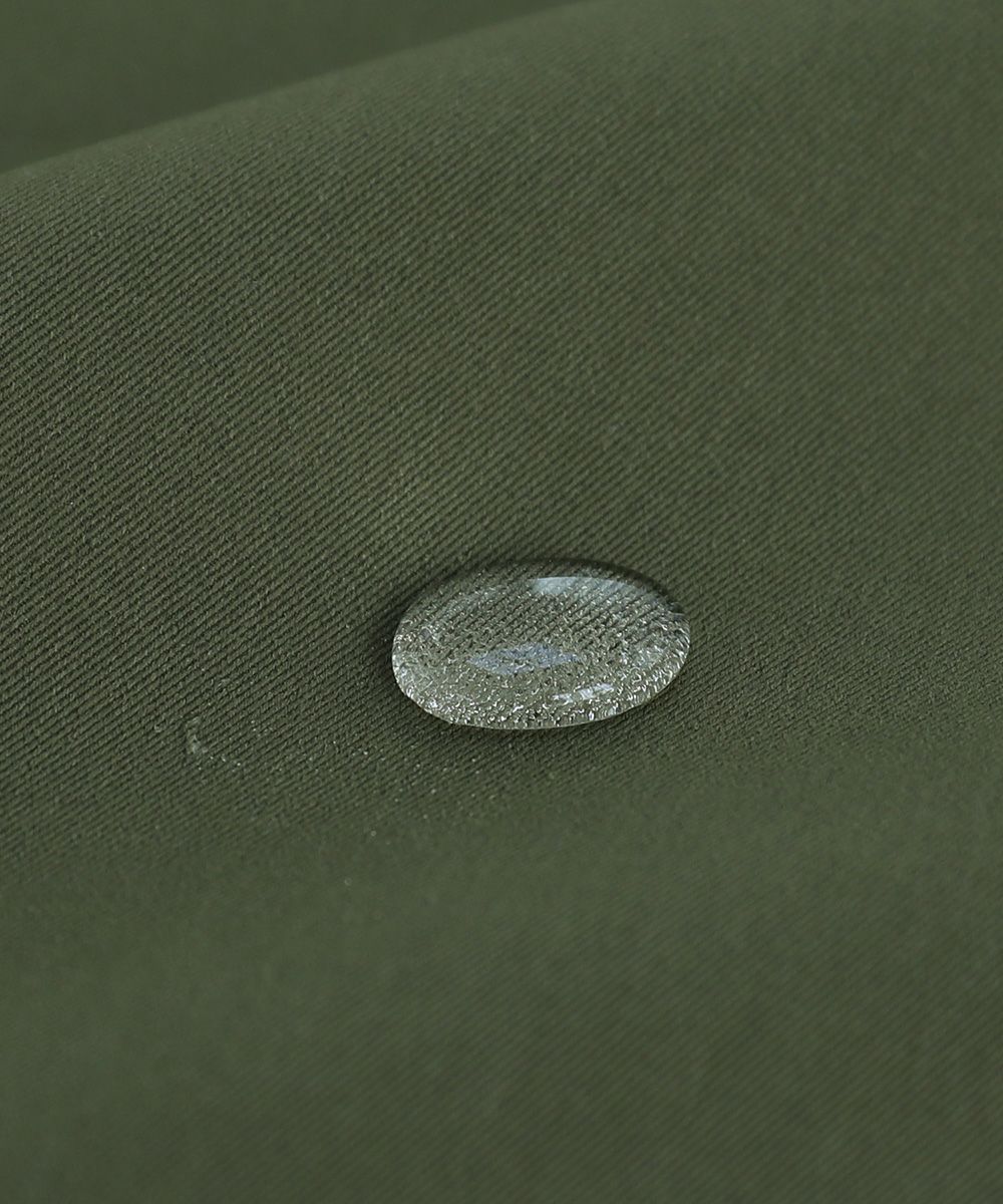 用いた生地は、丈夫で軽量なポリエステルツイルです。マットな質感で落ち着いた印象を与えます。天気に左右されずご着用いただけるよう、生地に撥水コーティングも施しました。汚れがつきにくく雨粒のような水滴は弾かれて滑り落ちていくので、ちょっとした雨の中でも気にせずに羽織ることができるブルゾンとなっております。