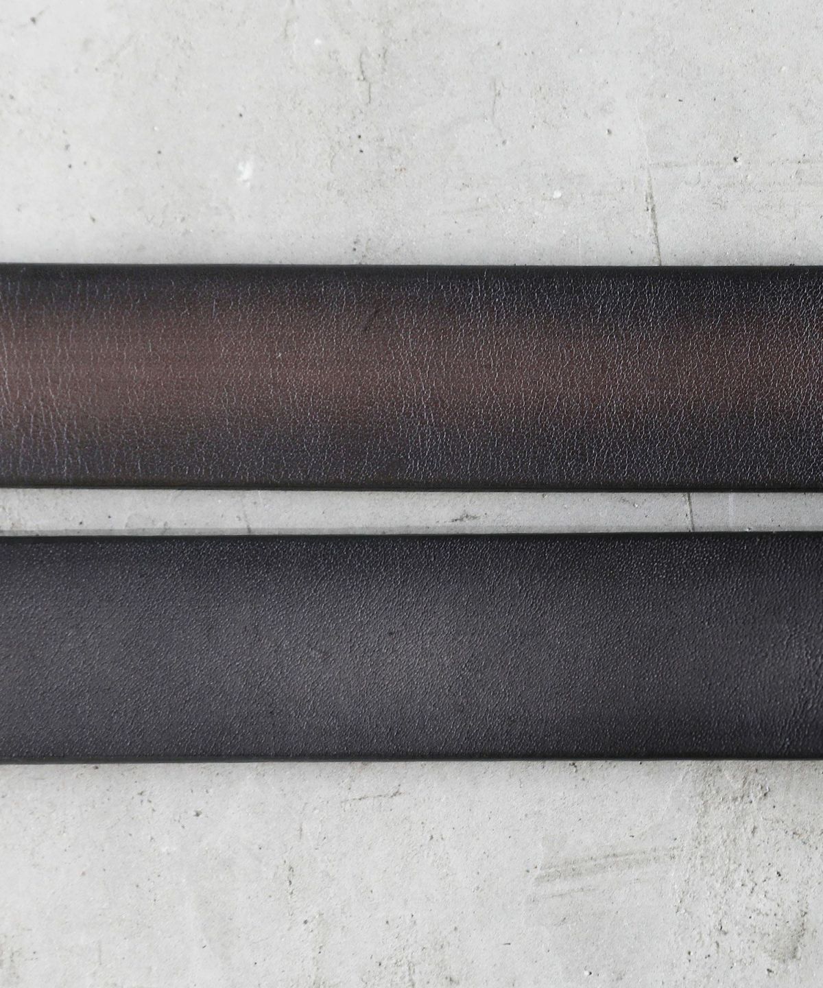 革の両端から染められた色が美しいグラデーションを織りなし、深みのある高級感を演出します。バックルは光沢を抑えた上品なシルバーのラウンドデザインを採用。細過ぎず太過ぎない程よい幅で、タックインスタイルなど様々な着こなしでお使いいただけます。