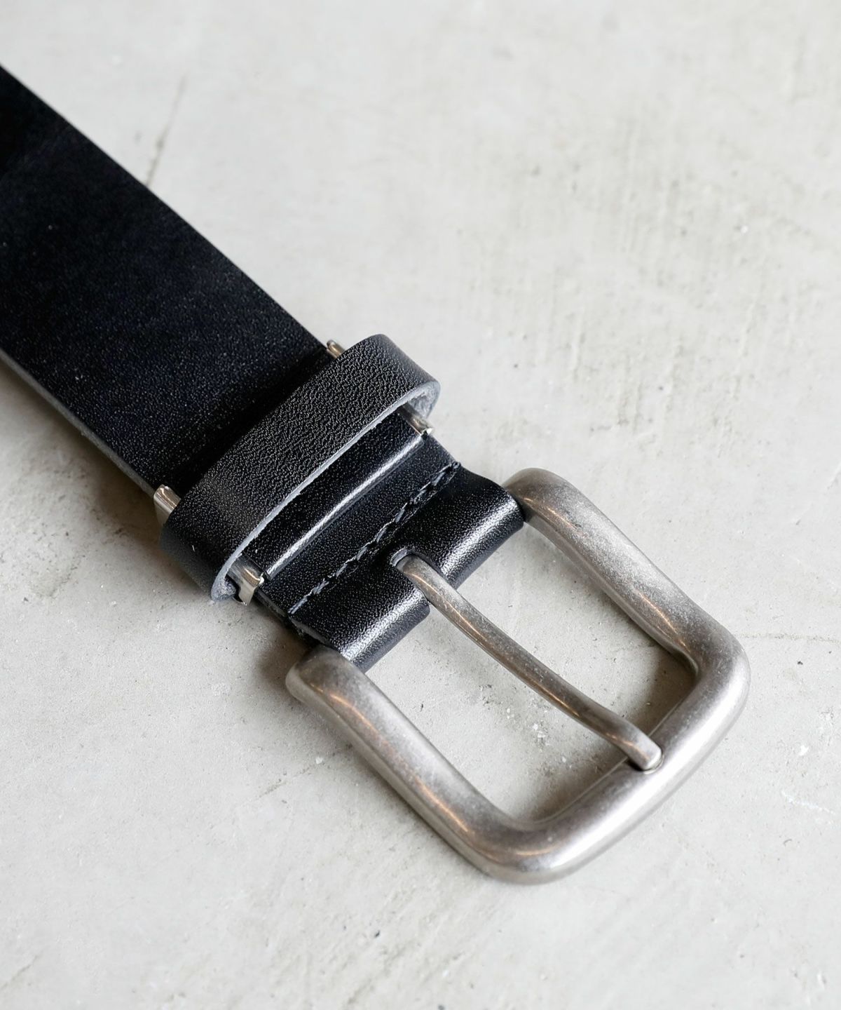 ベルト幅は使い勝手の良い35mmで、どんなベルトループにも通しやすく着こなしの邪魔にもならないサイズ感です。また、レザーの存在感に負けず上品に輝くバックルは、流行に左右されないスタンダードなスクエアデザイン。レザーと同様に月日が経つと風合いを増してきます。