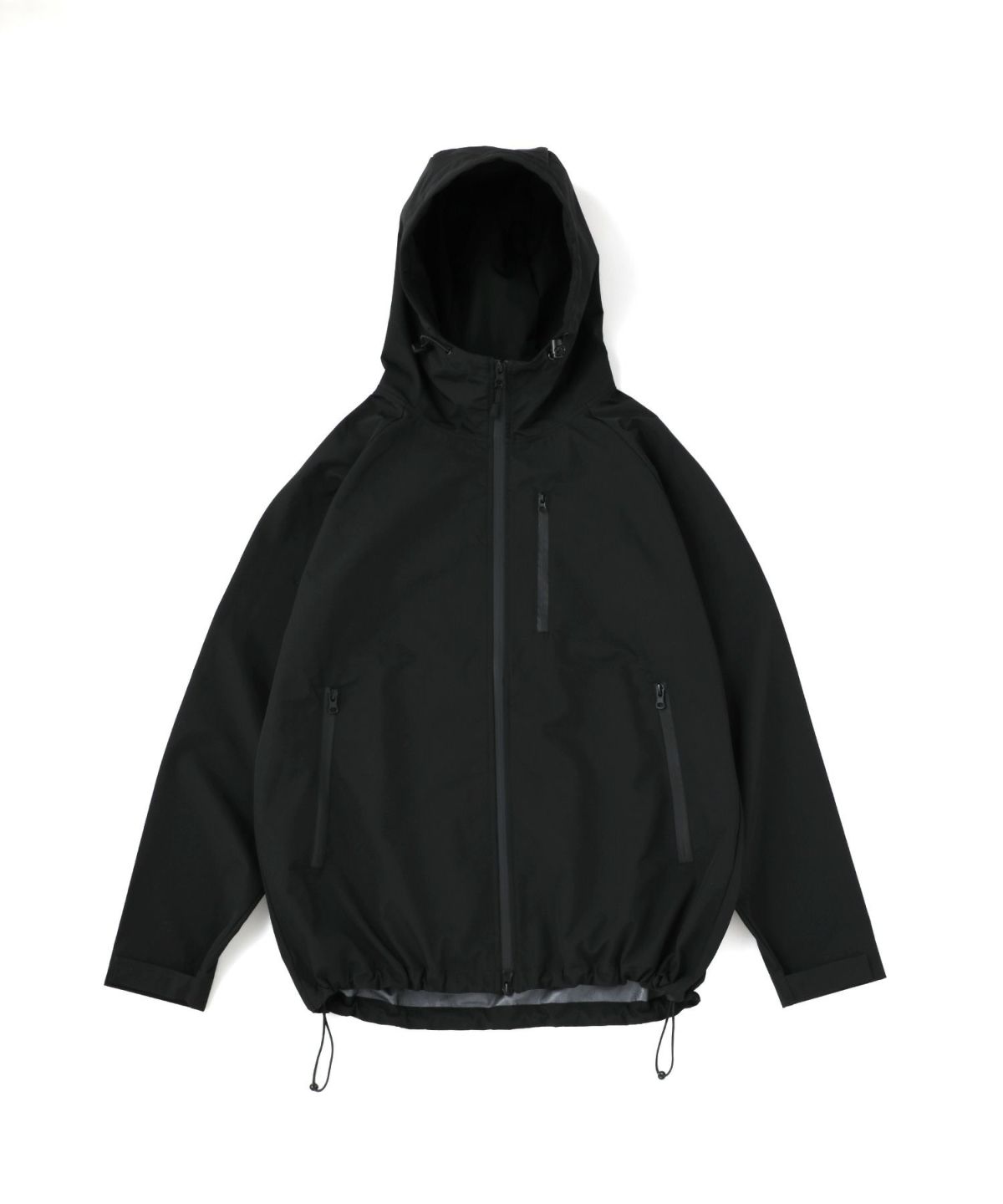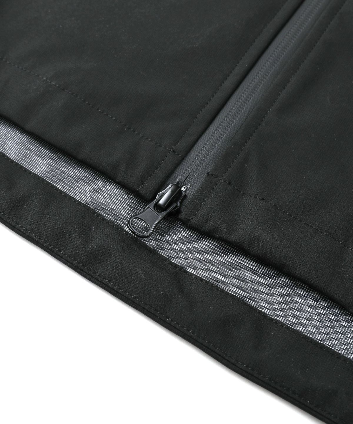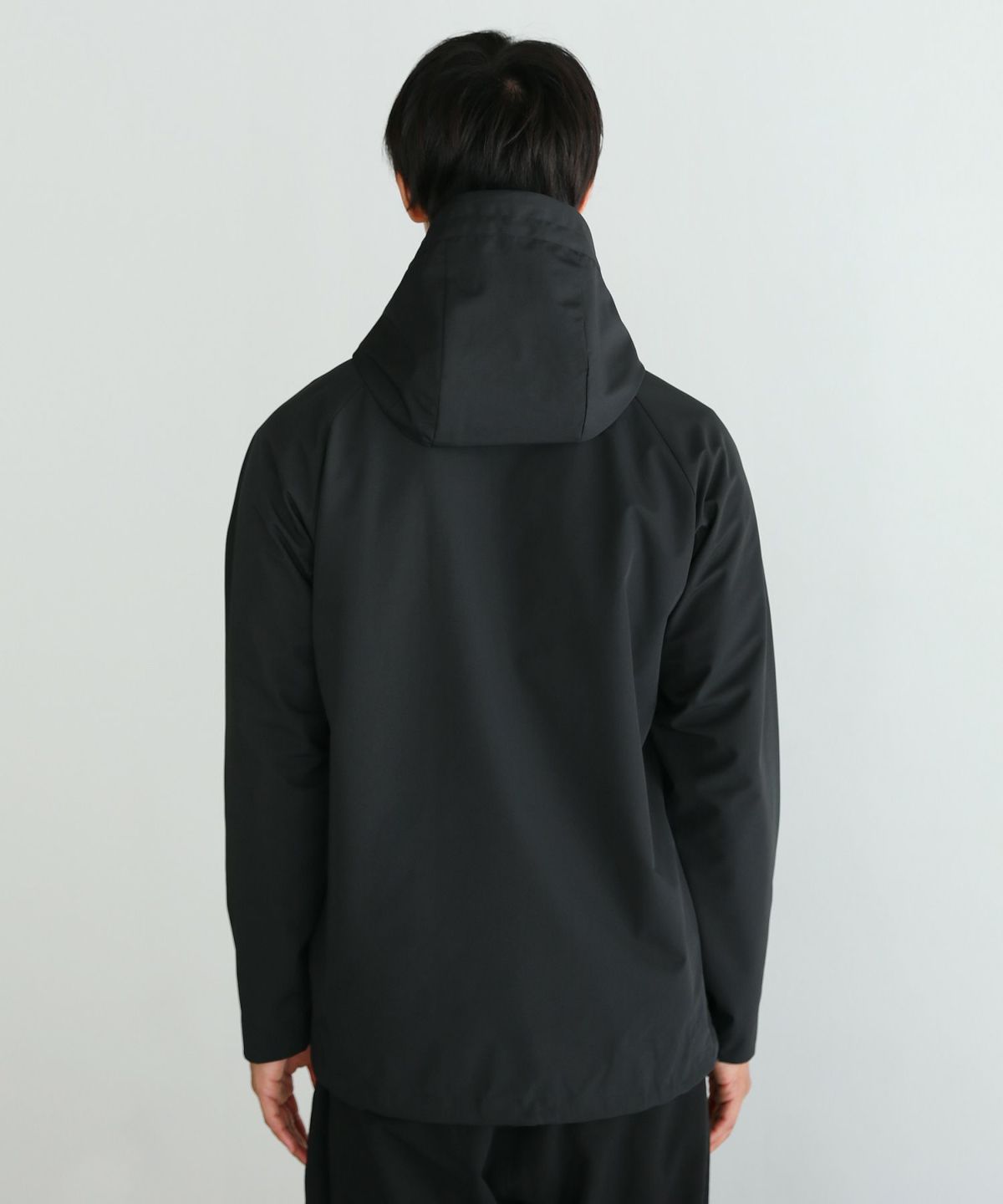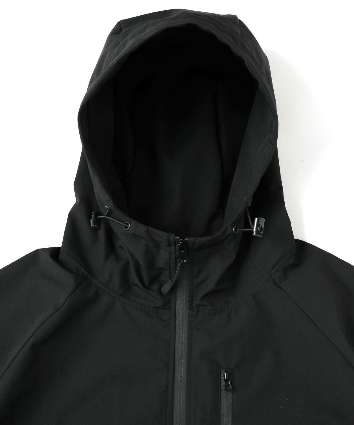 雨天時の着用でポケットに収納したスマホやイヤホンが濡れてしまわないようにジップはすべて止水ジップを採用しております。フード一体型のハイネックデザインは首回りの風の侵入を防ぎ、防風性をUP。袖口や裾など、風の入り込みが気になる箇所もすべて絞ることができる仕様にしております。肩は肩線のないラグランスリーブに。肩回りを動かしやすいつくりになっています。冬は手袋をしたままでも調節がしやすいようにフロントジップには引き手を付け、袖口はマジックテープを採用しました。各ディテールまで、それぞれの機能面を高める狙いを持って設計しております。