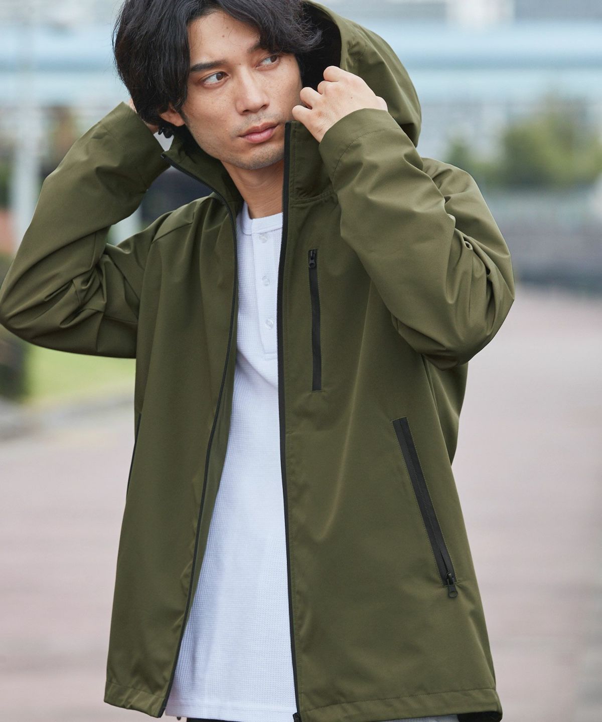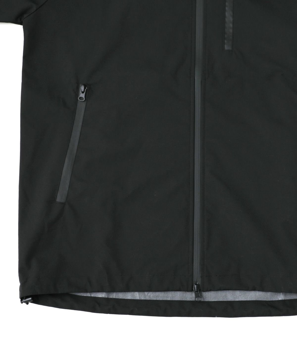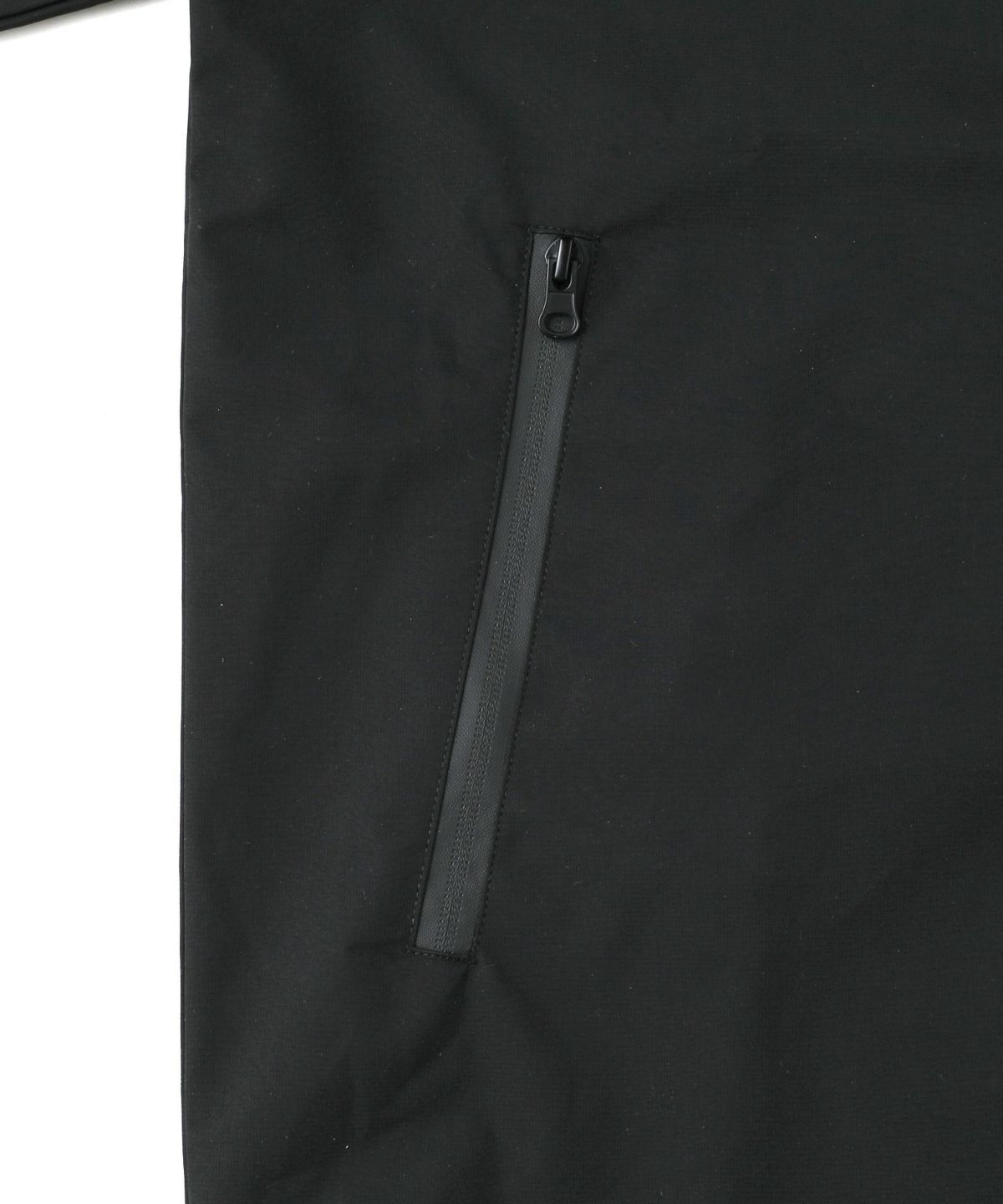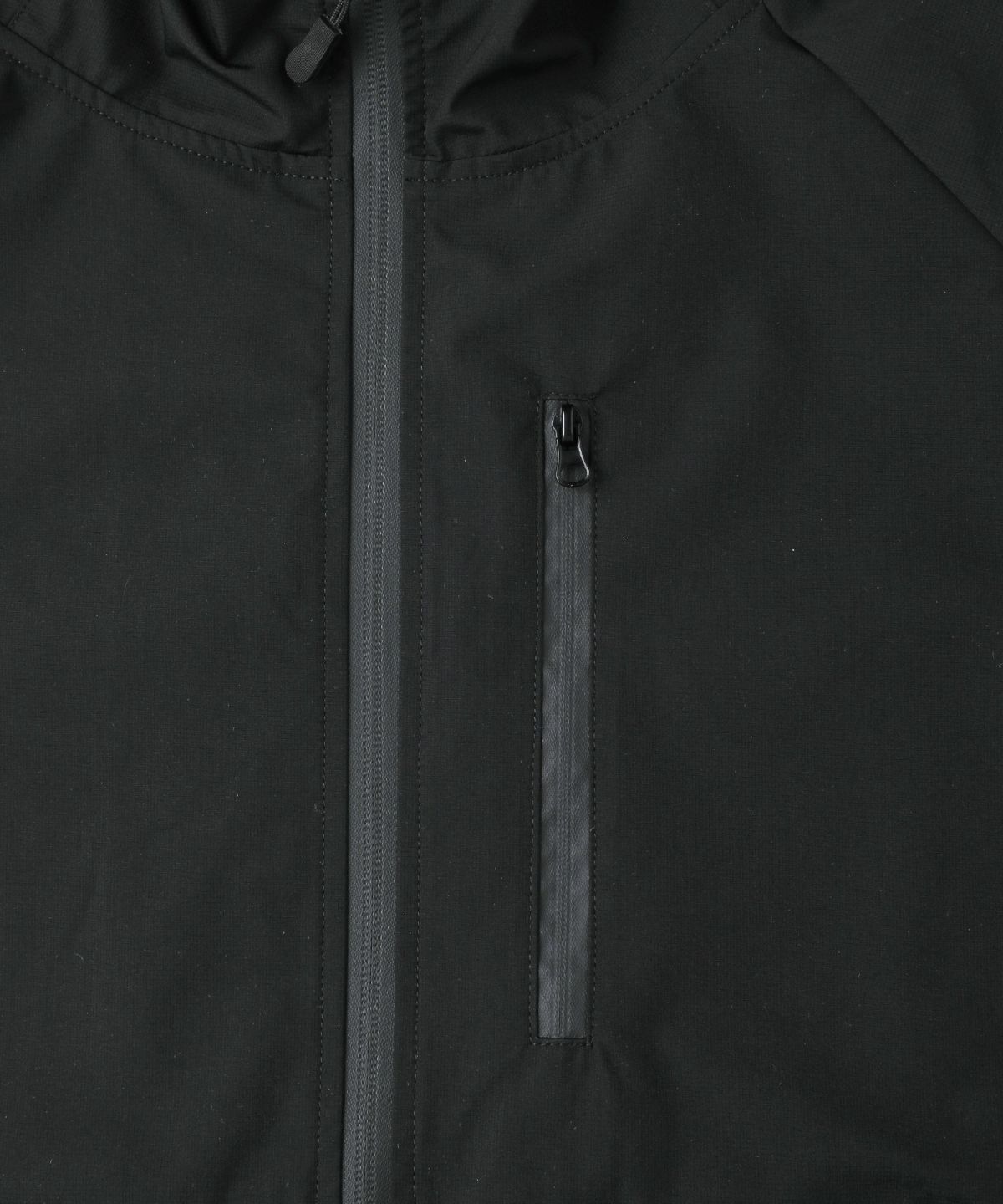 雨天時の着用でポケットに収納したスマホやイヤホンが濡れてしまわないようにジップはすべて止水ジップを採用しております。フード一体型のハイネックデザインは首回りの風の侵入を防ぎ、防風性をUP。袖口や裾など、風の入り込みが気になる箇所もすべて絞ることができる仕様にしております。肩は肩線のないラグランスリーブに。肩回りを動かしやすいつくりになっています。冬は手袋をしたままでも調節がしやすいようにフロントジップには引き手を付け、袖口はマジックテープを採用しました。各ディテールまで、それぞれの機能面を高める狙いを持って設計しております。