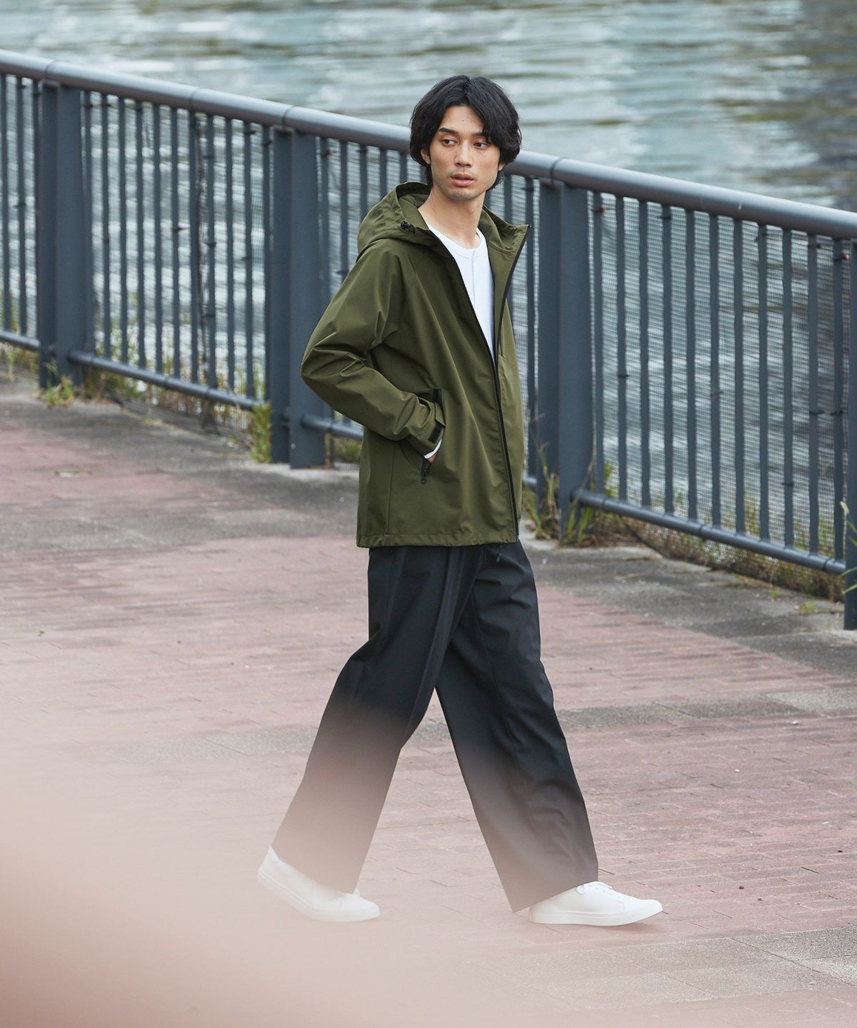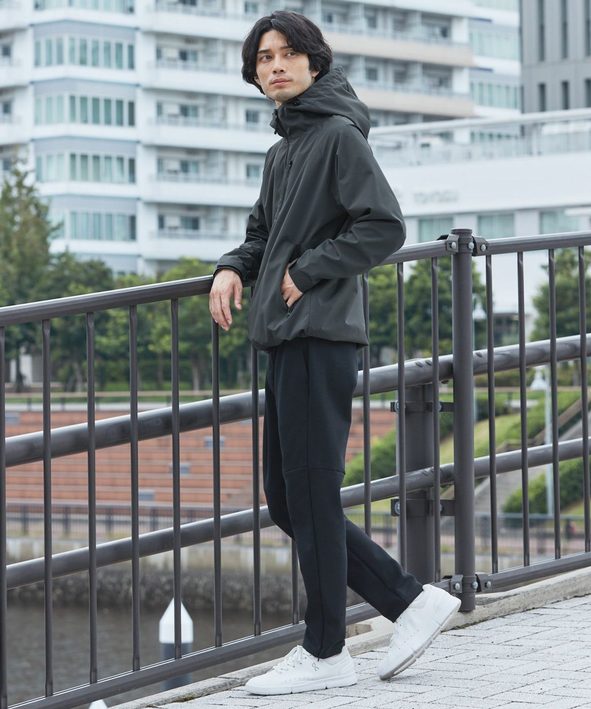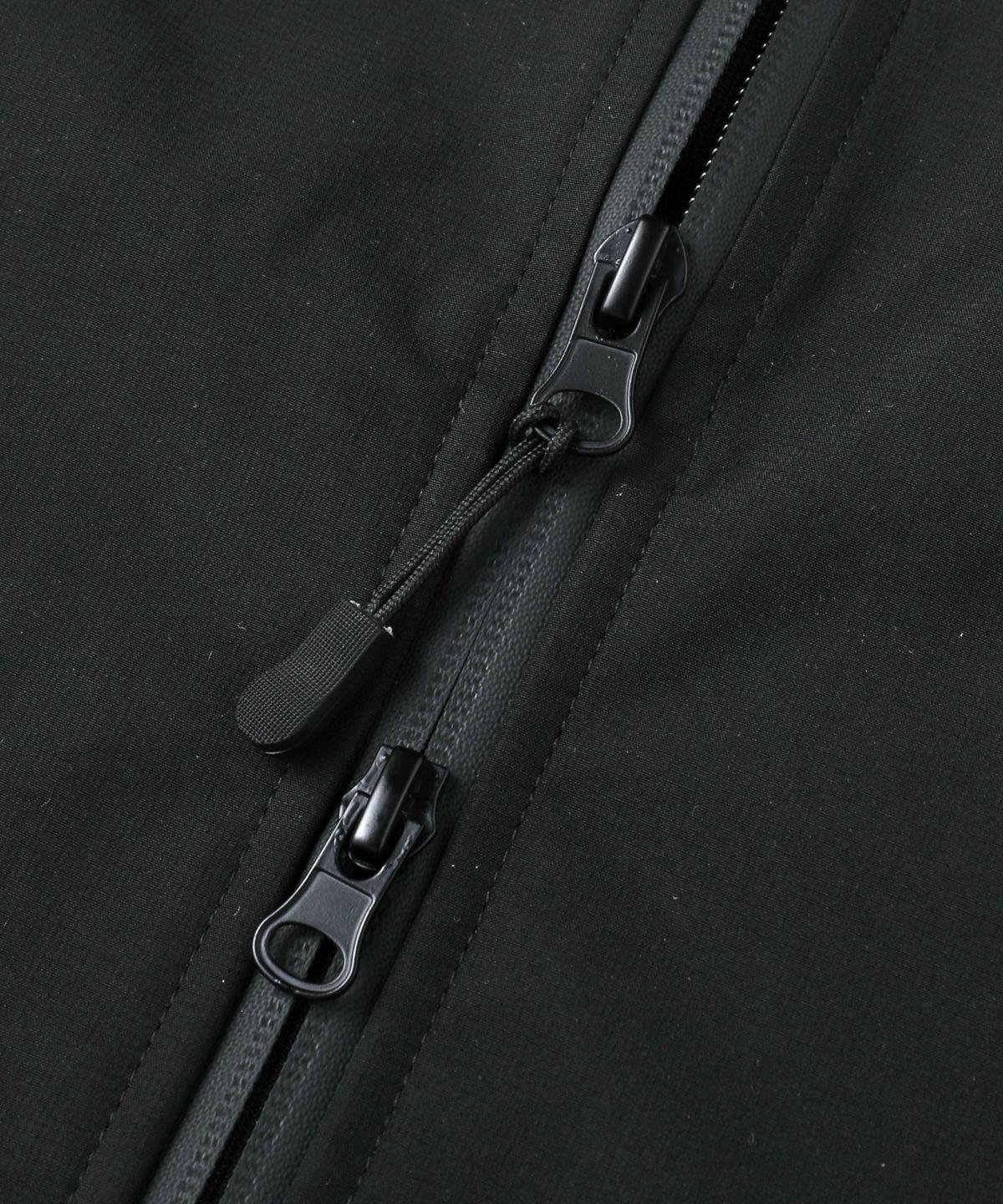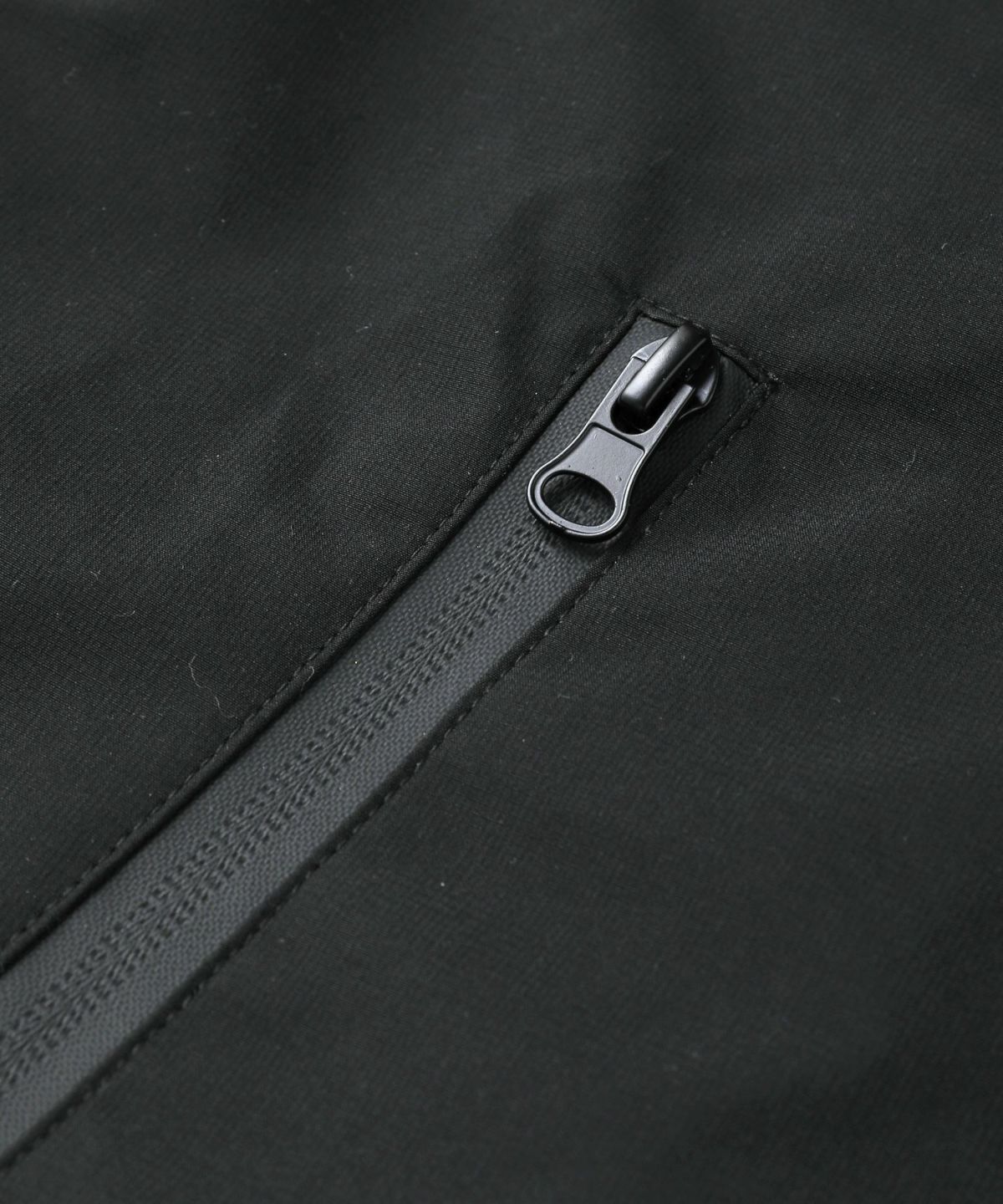 雨天時の着用でポケットに収納したスマホやイヤホンが濡れてしまわないようにジップはすべて止水ジップを採用しております。フード一体型のハイネックデザインは首回りの風の侵入を防ぎ、防風性をUP。袖口や裾など、風の入り込みが気になる箇所もすべて絞ることができる仕様にしております。肩は肩線のないラグランスリーブに。肩回りを動かしやすいつくりになっています。冬は手袋をしたままでも調節がしやすいようにフロントジップには引き手を付け、袖口はマジックテープを採用しました。各ディテールまで、それぞれの機能面を高める狙いを持って設計しております。