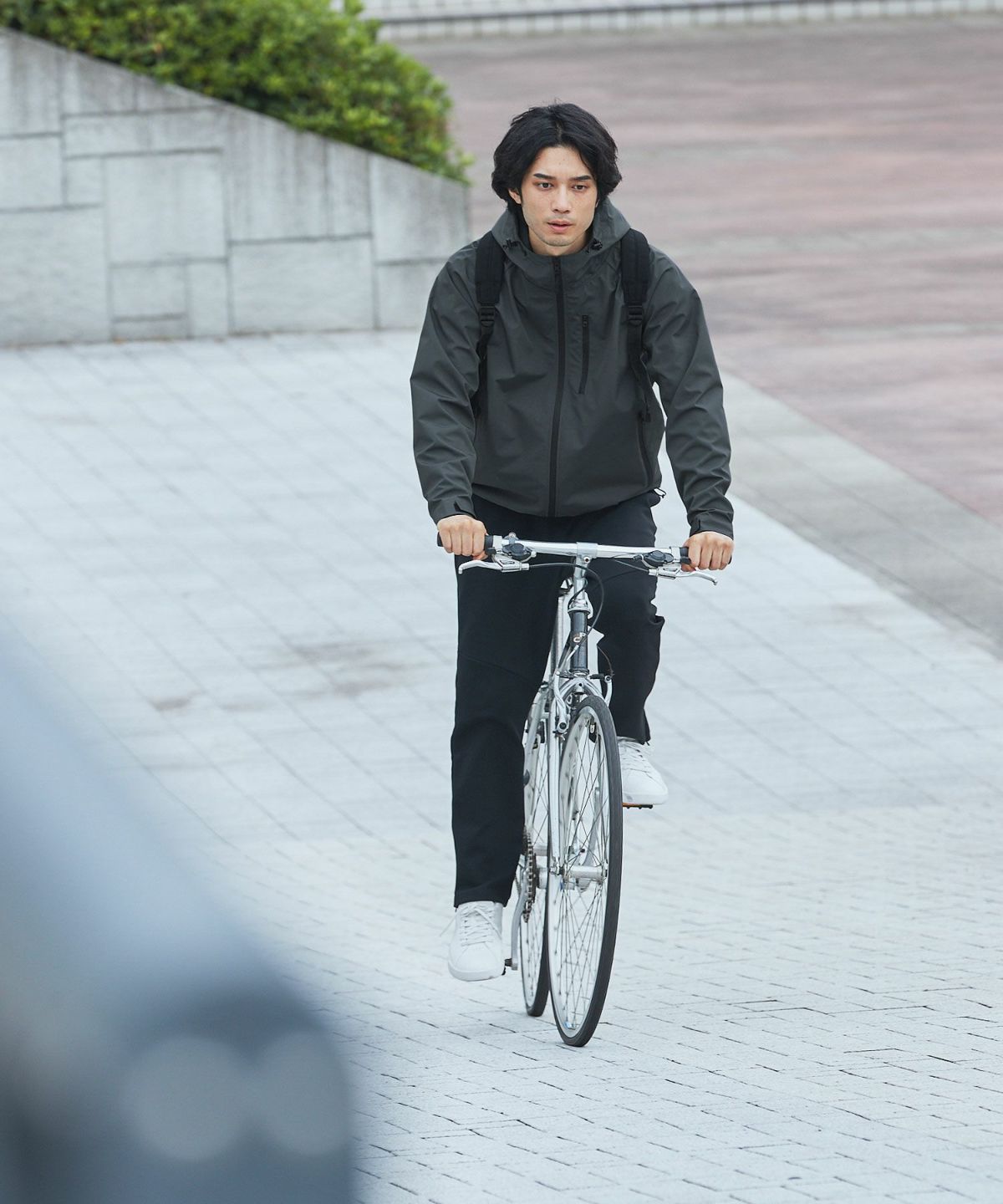 秋や春、季節の変わり目の羽織り物として重宝するのはもちろんのこと、中に一枚インナーダウンをプラスすれば冬のアウターとしてご利用いただくこともできます。また、雨に強い3レイヤー生地のため梅雨時のジャケットとしても活躍することでしょう。高機能でありながらも見た目はすっきりとしたシンプルなデザインでスーツスタイルにも馴染むので自転車通勤時の上着に最適。秋から春まで季節を跨いで着回すことができるこのハイスペックな一着があれば、心強いこと間違いなしです。