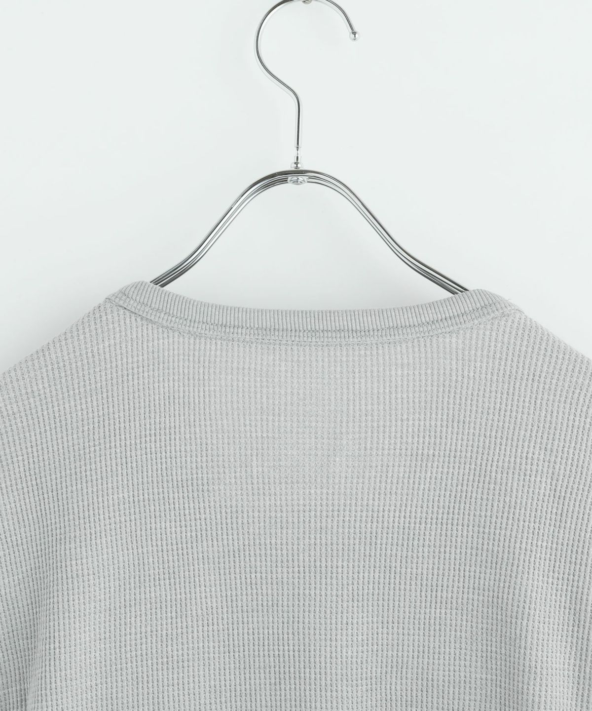 表面に凹凸があるサーマル生地を用いています。肌への接地面が少ないのでベタつかず、ソフトな肌触りで着心地の良い生地です。素材はご自宅でもお洗濯がしやすい綿ポリ混紡となっております。吸湿性に優れ、シワになりにくく、さらにストレッチ性もあるためアクティブなシーンでも重宝します。
