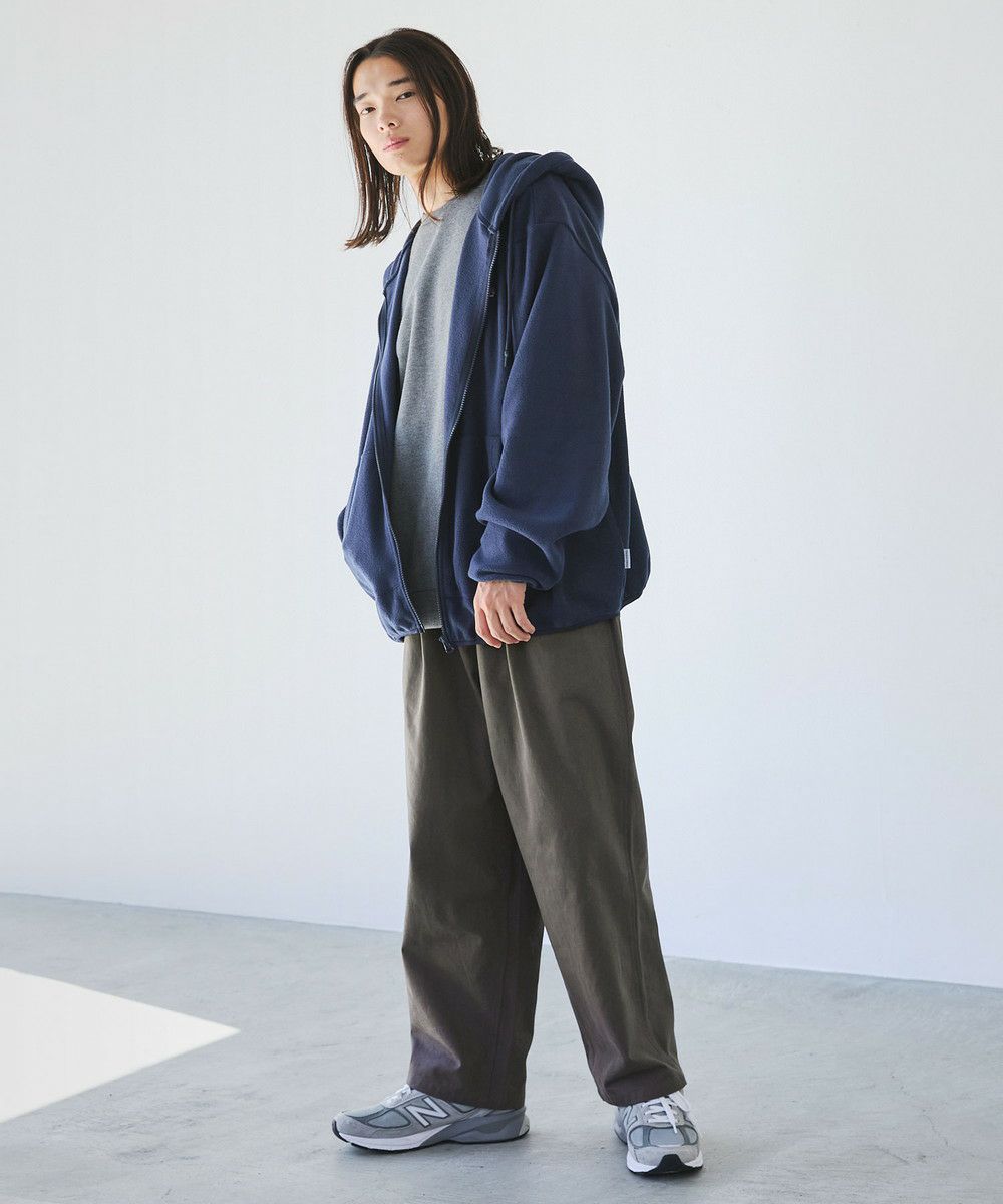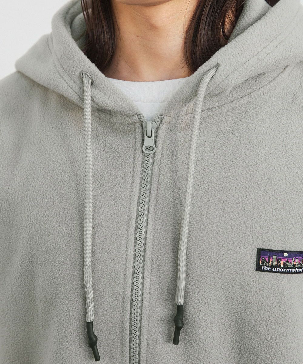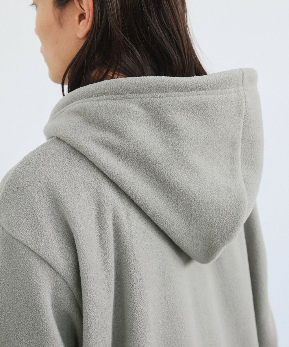 柔らかい質感のフリース生地ですが、フード部分は生地を二重にしているためフードの立ち上がりがよく存在感を発揮。袖口部分と裾にはパイピングを施しており、こなれた印象を感じさせます。