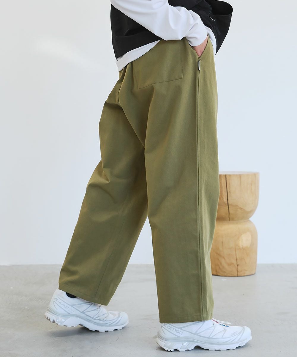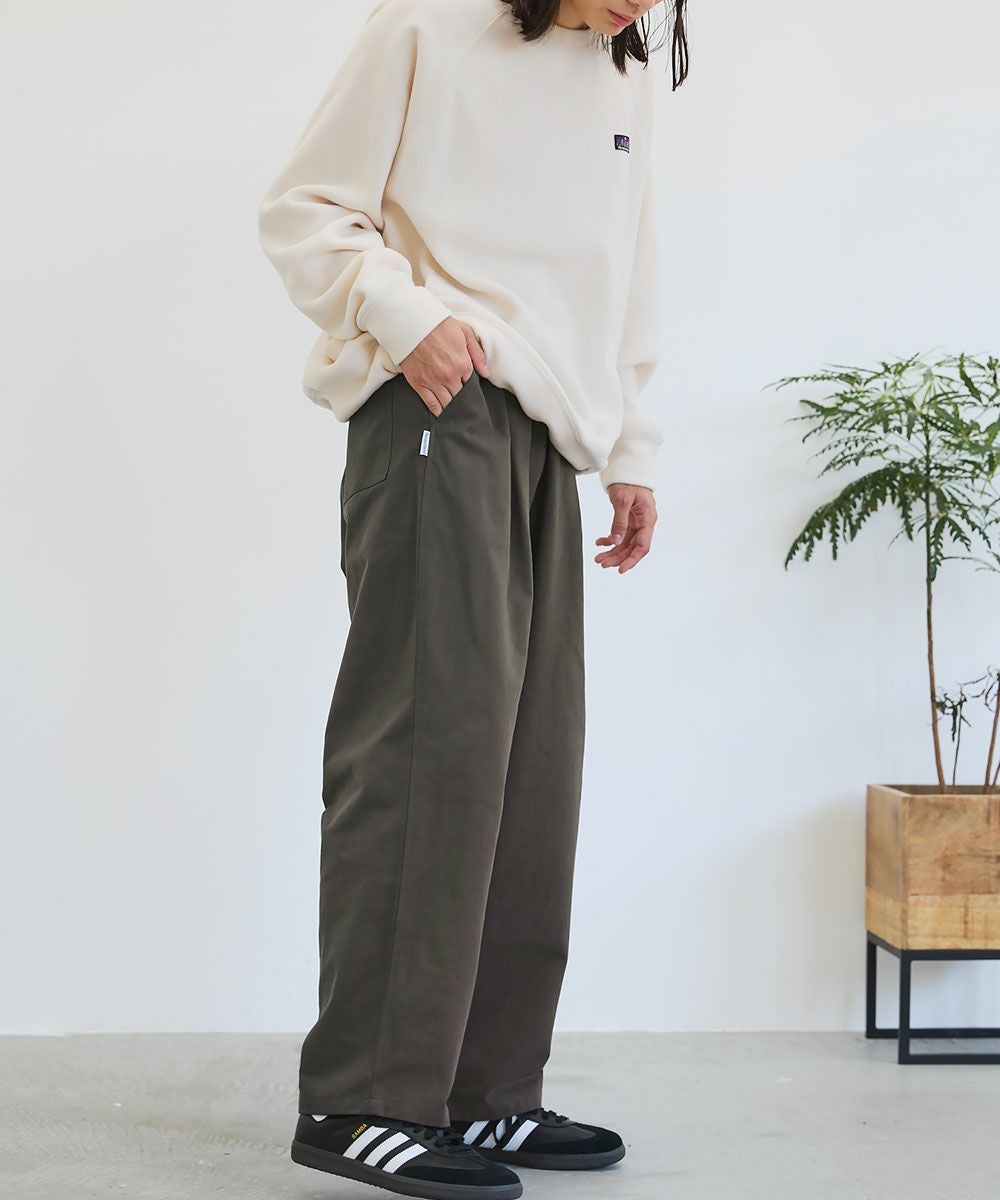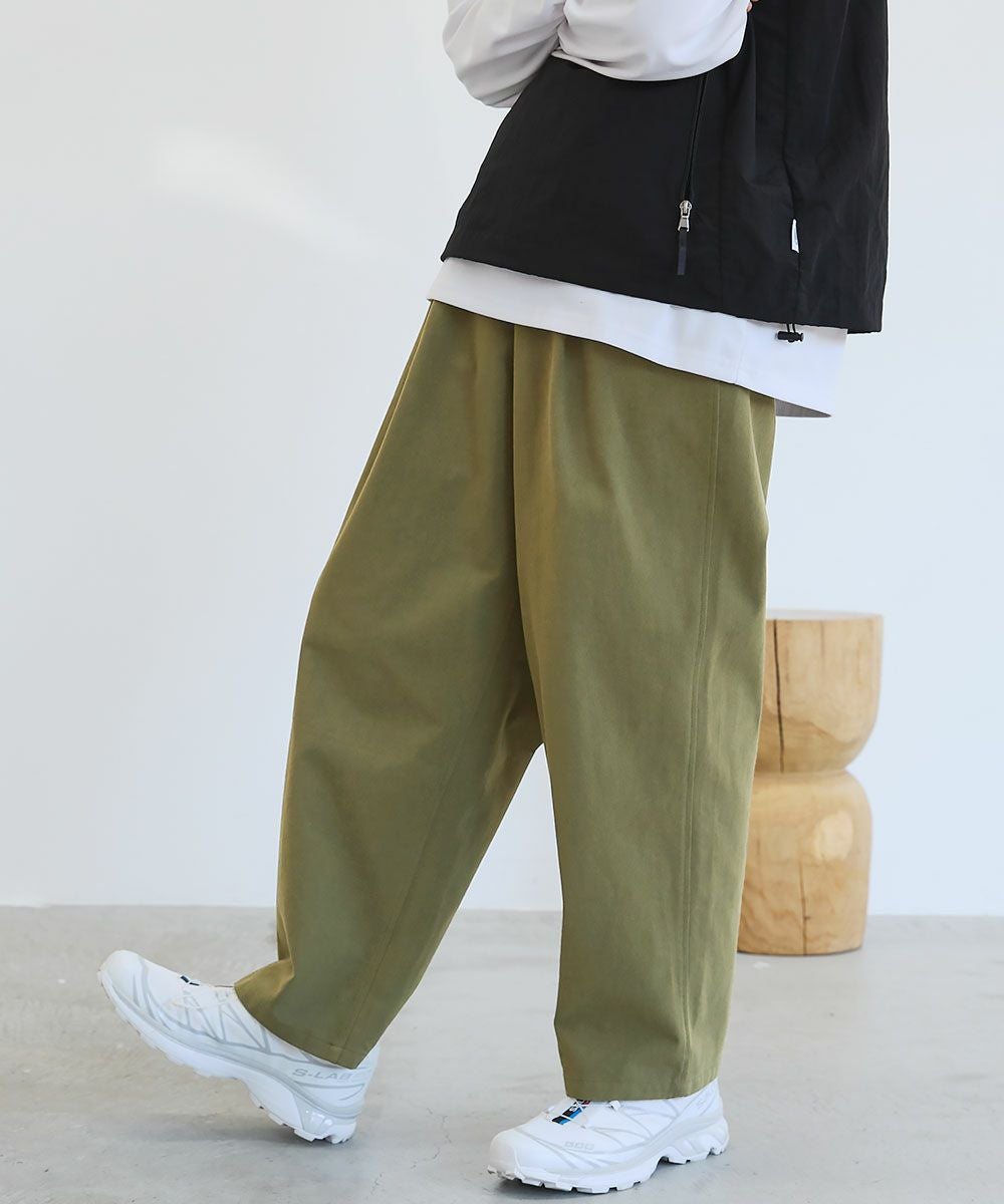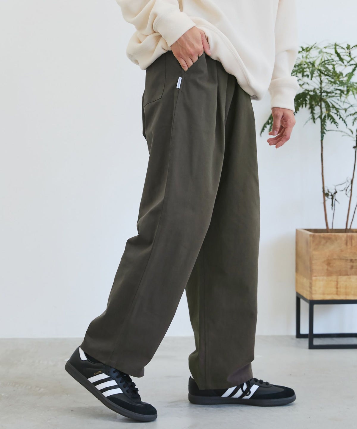 広めのわたりとウエストに入れたワンタックでボリューム感のあるシルエットを作り出しました。このシルエットならトップスにオーバーサイズのものを合わせてもバランス良くかっこよくまとまります。サイドポケット横に付けたブランドピスネームは、ちらりと見えるお洒落なアクセントです。