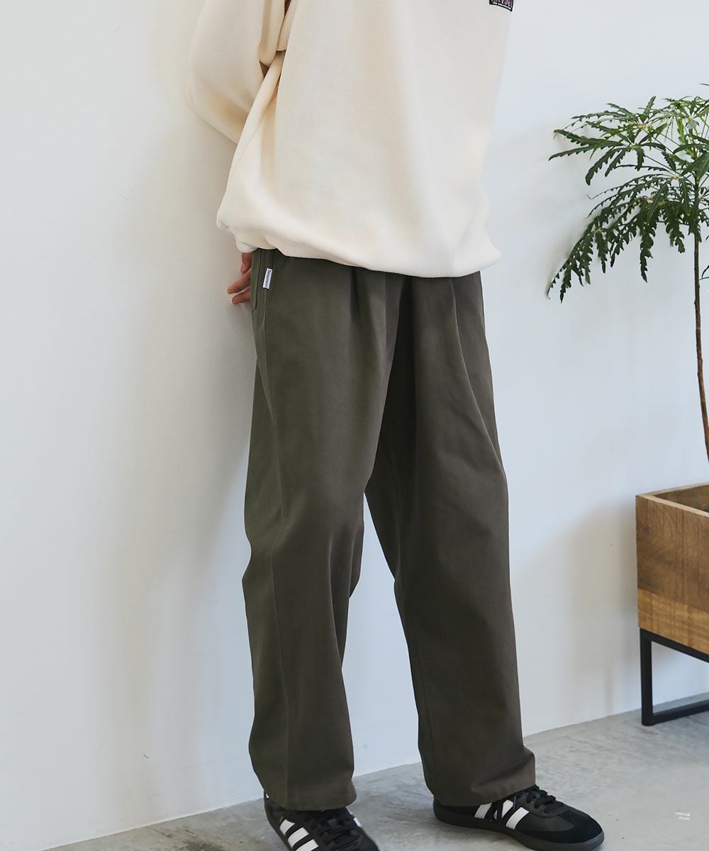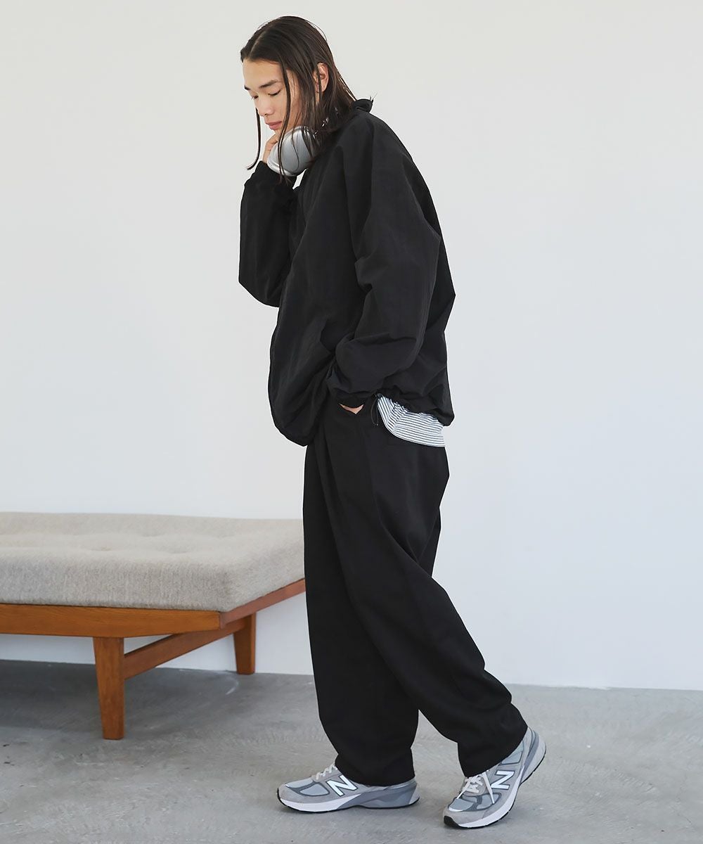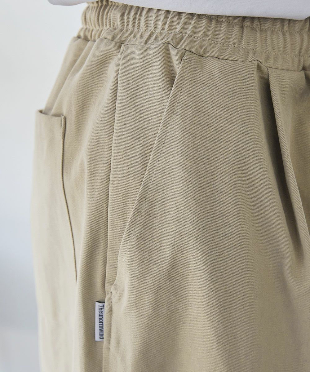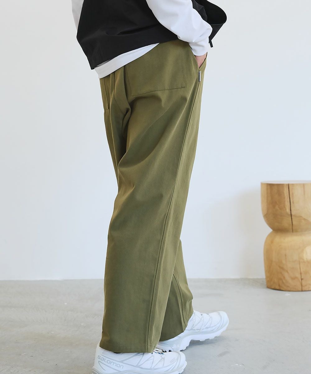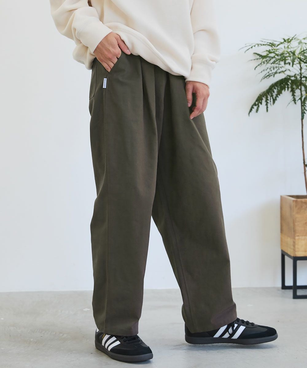 広めのわたりとウエストに入れたワンタックでボリューム感のあるシルエットを作り出しました。このシルエットならトップスにオーバーサイズのものを合わせてもバランス良くかっこよくまとまります。サイドポケット横に付けたブランドピスネームは、ちらりと見えるお洒落なアクセントです。
