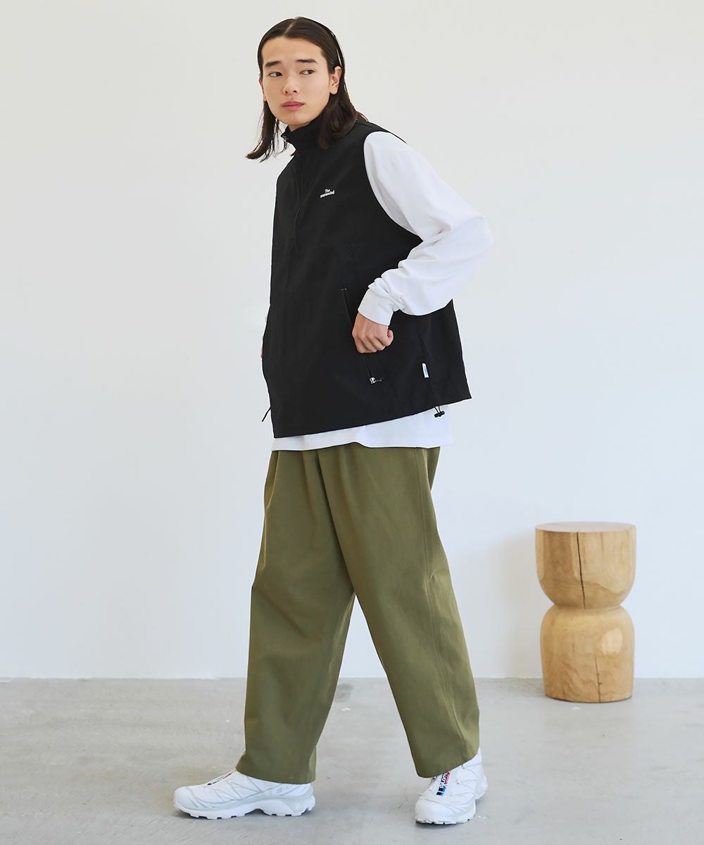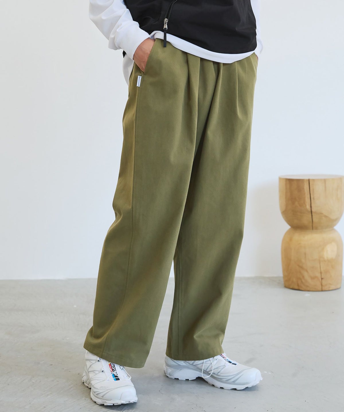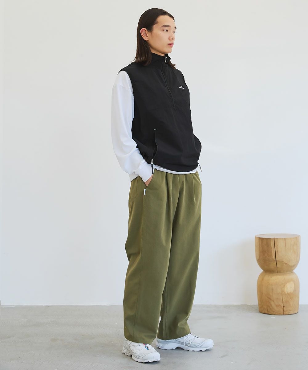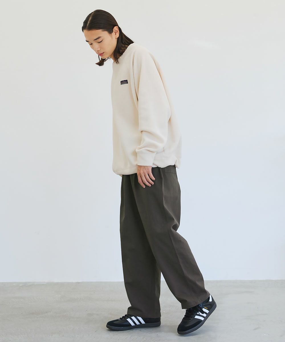 広めのわたりとウエストに入れたワンタックでボリューム感のあるシルエットを作り出しました。このシルエットならトップスにオーバーサイズのものを合わせてもバランス良くかっこよくまとまります。サイドポケット横に付けたブランドピスネームは、ちらりと見えるお洒落なアクセントです。