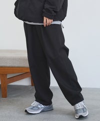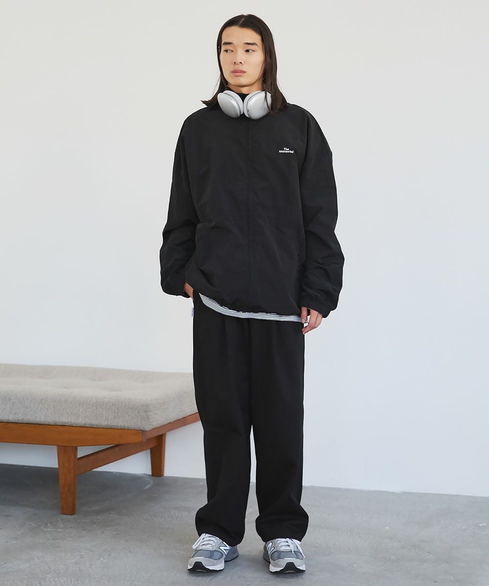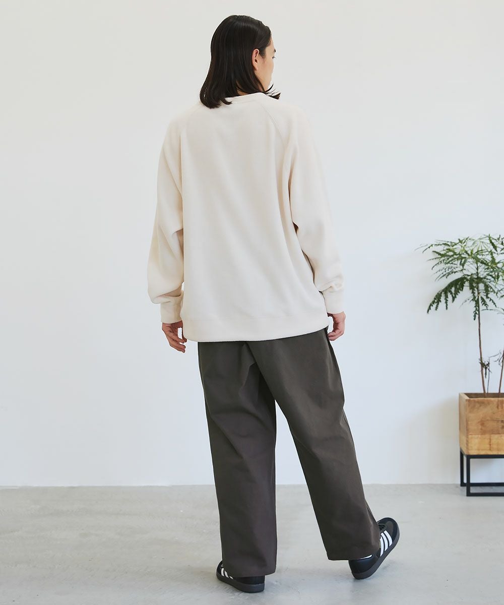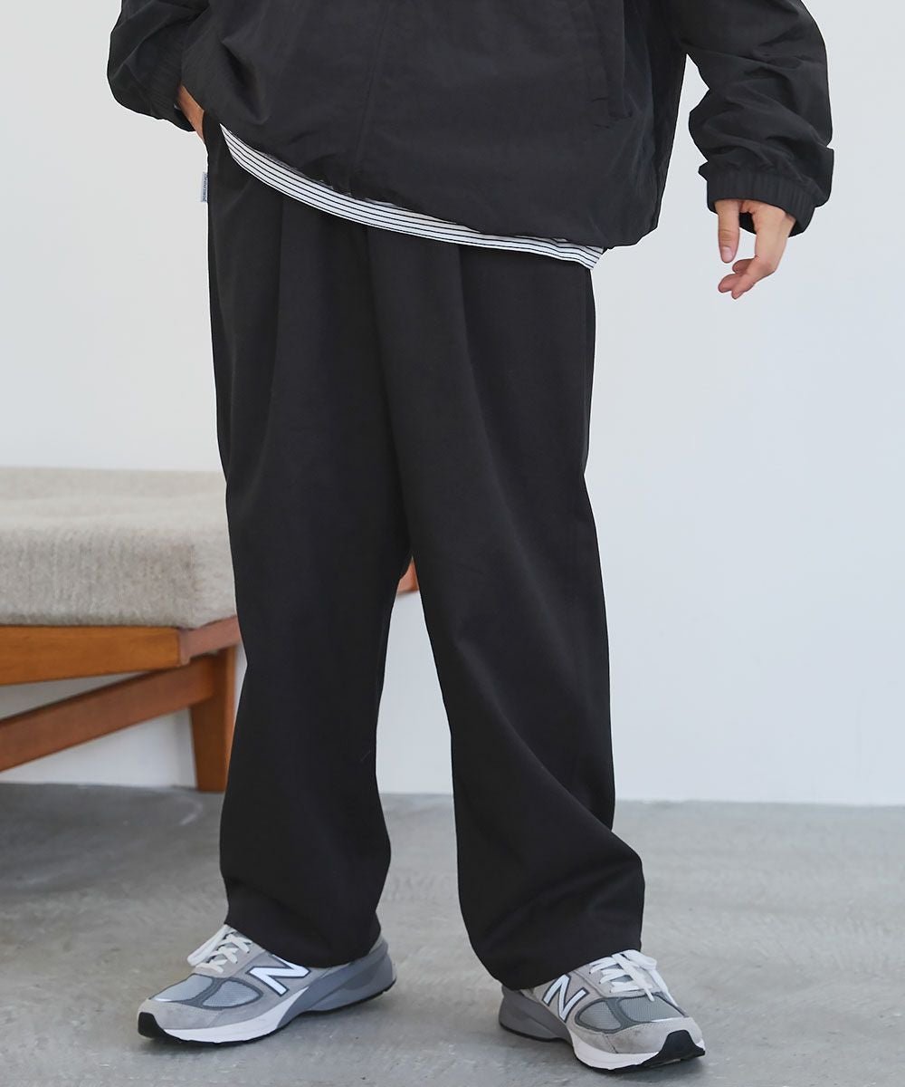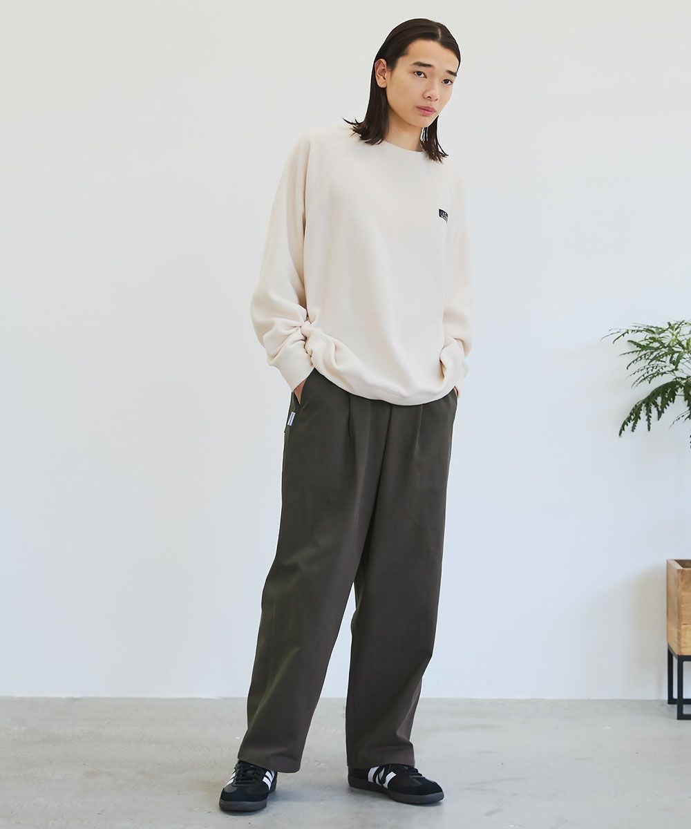 広めのわたりとウエストに入れたワンタックでボリューム感のあるシルエットを作り出しました。このシルエットならトップスにオーバーサイズのものを合わせてもバランス良くかっこよくまとまります。サイドポケット横に付けたブランドピスネームは、ちらりと見えるお洒落なアクセントです。