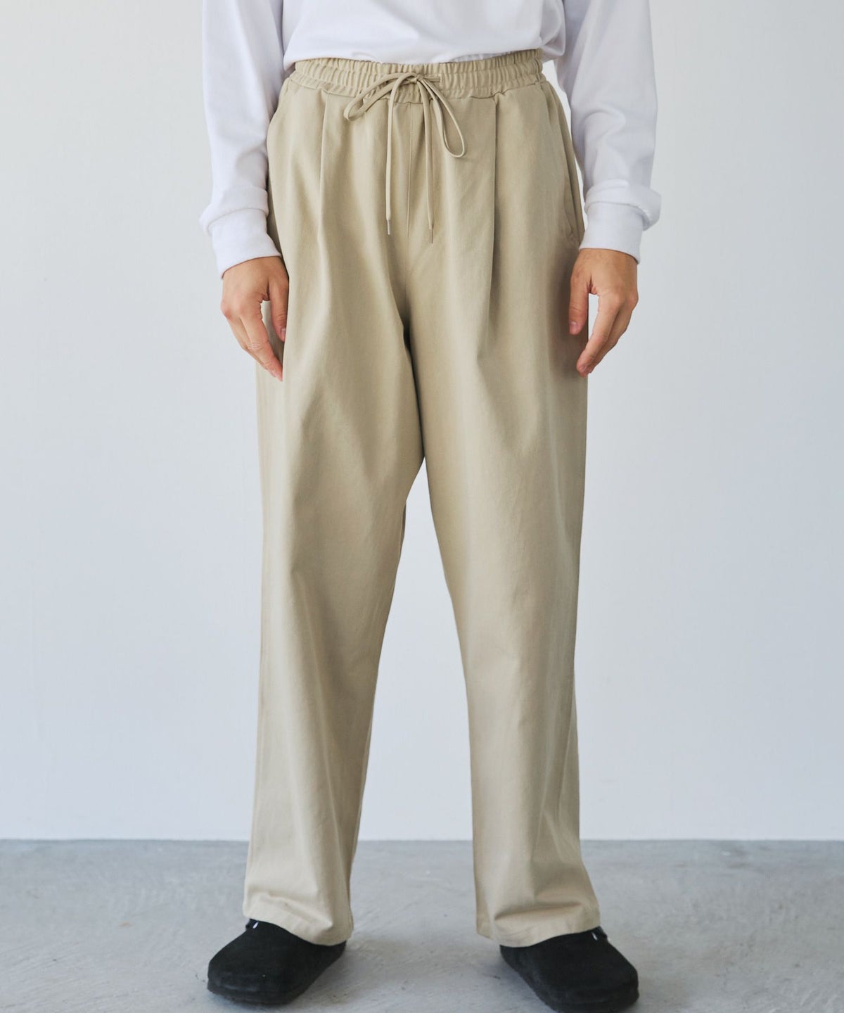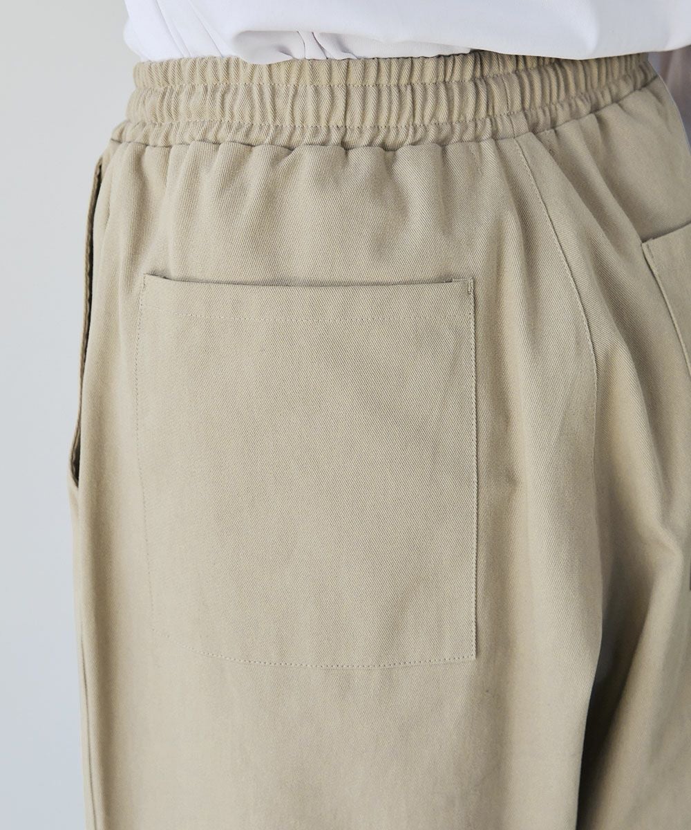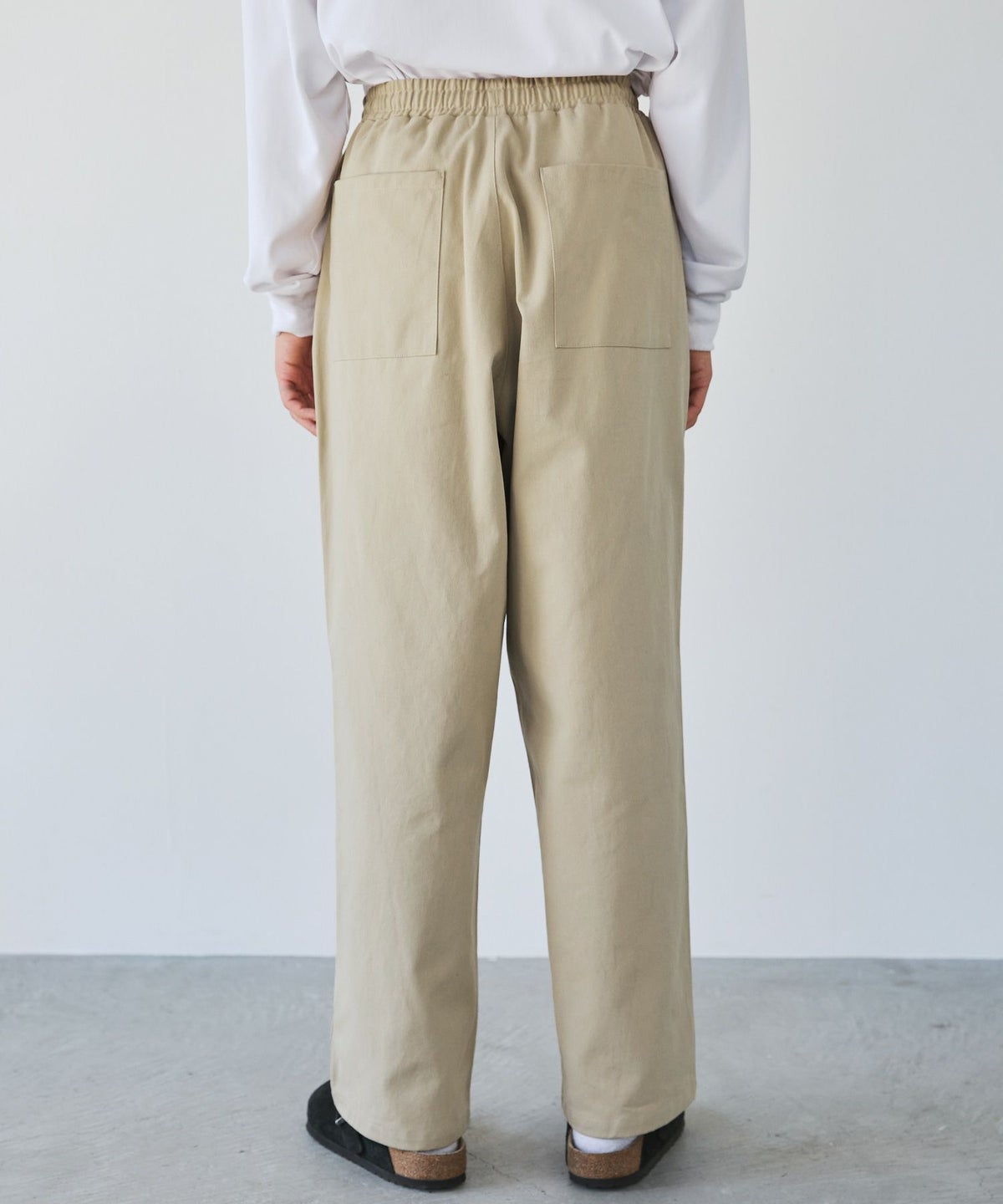 肌に優しい綿100%チノ生地に、ぐるりと全周ゴムが入ったイージー仕様のウエスト、窮屈感のないゆったりシルエットで、毎日でも穿きたくなるようなラクな穿き心地のパンツに仕上げました。シーズン問わずに着回せて、穿き心地も文句なし。色違いも持っておきたくなる万能チノパンです。