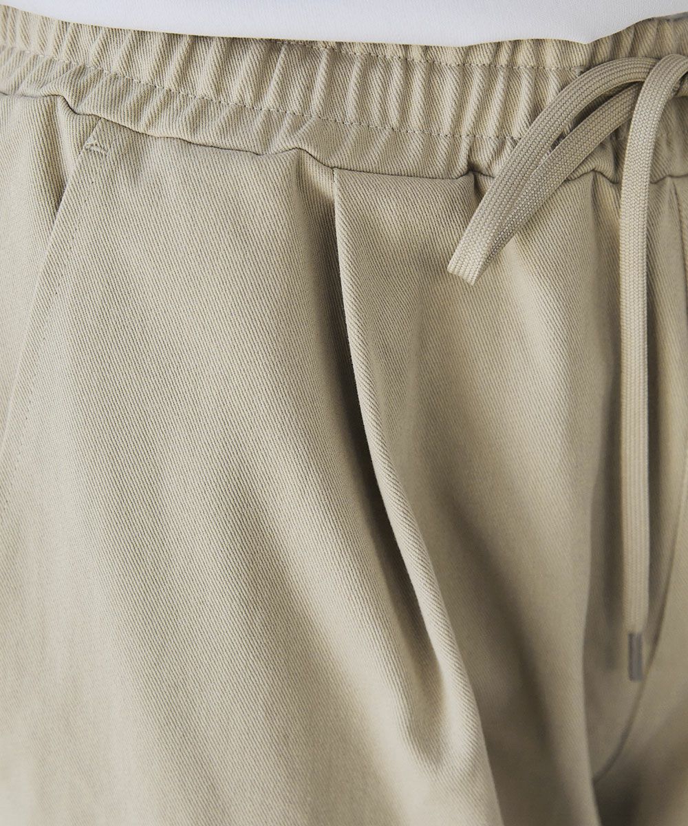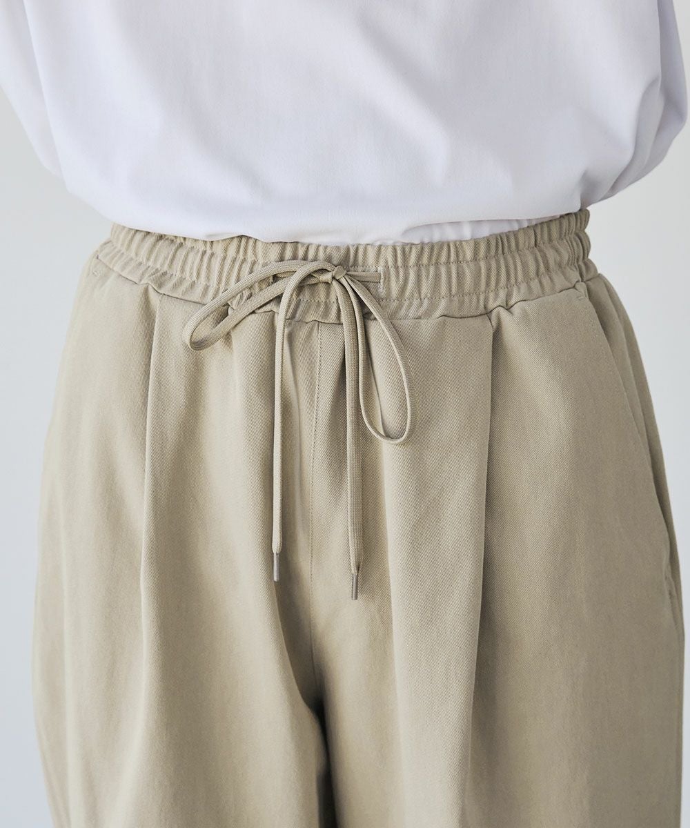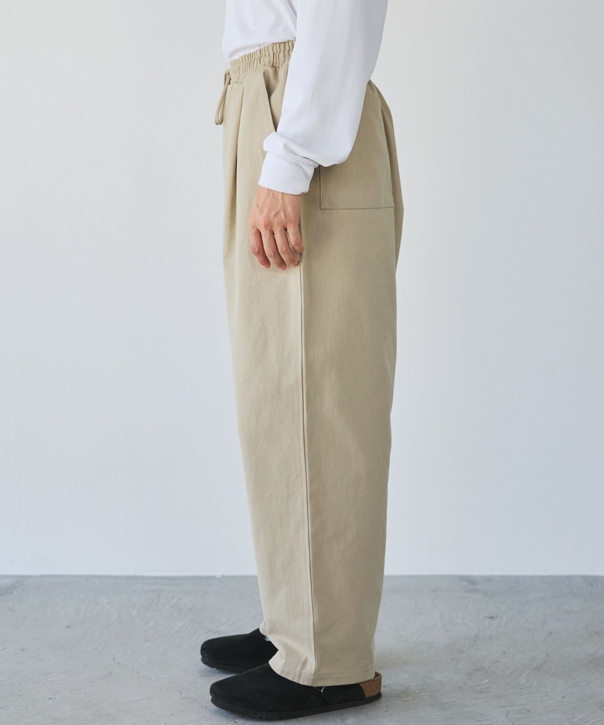 肌に優しい綿100%チノ生地に、ぐるりと全周ゴムが入ったイージー仕様のウエスト、窮屈感のないゆったりシルエットで、毎日でも穿きたくなるようなラクな穿き心地のパンツに仕上げました。シーズン問わずに着回せて、穿き心地も文句なし。色違いも持っておきたくなる万能チノパンです。