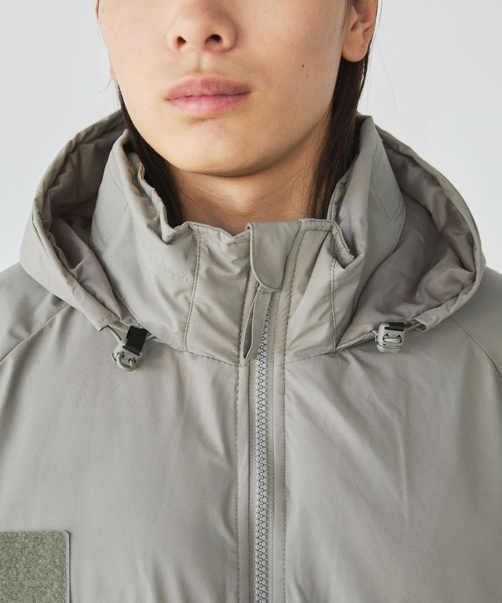 首元までしっかり温かいスタンドネックと、マジックテープ仕様の袖で冷気の侵入を防ぐ防寒性の高さも魅力的。裾に付いたドローコードは、絞り具合で裾の広がりを軽減して気密性を高めることができるだけでなく、丈感の変化で様々なシルエットを楽しめます。襟の内側に収納できるフードや胸元のベルクロパッチ、肘のエルボーパッチデザインなど、ミリタリーらしいディテールもデザイン性を高めるポイント。フロントファスナーにはスライダーが顔に当たるのを防ぐためにフラップを被せました。また、両サイドに設置したファスナーポケットはしっかりと大きく、ハンドウォームとしても機能する袋地がついています。