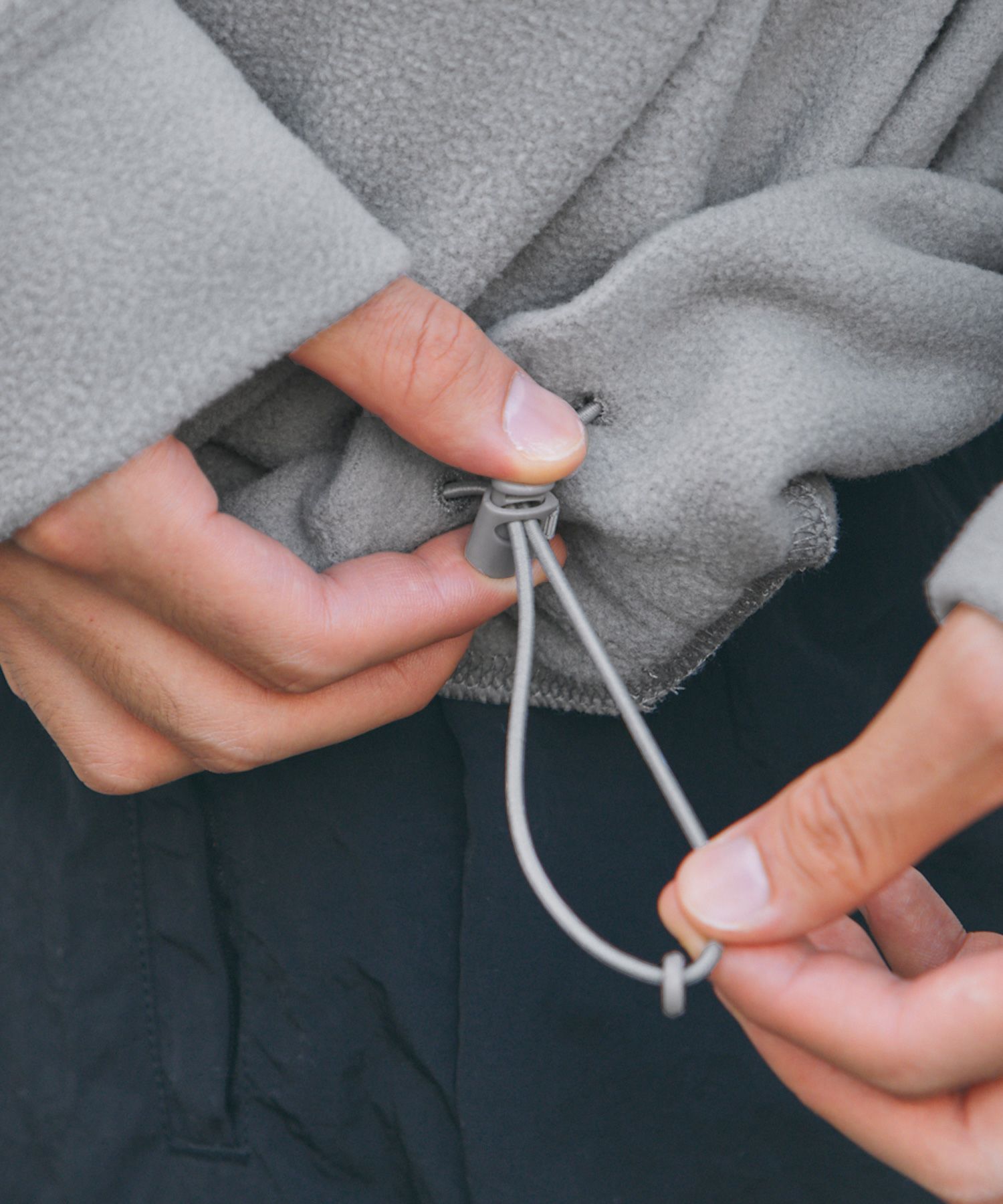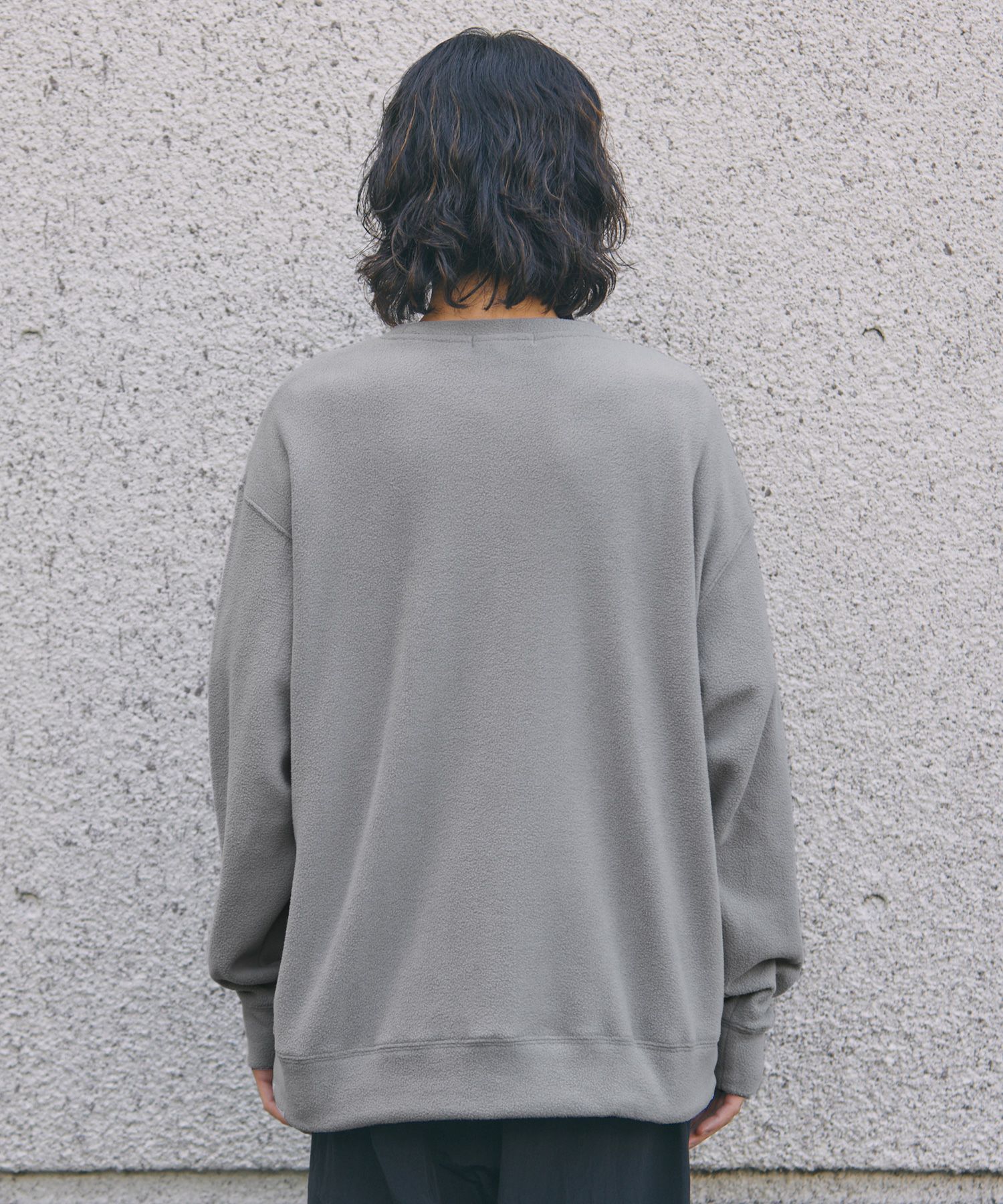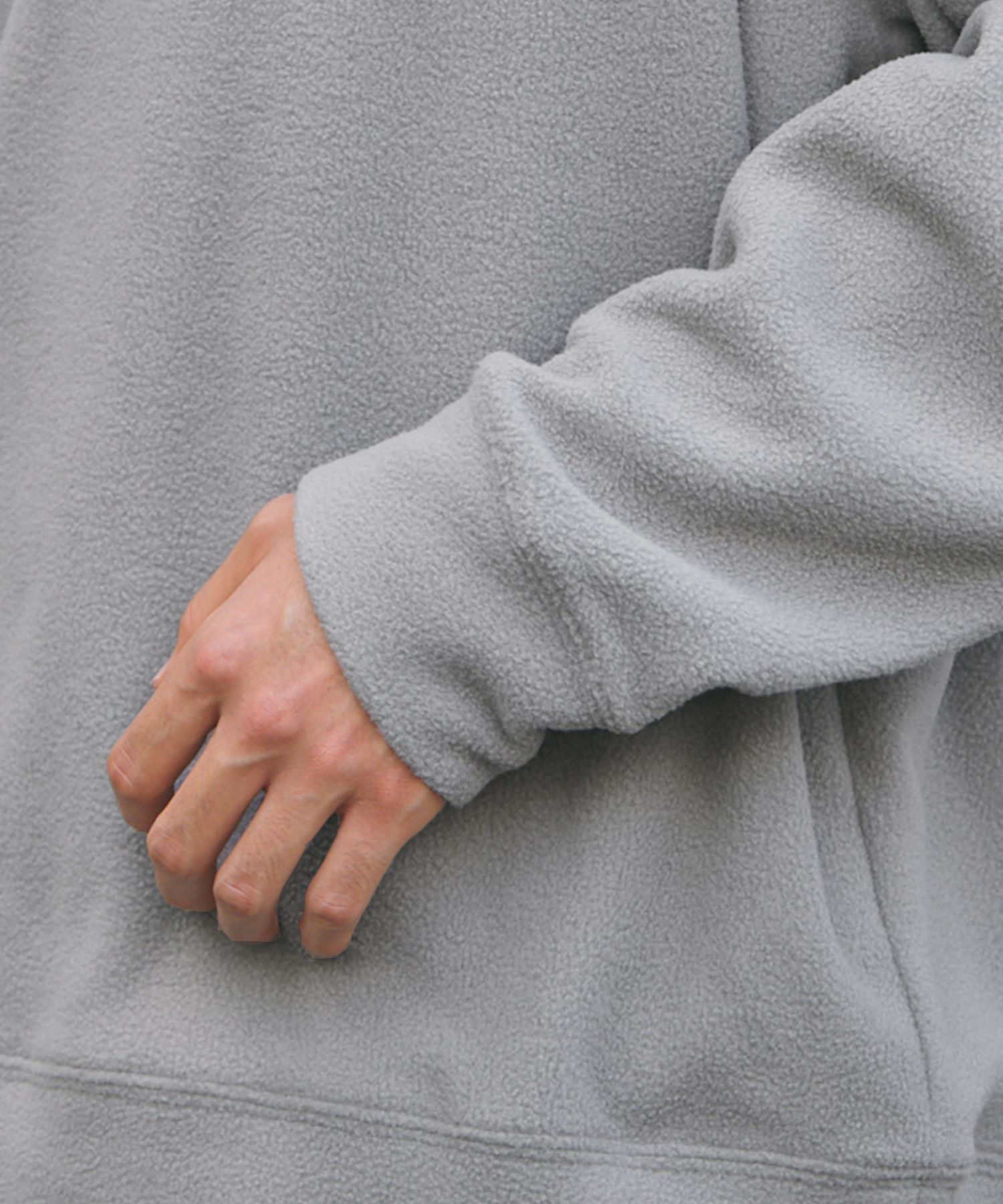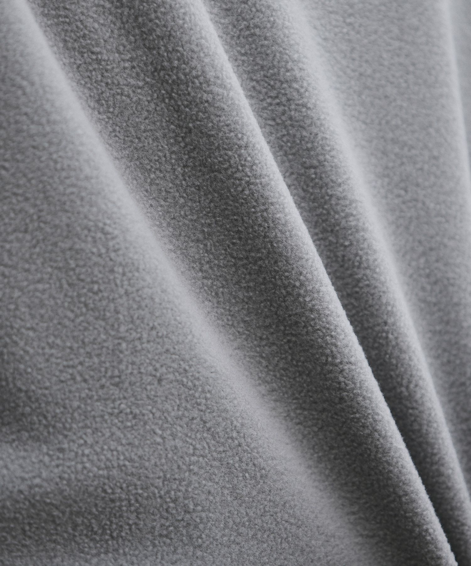 生地にはポリエステル100%フリースを採用しました。ふんわり起毛した柔らかい生地が特徴で素肌を優しく包み込みます。起毛した繊維の間に空気の層ができるため、体から出る熱を逃しません。シワにもなりにくく、軽量性と保温性を併せ持ったデイリー向けの素材です。
