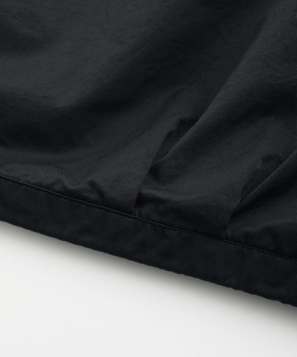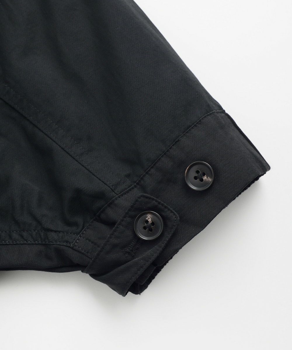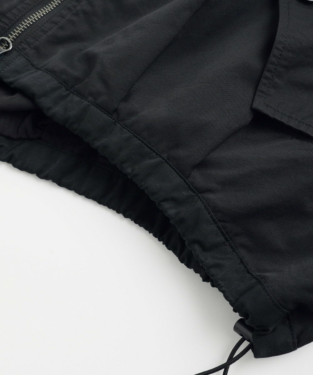 首元はボタンを留めるとスタンドカラーにもなる2way仕様。ジップは着こなしのアレンジが広がるダブルジップを採用しました。フロントのフラップポケットにはボタンも配しており、デザイン性と物を落としにくい収納力を兼ね備えています。裾のドローコードや袖口のボタンで広がりを調整し、様々なシルエットを楽しむことも可能。ヴィンテージライクな印象を演出するべっこう調のボタンを採用したり、裏地にシャドーストライプ柄を入れたりと細かいディテールにもこだわったアイテムです。袖部分の裏地だけは、滑りの良いポリエステル100%生地となっております。