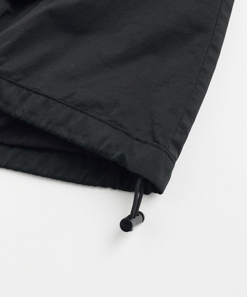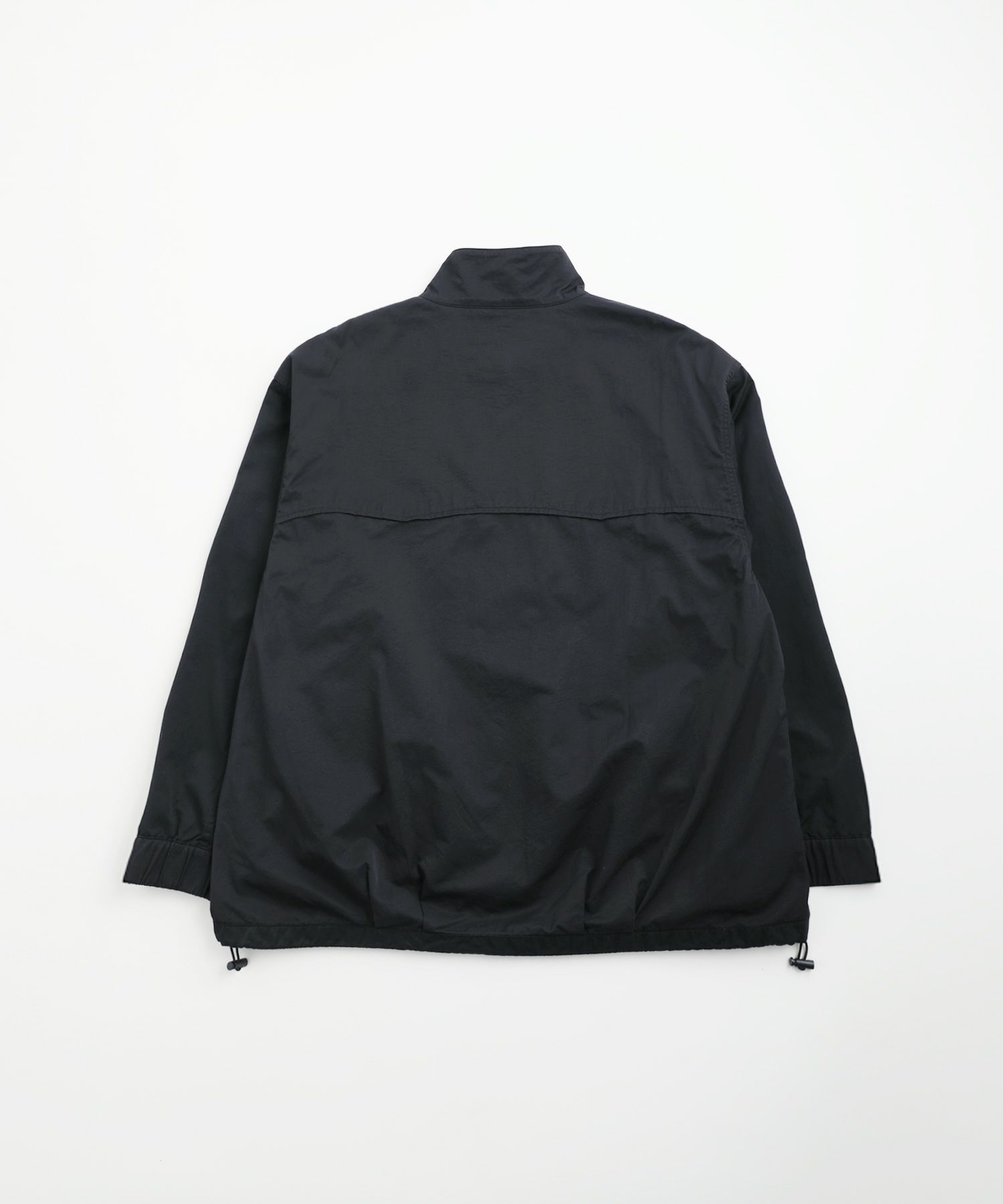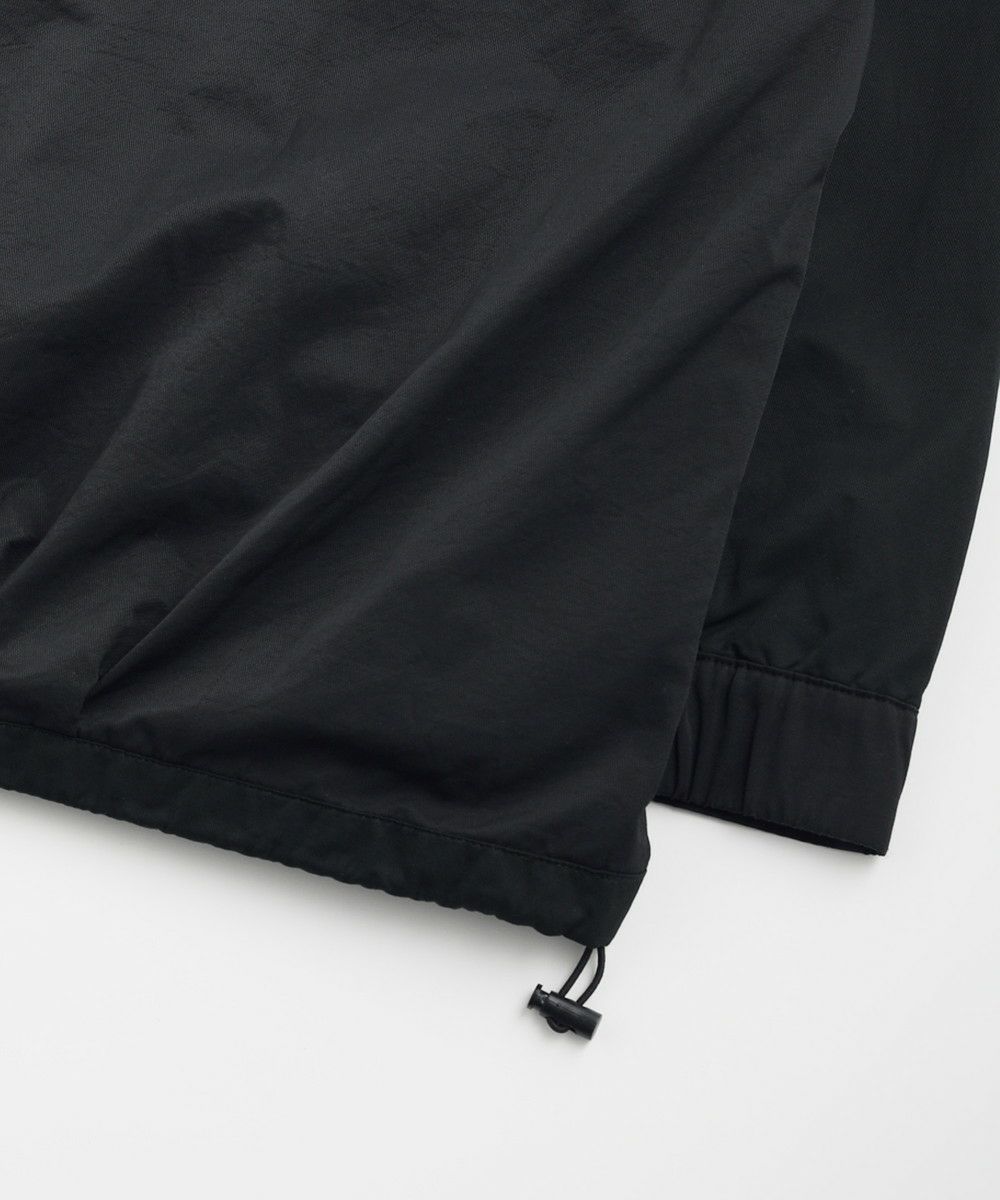 首元はボタンを留めるとスタンドカラーにもなる2way仕様。ジップは着こなしのアレンジが広がるダブルジップを採用しました。フロントのフラップポケットにはボタンも配しており、デザイン性と物を落としにくい収納力を兼ね備えています。裾のドローコードや袖口のボタンで広がりを調整し、様々なシルエットを楽しむことも可能。ヴィンテージライクな印象を演出するべっこう調のボタンを採用したり、裏地にシャドーストライプ柄を入れたりと細かいディテールにもこだわったアイテムです。袖部分の裏地だけは、滑りの良いポリエステル100%生地となっております。