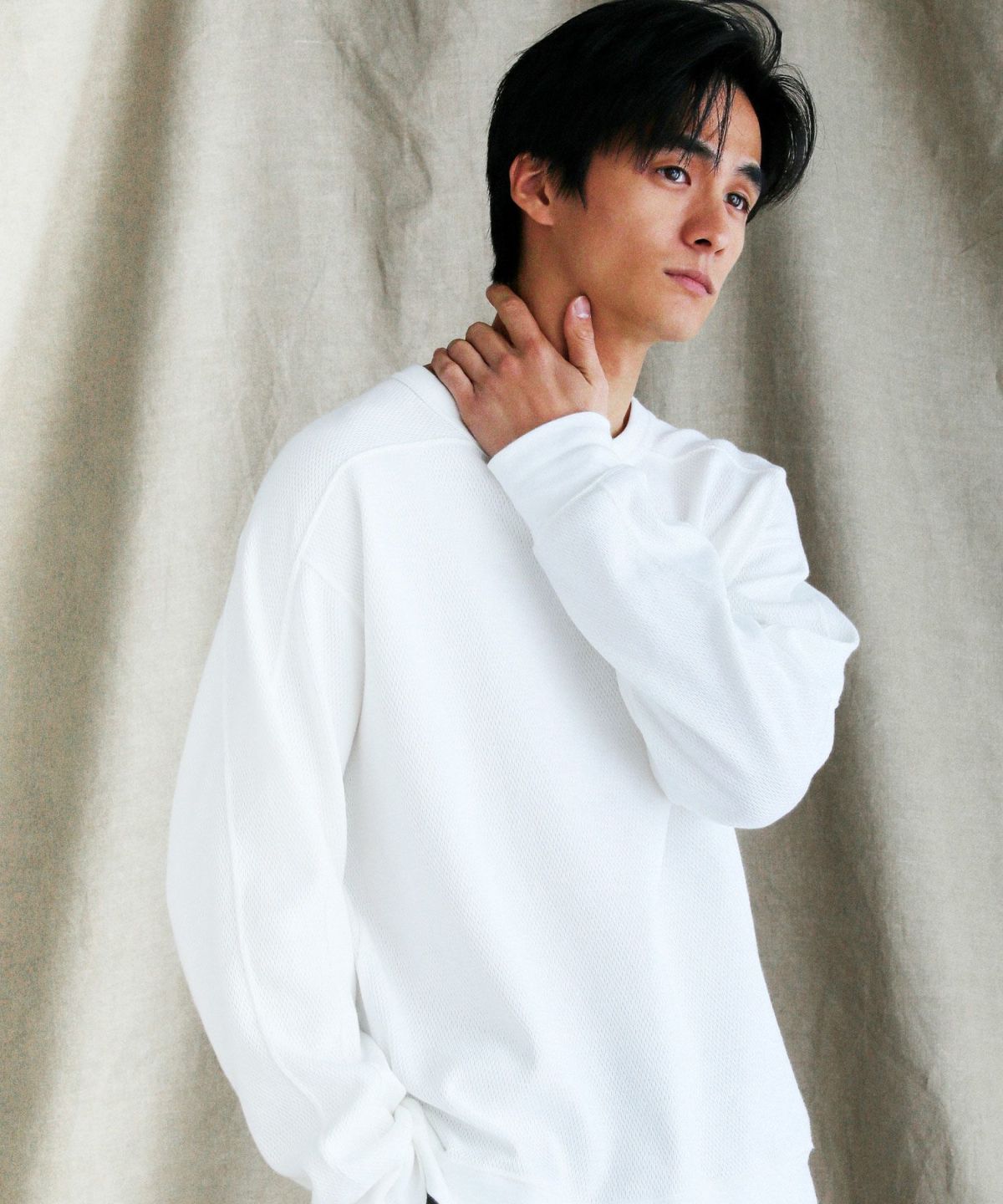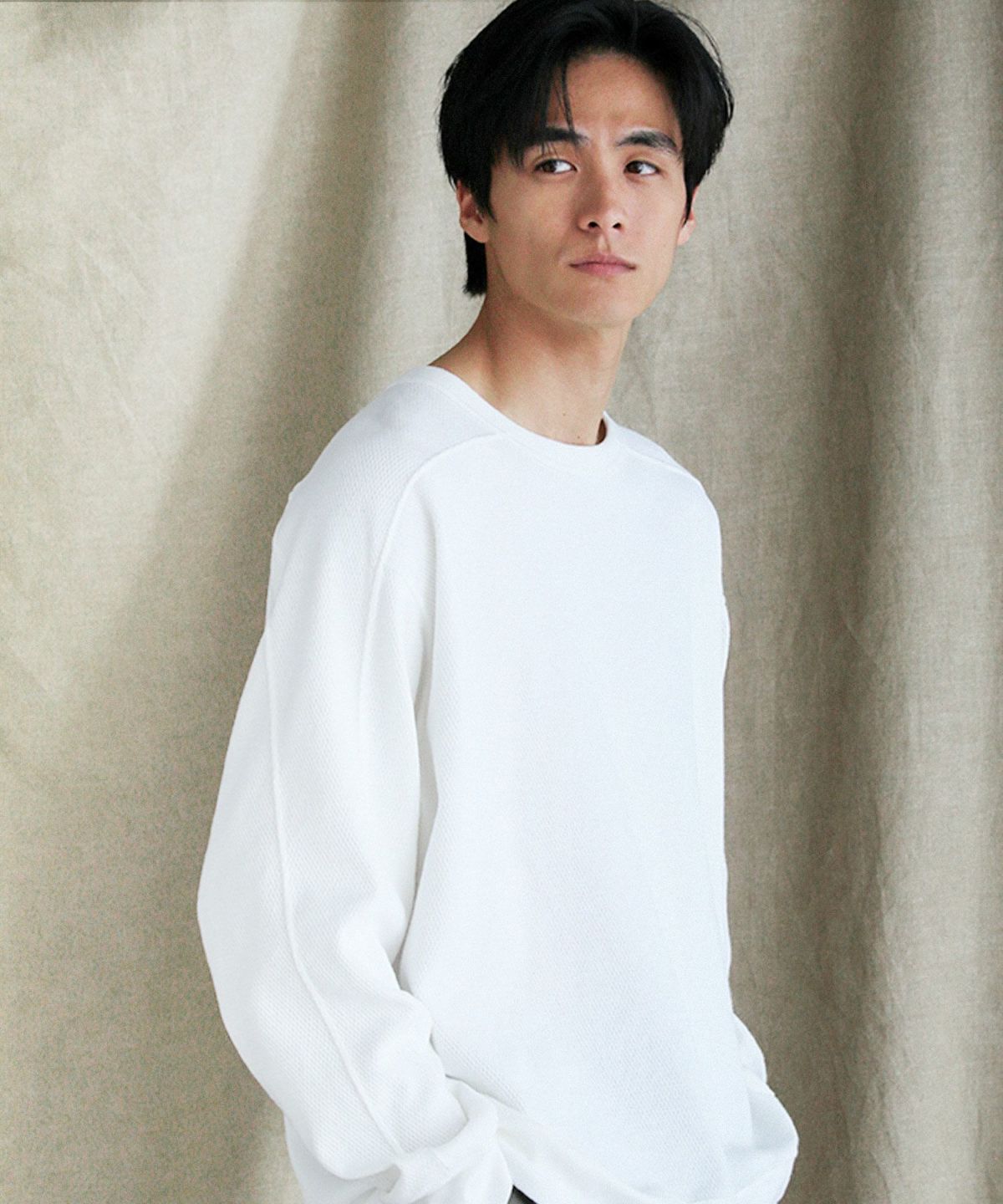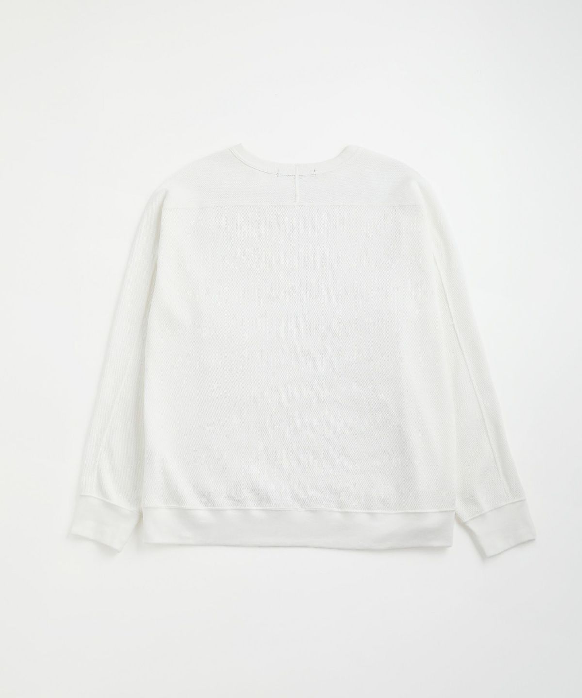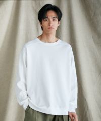 首元のデザインは、襟ぐりに程良いゆとりのあるベーシックなクルーネックを採用。サイドにはネックラインから袖先にかけて走る切り替えデザインを入れています。上と下とで袖付けの仕様が異なるスプリットラグランスリーブを採用することで見た目のスタイリッシュさと肩回りの楽さを両立させました。ゆとりのあるシルエットが動きやすく、ストレスフリーな着心地でお召しいただけます。