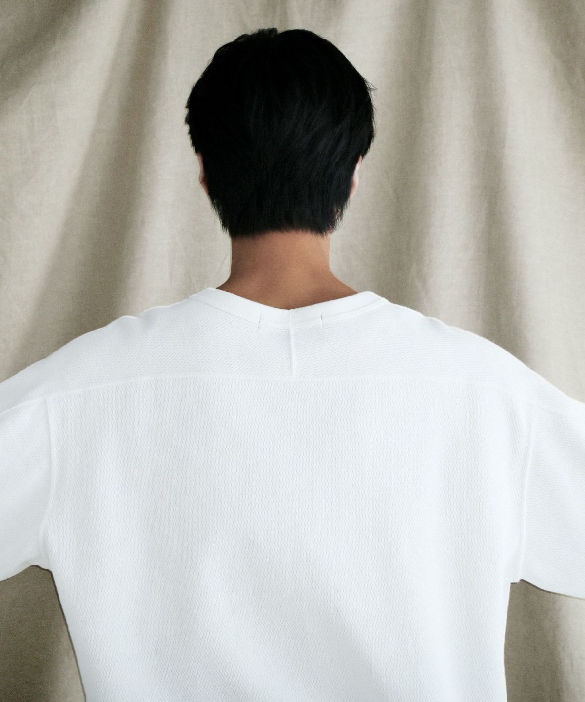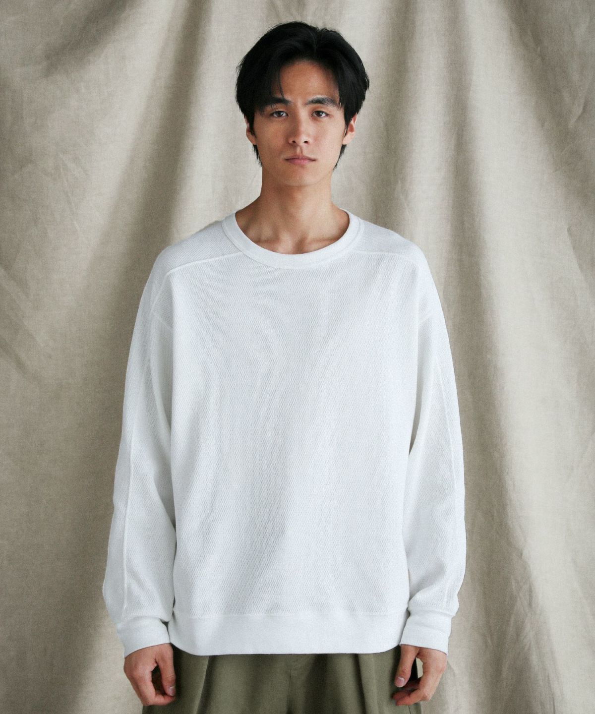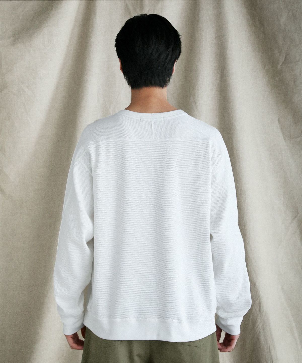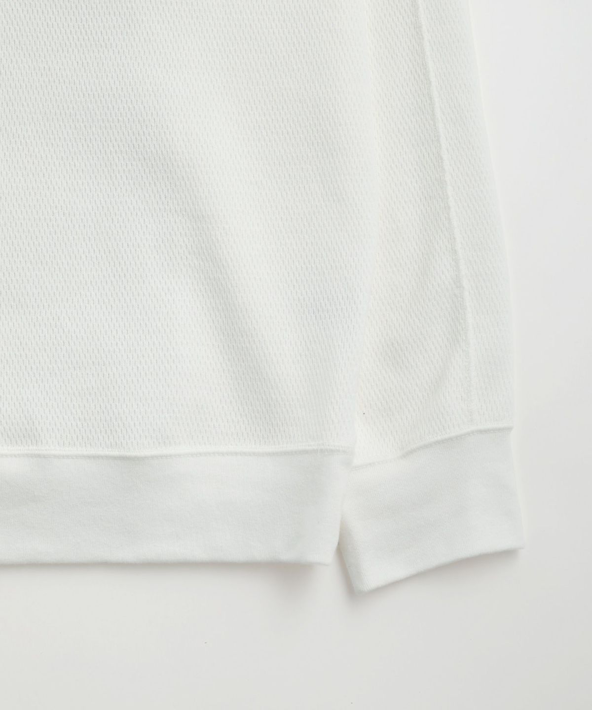 和歌山県で編み立てた、シャリ感のある生地感とさらっとしたドライな着心地が特長の空紡糸コットンニットを使用しています。空紡糸は空気圧で繊維を撚り合わせるという特殊な紡績で作られる、空気を含みやすいふっくらとした風合いが魅力の糸です。この糸を用いた今回のニット地は9オンスのしっかりとした肉厚感がある一方で、糸の芯部はソフトなので着心地は快適です。通常のスウェットなどと比べても乾きやすく、シワになりにくいのもポイント。シンプルながらも生地表面のハニカム構造をした細かい凹凸が奥行きのある表情を作り出しています。