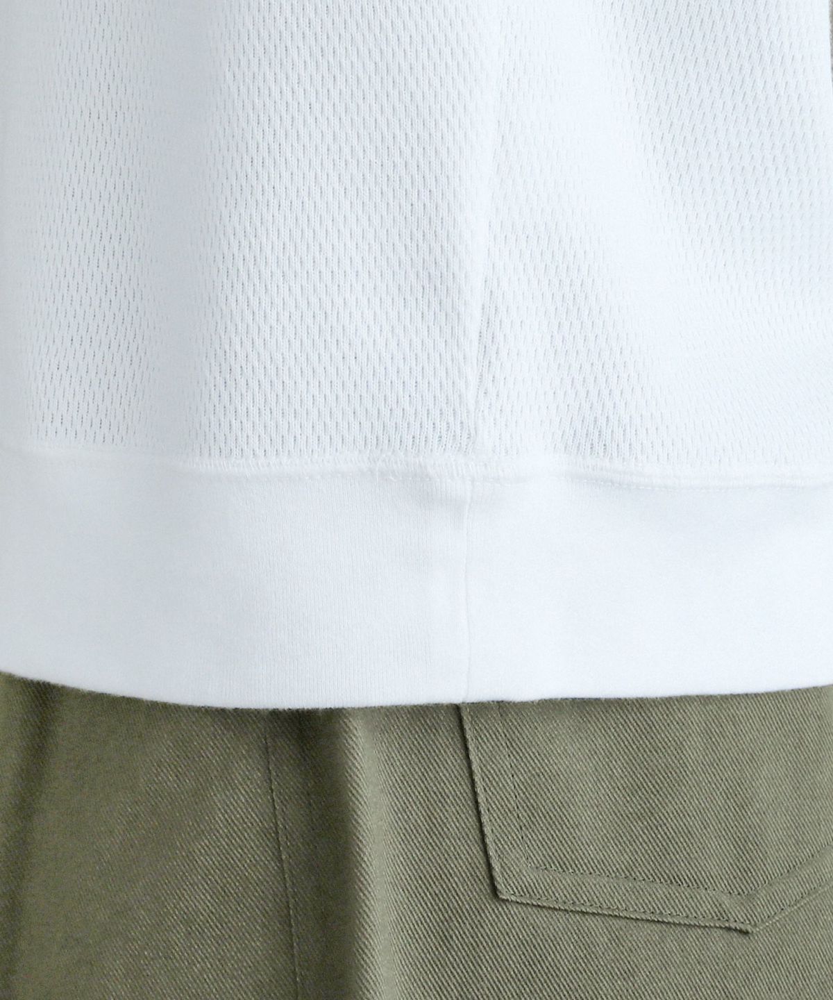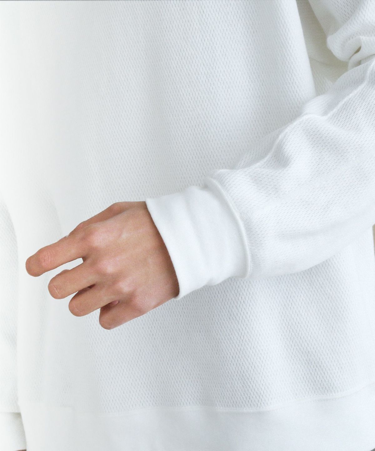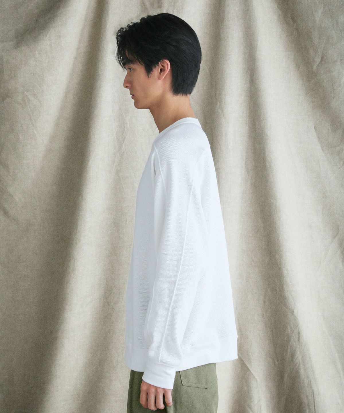 和歌山県で編み立てた、シャリ感のある生地感とさらっとしたドライな着心地が特長の空紡糸コットンニットを使用しています。空紡糸は空気圧で繊維を撚り合わせるという特殊な紡績で作られる、空気を含みやすいふっくらとした風合いが魅力の糸です。この糸を用いた今回のニット地は9オンスのしっかりとした肉厚感がある一方で、糸の芯部はソフトなので着心地は快適です。通常のスウェットなどと比べても乾きやすく、シワになりにくいのもポイント。シンプルながらも生地表面のハニカム構造をした細かい凹凸が奥行きのある表情を作り出しています。