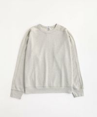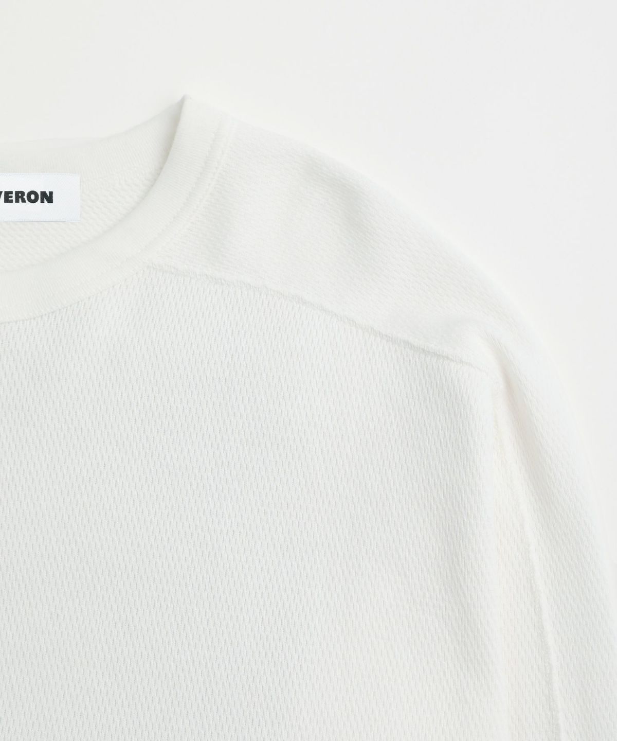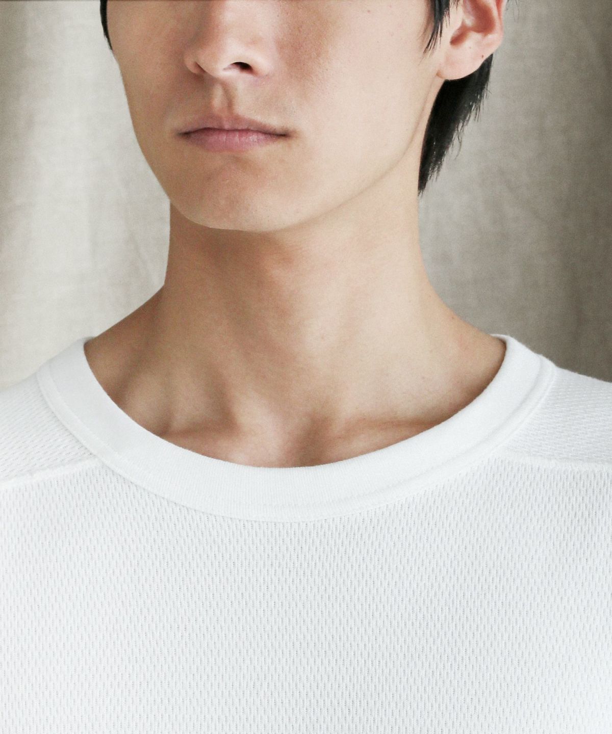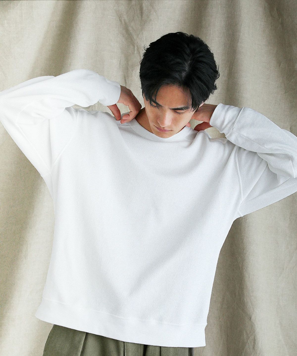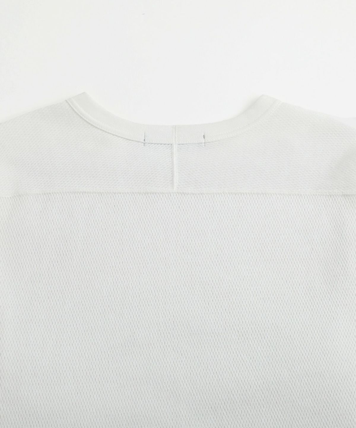 和歌山県で編み立てた、シャリ感のある生地感とさらっとしたドライな着心地が特長の空紡糸コットンニットを使用しています。空紡糸は空気圧で繊維を撚り合わせるという特殊な紡績で作られる、空気を含みやすいふっくらとした風合いが魅力の糸です。この糸を用いた今回のニット地は9オンスのしっかりとした肉厚感がある一方で、糸の芯部はソフトなので着心地は快適です。通常のスウェットなどと比べても乾きやすく、シワになりにくいのもポイント。シンプルながらも生地表面のハニカム構造をした細かい凹凸が奥行きのある表情を作り出しています。