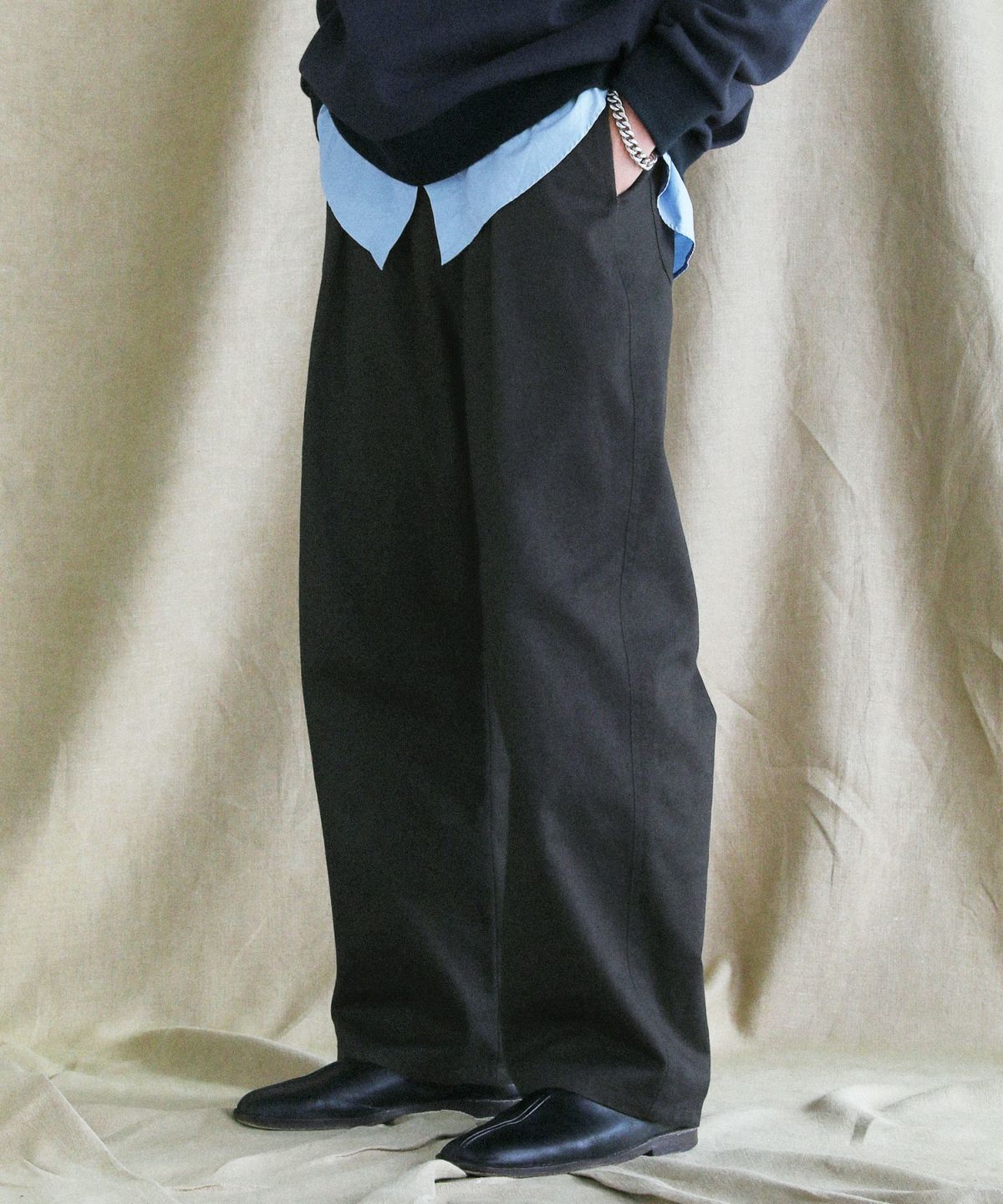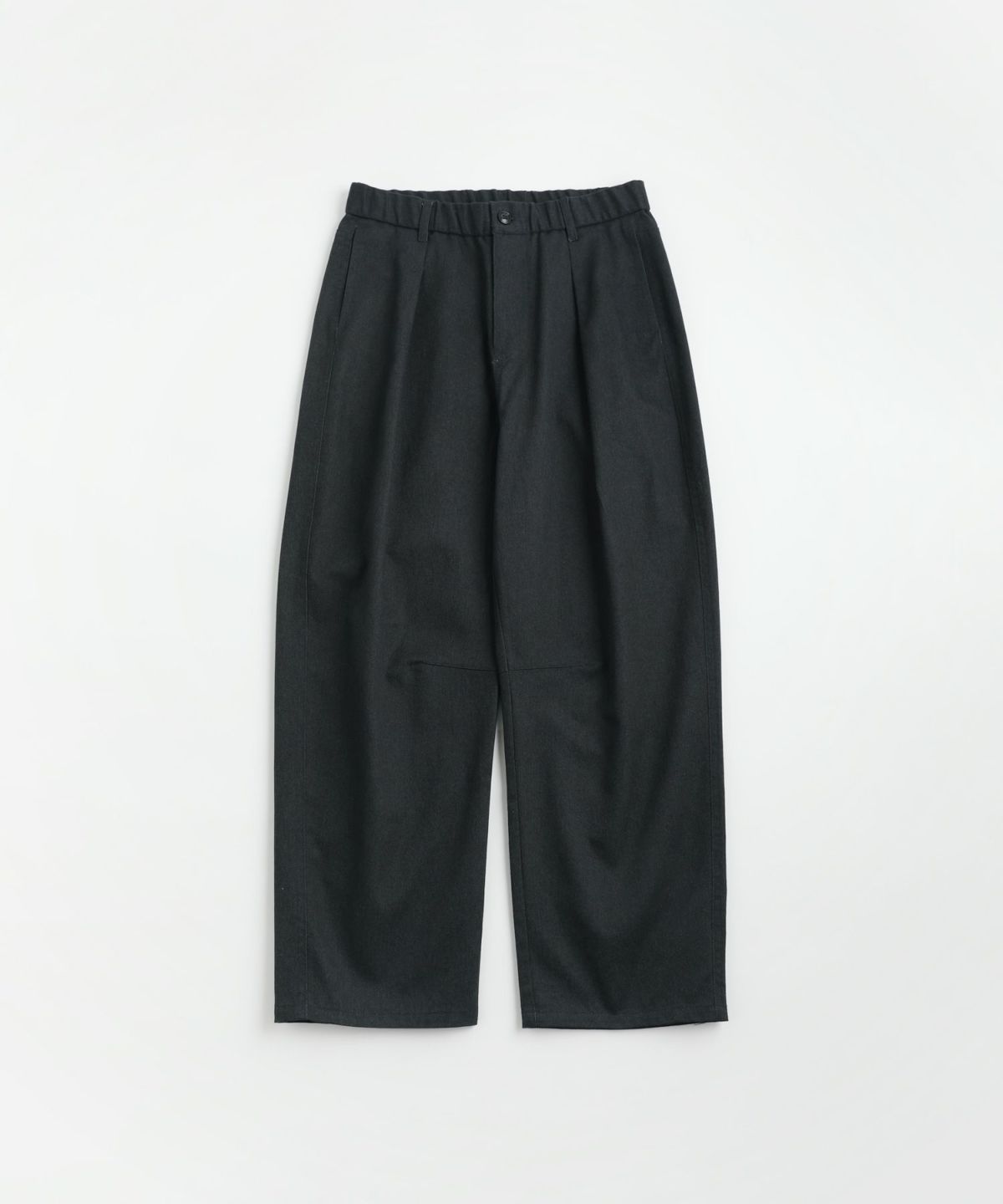 パンツのシルエットは腿から裾にかけて膨らみをつけたバルーン型を採用。緩やかにカーブした上品なシルエットは、リラックス感はありながらラフな雰囲気になりすぎず、大人っぽく穿きこなしていただけます。フロントには深めのワンタックが入っており、立体感のあるシルエットを生み出しました。ウエストはゴムを縫い込みドローコードを配したイージーパンツ仕様で、腰回りに優しくフィットしながら紐を用いての細かいサイズ調整が可能です。さらにベルトループも備えているためベルトを通すこともでき、着こなしに合わせてタックインスタイルもお楽しみいただけます。