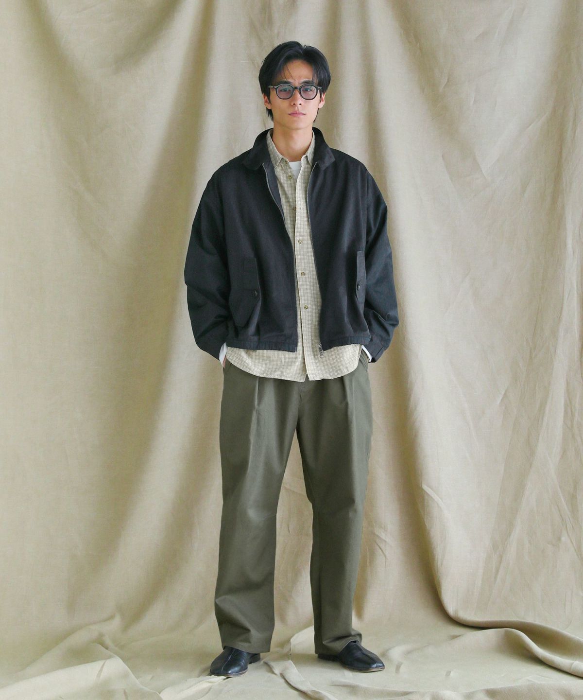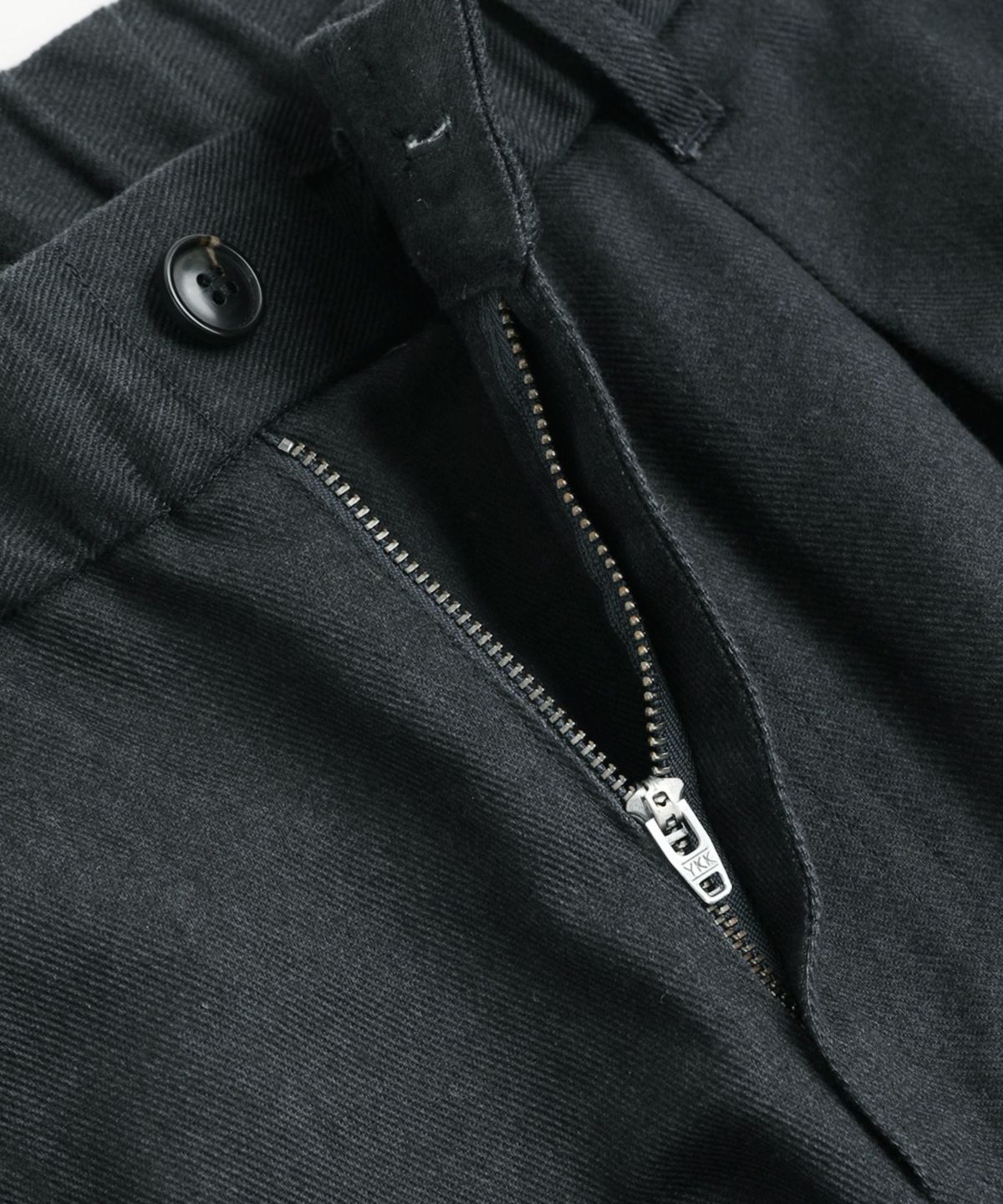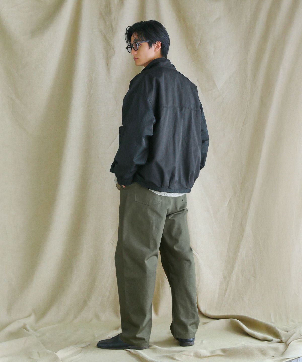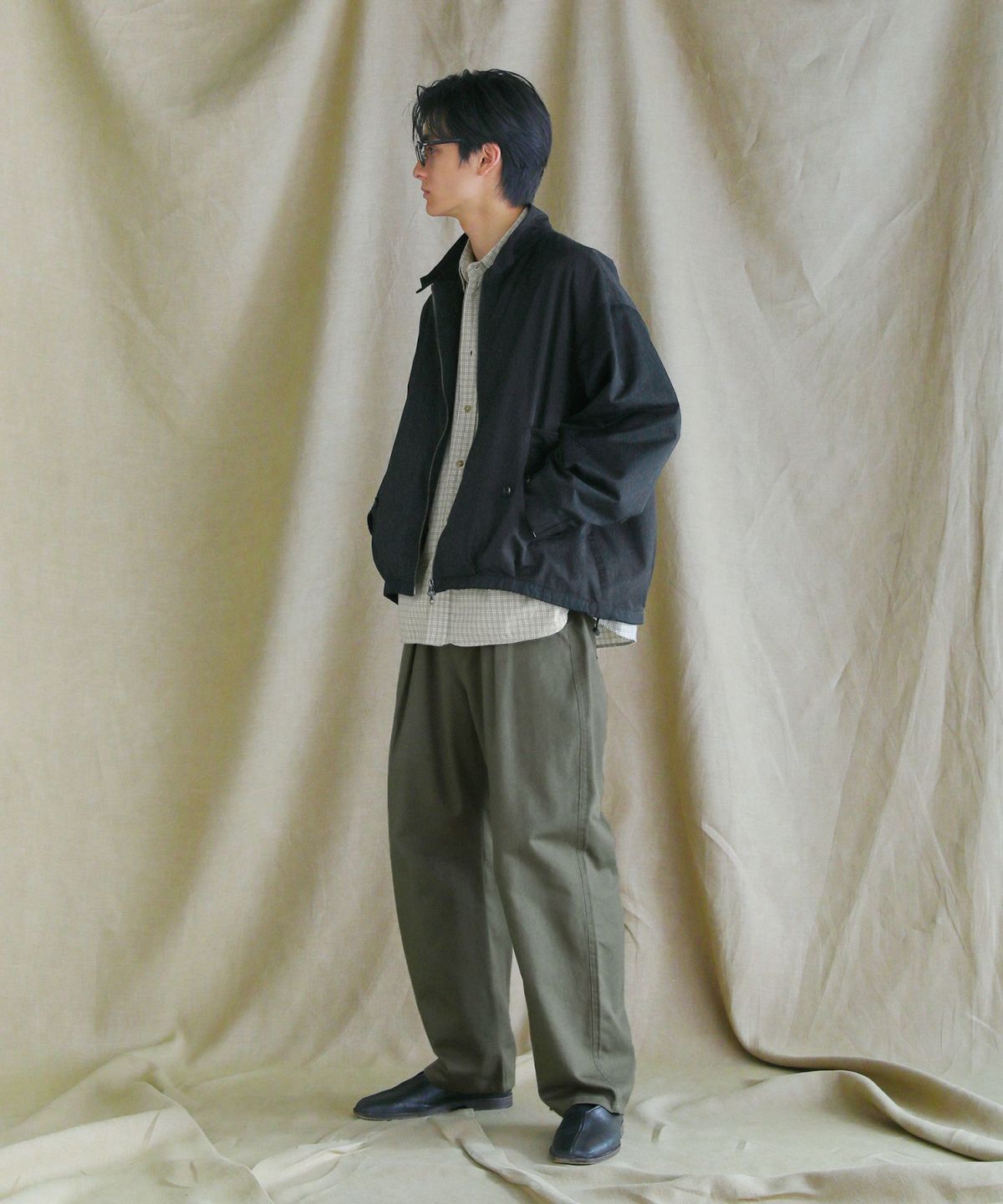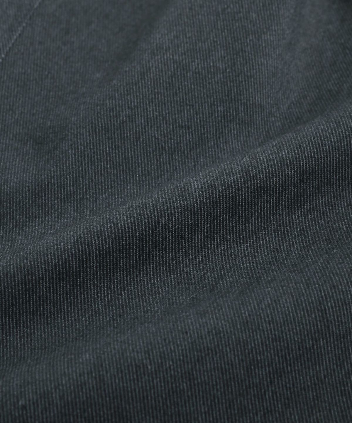 日本三大綿織物産地の一つとして知られる「遠州地方」で染色・加工された綿100%生地を使用しました。表面が滑らかで、ほんのり艶感がある上品な印象のツイル生地です。丈夫でシワになりにくい中厚の生地でありながら、柔らかな生地感で履き心地の良さも兼ね備えています。自然なウォッシュ感を加工で表現しており、ヴィンテージ感のある雰囲気が魅力です。
