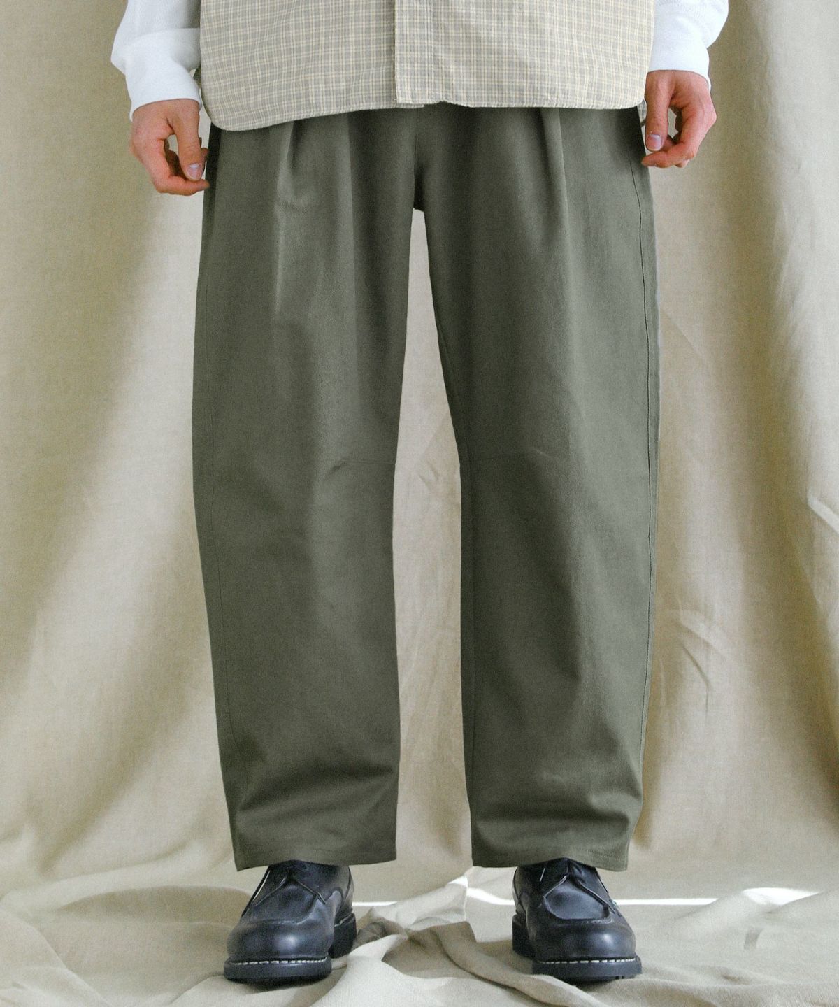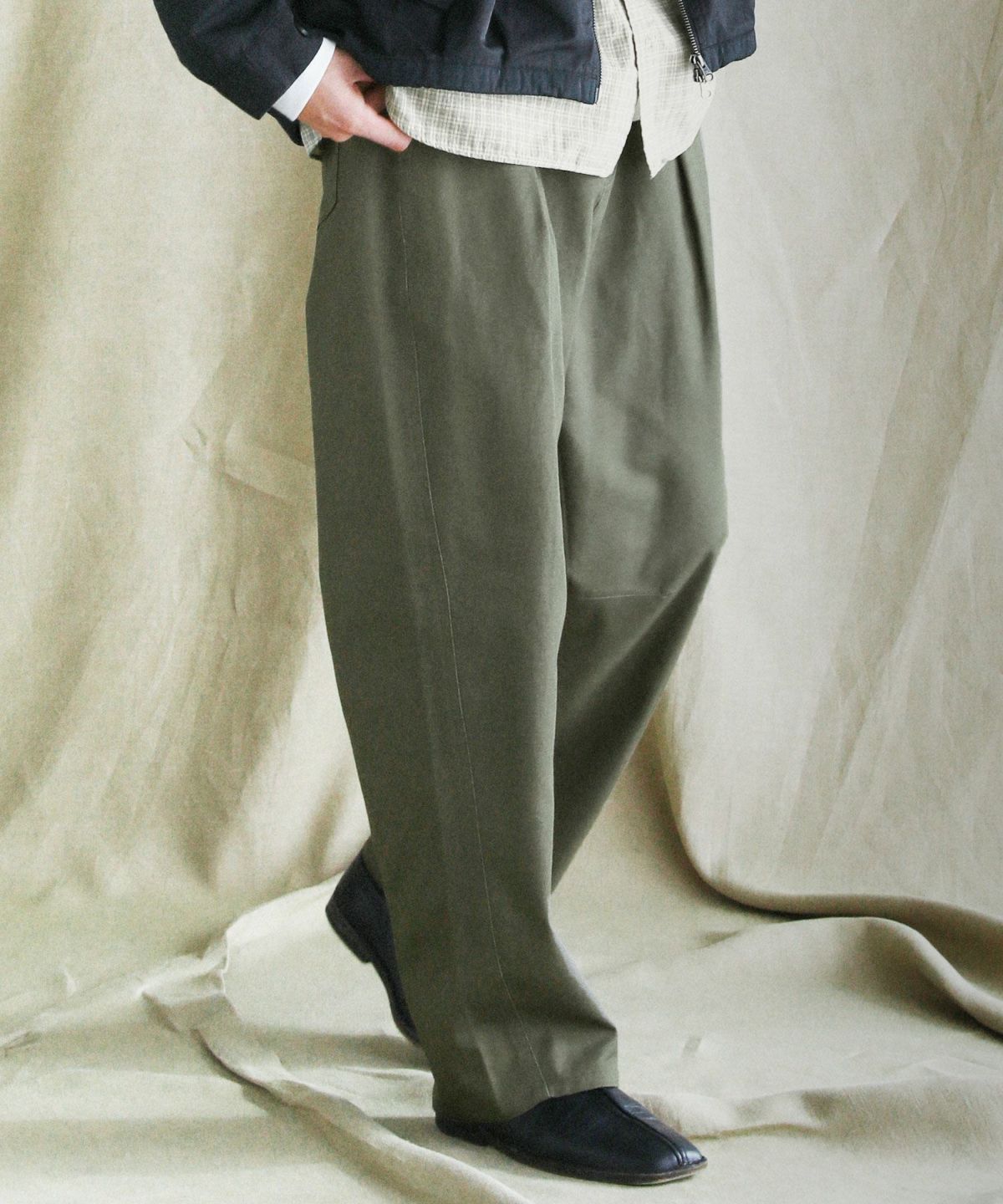 ヴィンテージ感のあるツイル生地を使用した日本製ワイドパンツ。