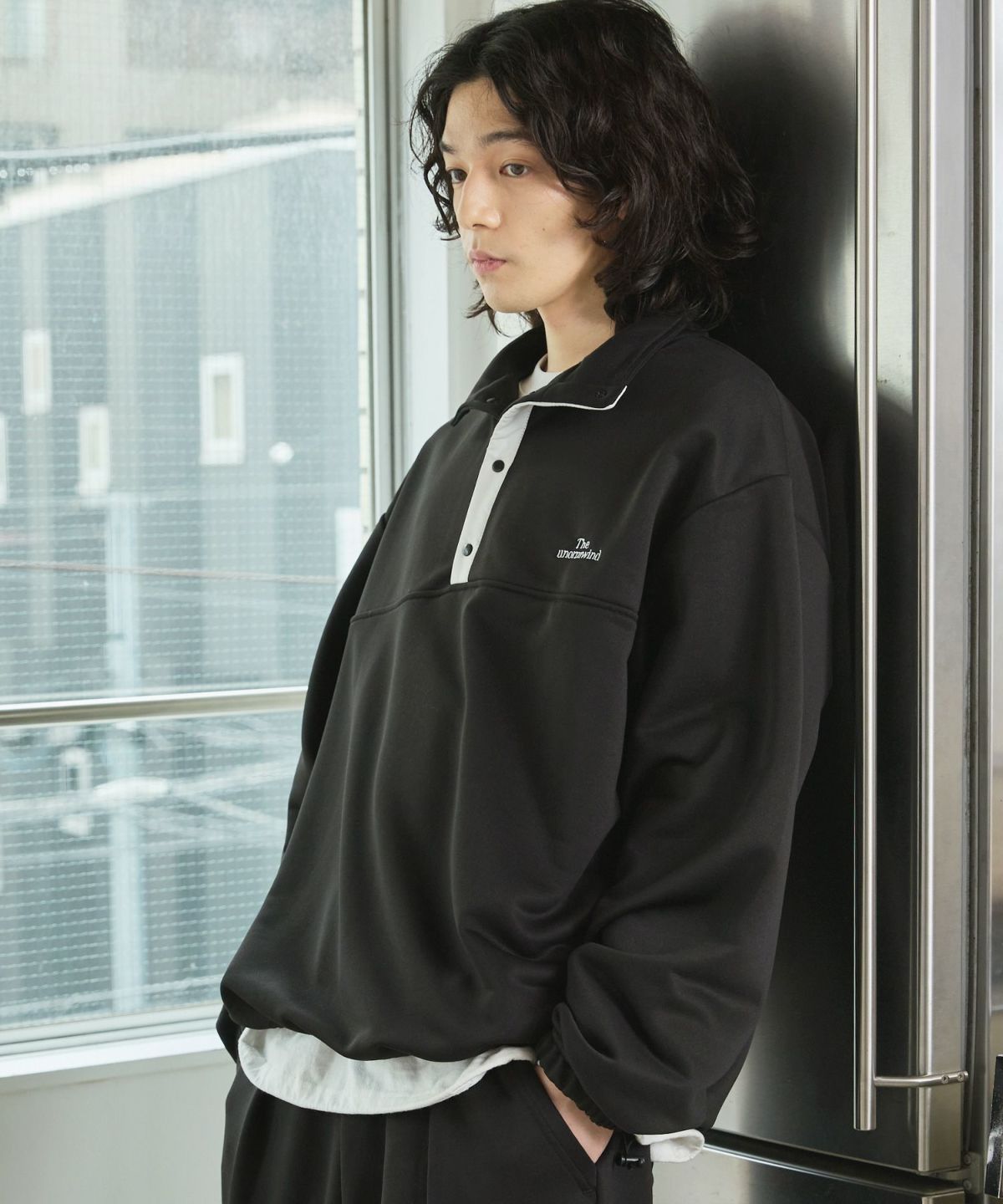 【セットアップ対応】ブランド刺繍ロゴ裾ドローコードラグラン配色長袖ハーフボタンアーバンスウェット
